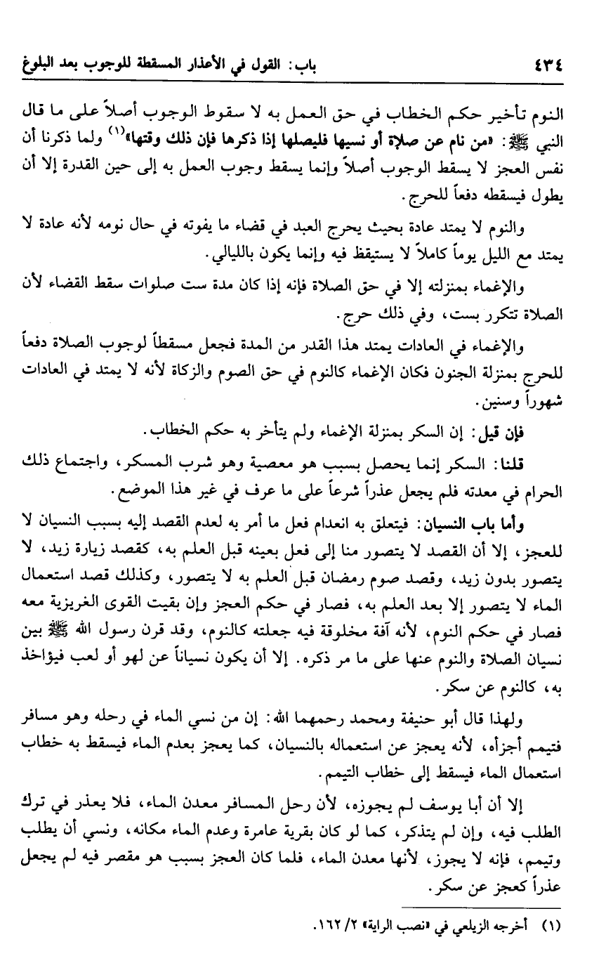 النوم تأخير حكم الخطاب في حق العمل به لا سقوط الوجوب أصلاً على ما قال النبي صلى الله عليه وسلم:"من نام عن صلاة أو نسيها فليصليها إذا ذكرها فإن ذلك وقتها"ولما ذكرنا أن نفس العجز لا يسقط الوجوب أصلاً وإنما يسقط وجوب العمل به إلى حين القدرة إلا أن يطول فيسقطه دفعاً للحرج.