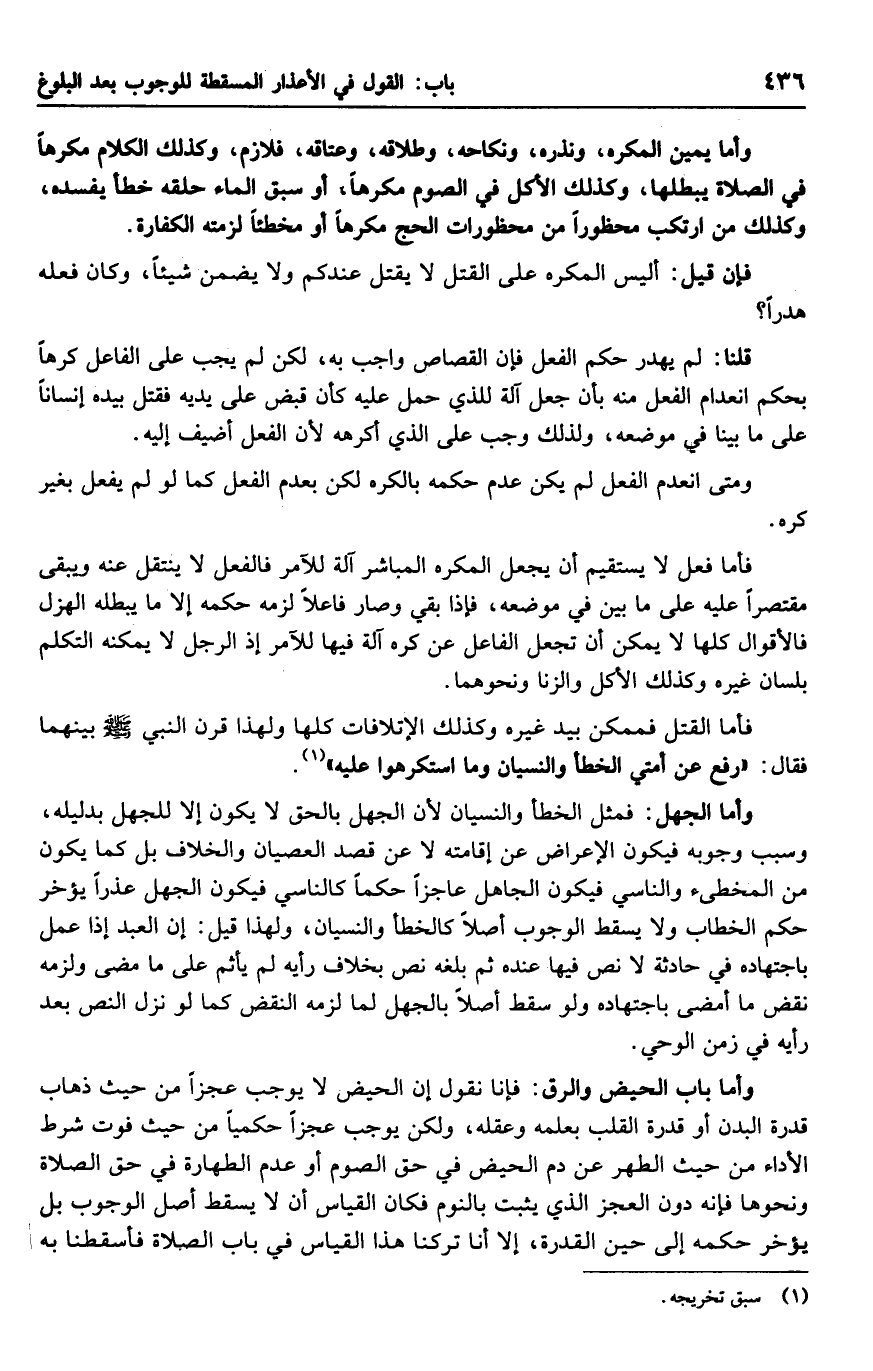 وأما باب الحيض والرق: فإنا نقول إن الحيض لا يوجب عجزاً من حيث ذهاب قدرة البدن أو قدرة القلب بعلمه وعقله، ولكن يوجب عجزاً حكمياً من حيث فوت شرط الأداء من حيث الظهر عن دم الحيض في حق الصوم أو عدم الطهارة في حق الصلاة ونحوها فإنه دون العجز الذي يثبت بالنوم فكان القياس أن لا يسقط أصل الوجوب بل يؤخر حكمه إلى حين القدرة، إلا أنا تركنا هذا القياس في باب الصلاة فأسقطنا به