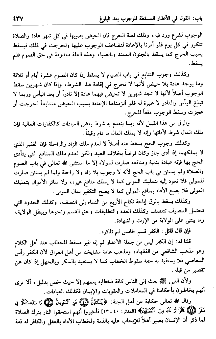 وقال الله تعالى حكاية عن أهل الجنة: {يتساءلون عن المجرمين ما سلككم في سقر قالوا لم نك من المصلين} فأخبروا أنهم استحقوا النار بترك الصلاة لما ذكر أن الإنسان يصير أهلاً للإيجاب عليه بالذمة ولخطاب الأداء بالعقل والكافر له ذمة