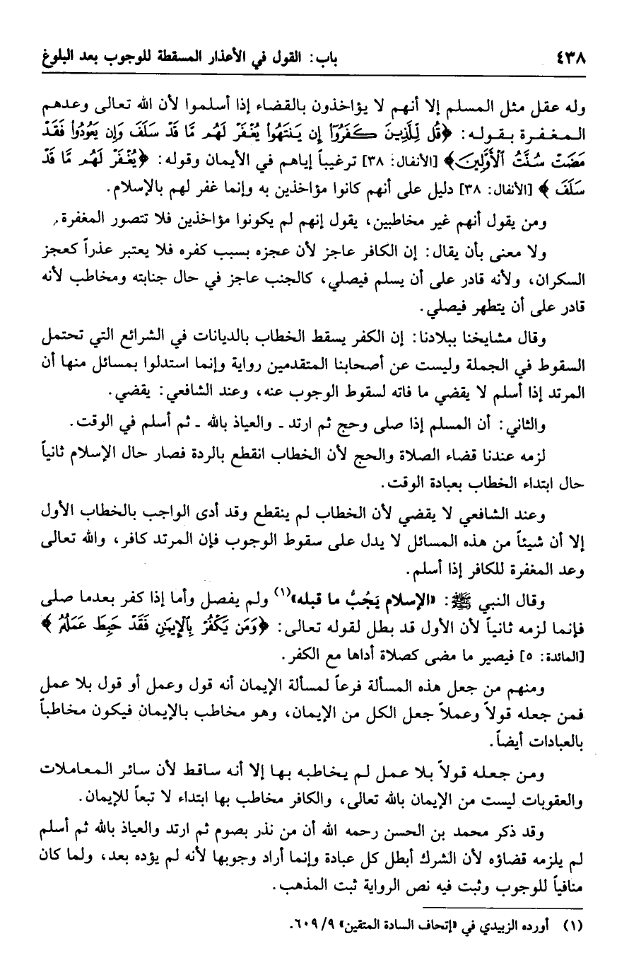 وقال مشايخنا ببلادنا: إن الكفر يسقط الخطاب بالديانات في الشرائع التي تحتمل السقوط في الجملة وليست عن أصحابنا المتقدمين رواية وإنما استدلوا بمسائل منها أن المرتد إذا أسلم لا يقضي ما فاته لسقوط الوجوب عنه، وعند الشافعي: يقضي.