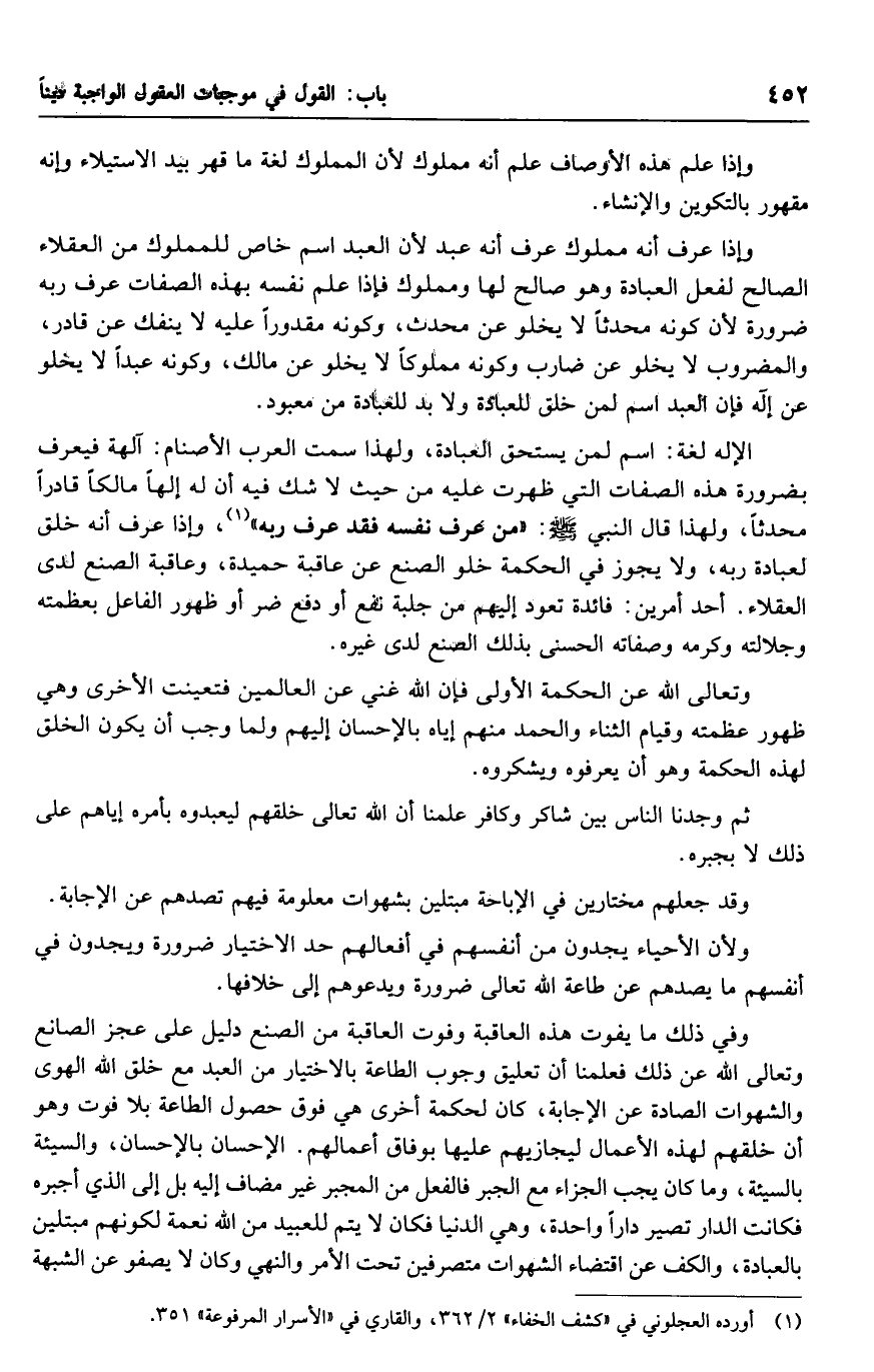 وإذا عرف أنه مملوك عرف أنه عبد لأن العبد اسم خاص للملوك من العقلاء الصالح لفعل العبادة وهو صالح لها ومملوك فإذا علم نفسه بهذه الصفات عرف ربه ضرورة لأن كونه محدثاً لا يخلو عن محدث، وكونه مقدوراً عليه لا ينفك عن قادر، والمضروب لا يخلو عن ضارب وكونه مملوكاً لا يخلو عن مالك، وكونه عبداً لا يخلو عن إله العبد اسم لمن خلق للعابد ولا بد للعباد من معبود.