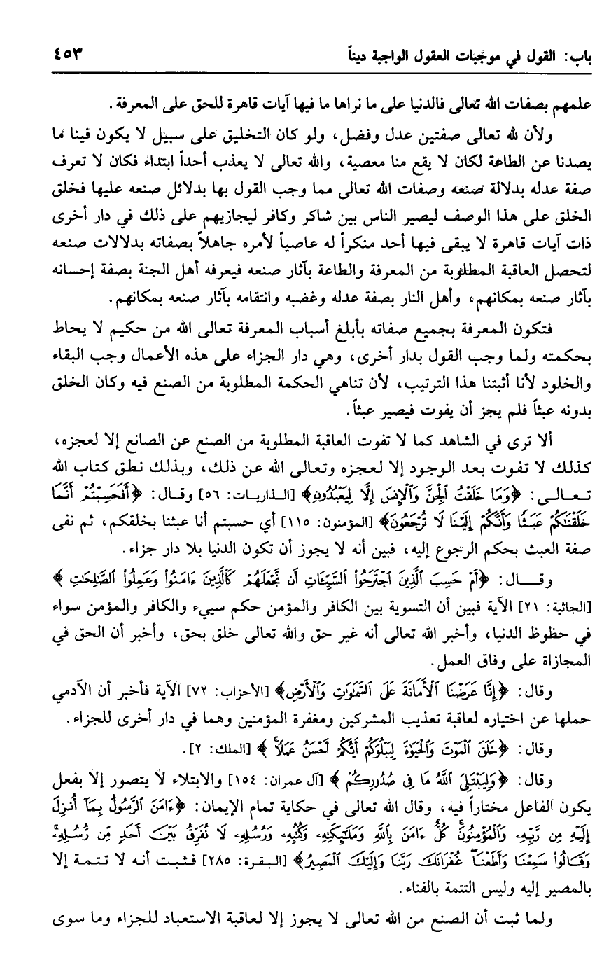 ألا ترى في الشاهد كما لا تفوت العاقبة المطلوبة من الصنع عن الصانع إلا لعجزه، كذلك لا تفوت بعد الوجود إلا لعجزه وتعالى الله عن ذلك، وبذلك نطق كتاب الله تعالى: {وما خلقت الجن والإنس إلا ليعبدون} وقال: {أفحسبتم أنما خلقناكم عبثاً وأنكم إلينا لا ترجعون} أي حسبتم أنا عبثنا بخلقكم، ثم نفى صفة العبث بحكم الرجوع إليه، فبين أنه لا يجوز أن تكون الدنيا بلا دار جزاء.