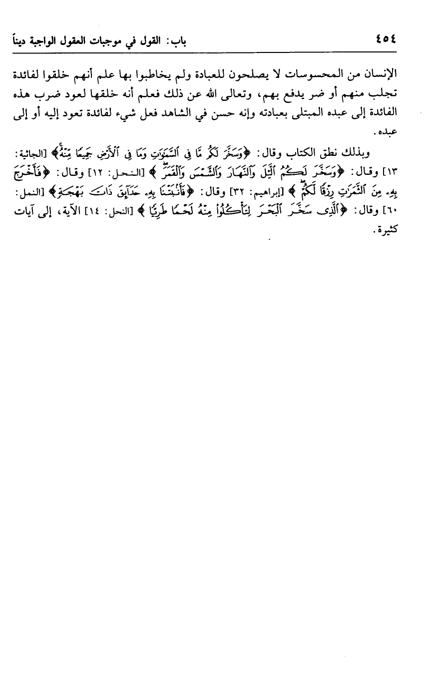 وبذلك نطق الكتاب وقال: {وسخر لكم ما في السماوات وما في الأرض جميعاً منه} وقال: {وسخر لكم الليل والنهار والشمس والقمر} وقال: {فأخرج به من الثمرات رزقاً لكم} وقال: {فأنبتنا به حدائق ذات بهجة} وقال: {الذي سخر البحر لتأكلوا منه لحماً طرياً} الآية، إلى آيات كثيرة.