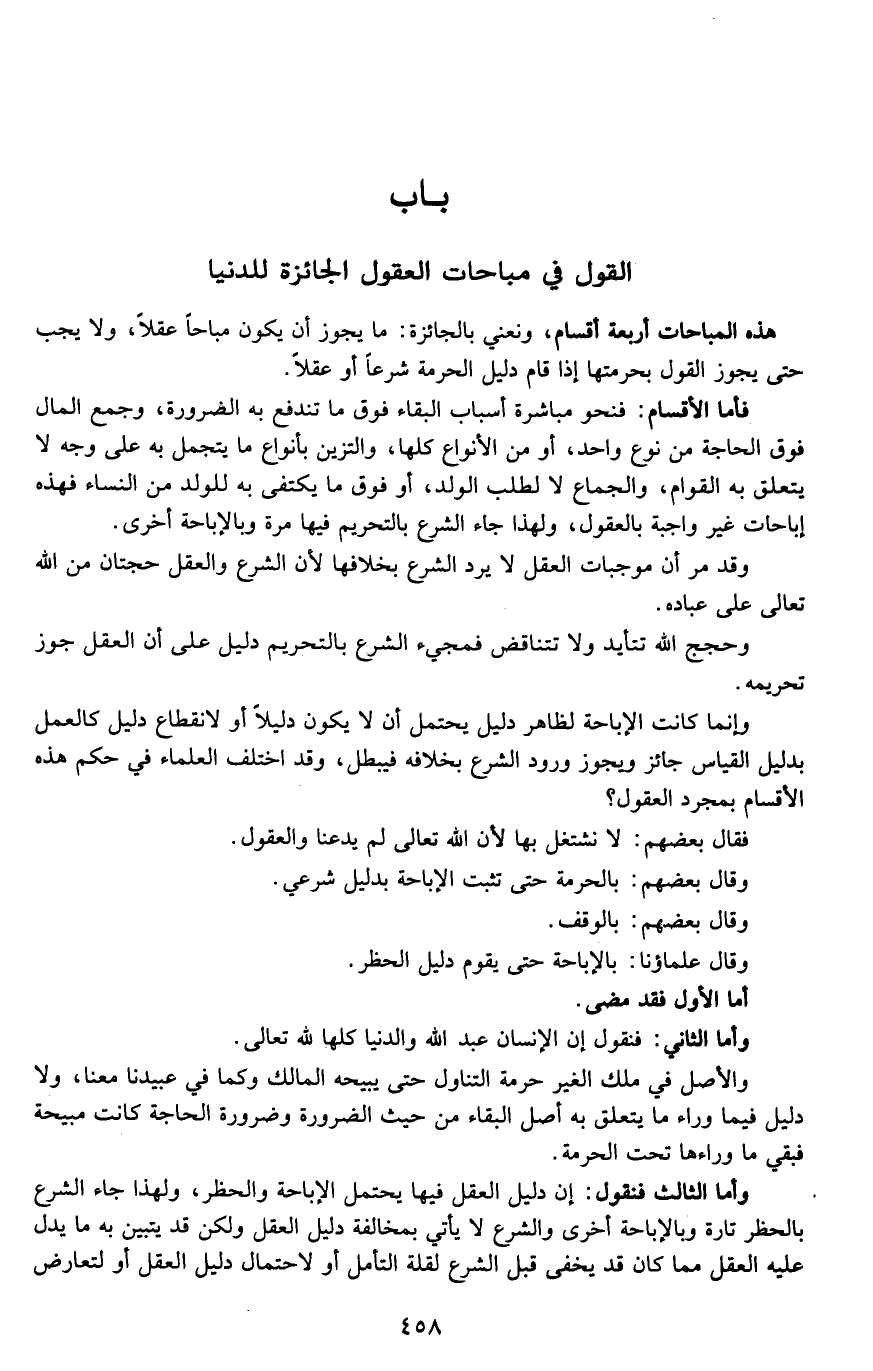 هذه المباحات أربعة أقسام، ونعني بالجائزة: ما يجوز أن يكون مباحاً عقلاً، ولا يجب حتى يجوز القول بحرمتها إذا قام دليل الحرمة شرعاً أو عقلاً.
