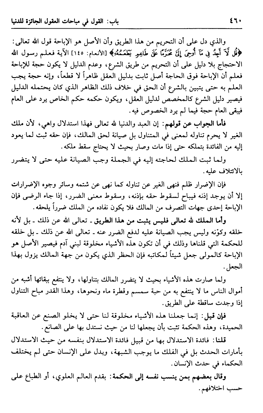 والذي دل على أن التحريم من هذا الطريق وأن الأصل هو الإباحة قول الله تعالى: {قل لا أجد في ما أوحى إلى محرماً على طاعم يطعمه} الآية فعلم رسول الله الاحتجاج بلا دليل على أن التحريم من طريق الشرع، وعدم الدليل لا يكون حجة للإباحة فعلم أن الإباحة فوق الحاجة أصل ثابت بدليل العقل ظاهرًا لا قطعًا، وإنه حجة يجب العلم به حتى يتبين بالشرع أن الحق في خلاف ذلك الظاهر الذي كان يحتمله الدليل فيصير دليل الشرع كالمخصص لدليل العقل، ويكون حكمه حكم الخاص يرد على العام فيبقى العام حجة فيما لم يرد الخصوص فيه.