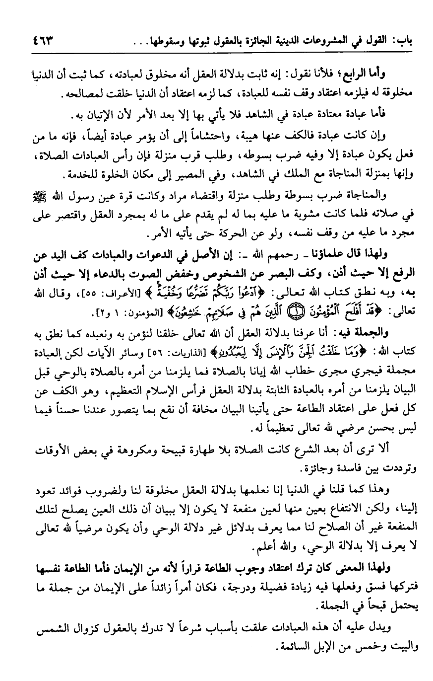 والجملة فيه: أنا عرفنا بدلالة العقل أن الله تعالى خلقنا لنؤمن به ونعبده كما نطق به كتاب الله: {وما خلقت الجن والإنس إلا ليعبدون} وسائر الآيات لكن العبادة مجملة فيجري مجرى خطاب الله إيانا بالصلاة فما يلزمنا من أمره بالصلاة بالوحي قبل البيان يلزمنا من أمره بالعبادة الثابتة بدلالة العقل فرأس الإسلام التعظيم، وهو الكف عن كل فعل على اعتقاد الطاعة حتى يأتينا البيان مخافة أن نقع بما يتصور عندنا حسناً فيما ليس بحسن مرضي لله تعالى تعظيماً له.