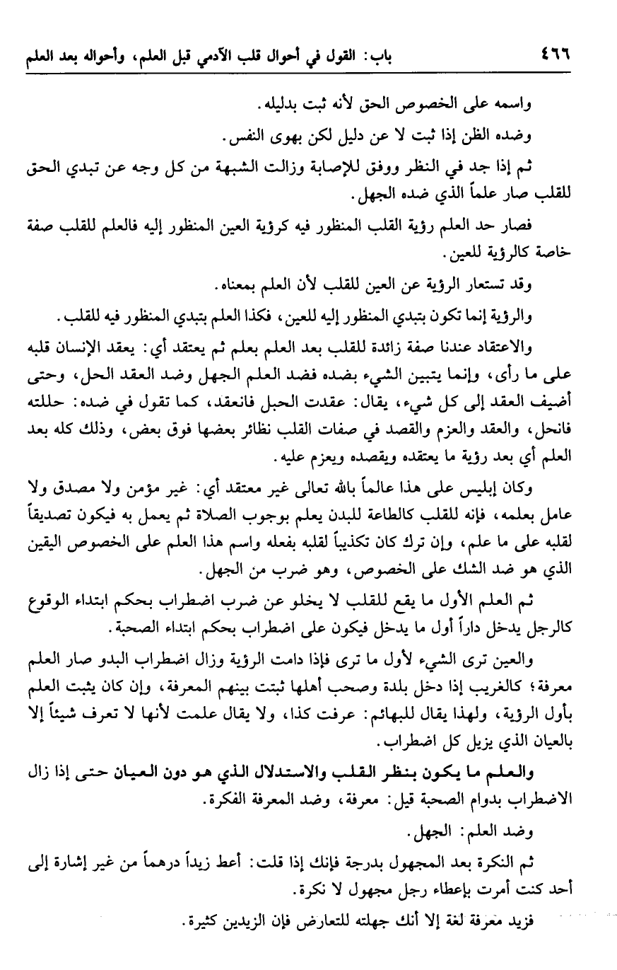 فصار حد العلم رؤية القلب المنظور فيه كرؤية العين المنظور إليه فالعلم للقلب صفة خاصة كالرؤية للعين.