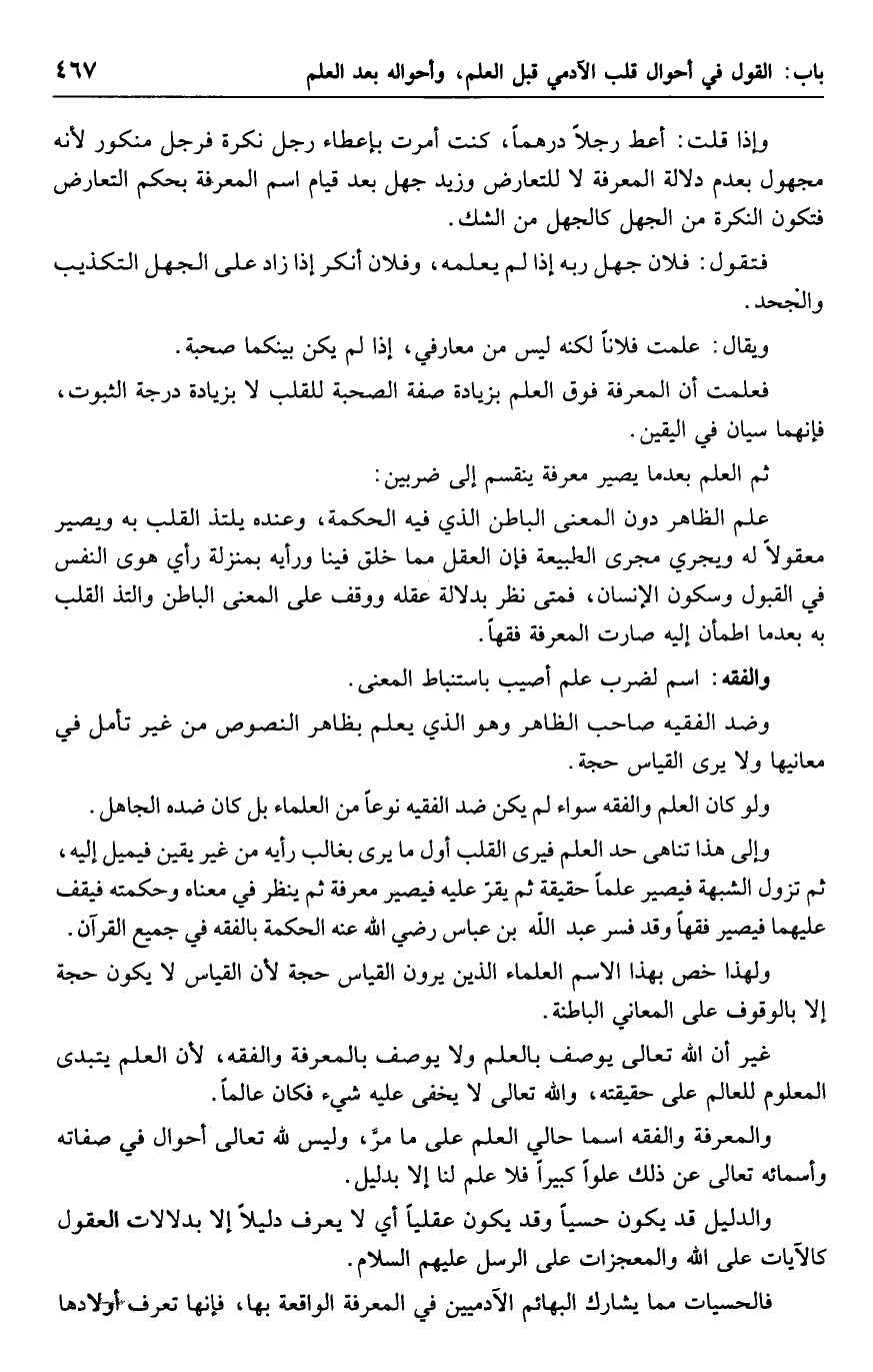 وإلى هذه تناهى حد العلم فيرى القلب أول ما يرى بغالب رأيه من غير يقين فيميل إليه، ثم تزول الشبهة فيصير علماً حقيقة ثم يقر عليه فيصير معرفة ثم ينظر في معناه وحكمته فيقف عليهما فيصير فقهاً وقد فسر عبد الله بن عباس رضي الله عنه الحكمة بالفقه في جميع القرآن.