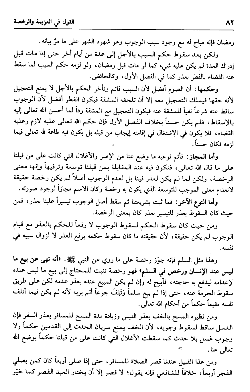 ومن حيث كان سقوط الحكم لسقوط الوجوب لا رفعًا للحكم بالعذر مع قيام الوجوب لم يكن حقيقة، لأن حقيقته ما كان سقوط حكمه برفع العذر لا لزوال سببه في نفسه.