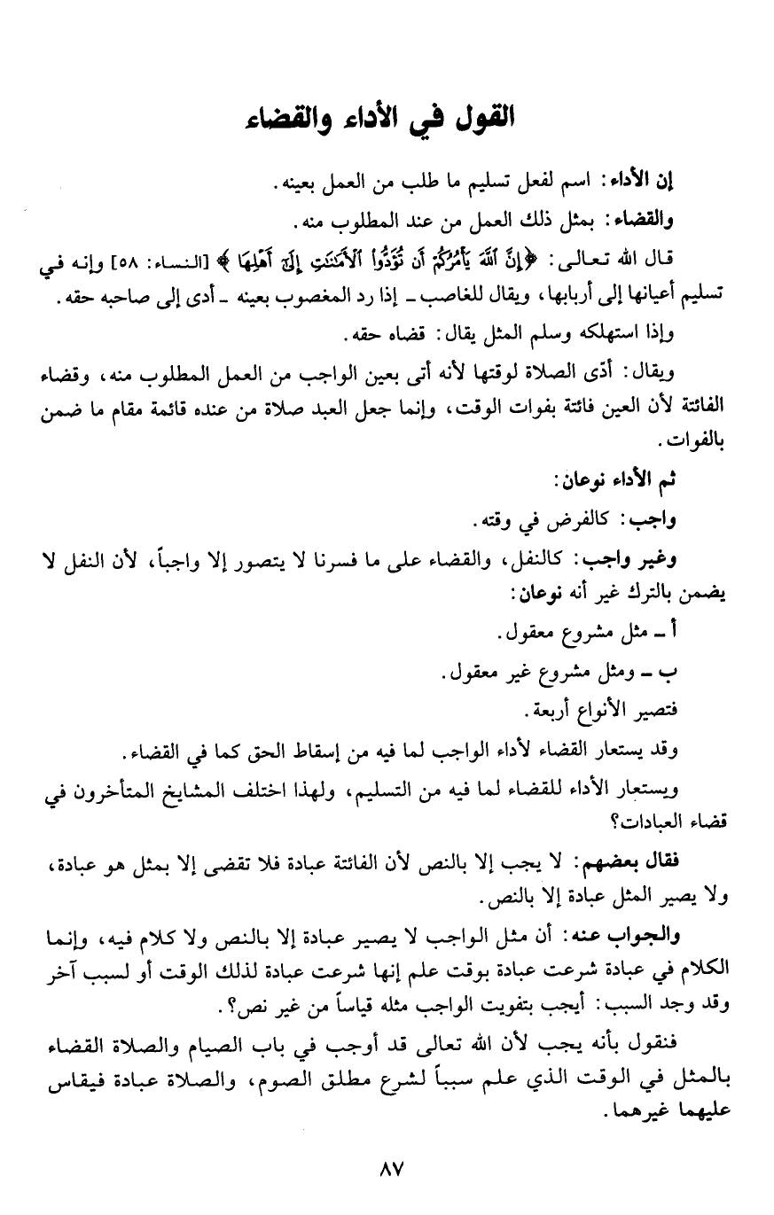 ويقال: أدى الصلاة لوقتها لأنه أتى بعين الواجب من العمل المطلوب منه، وقضاء الفائتة لأن العين فائتة بفوات الوقت، وإنما جعل العبد صلاة من عنده قائمة مقام ما ضمن بالفوات.