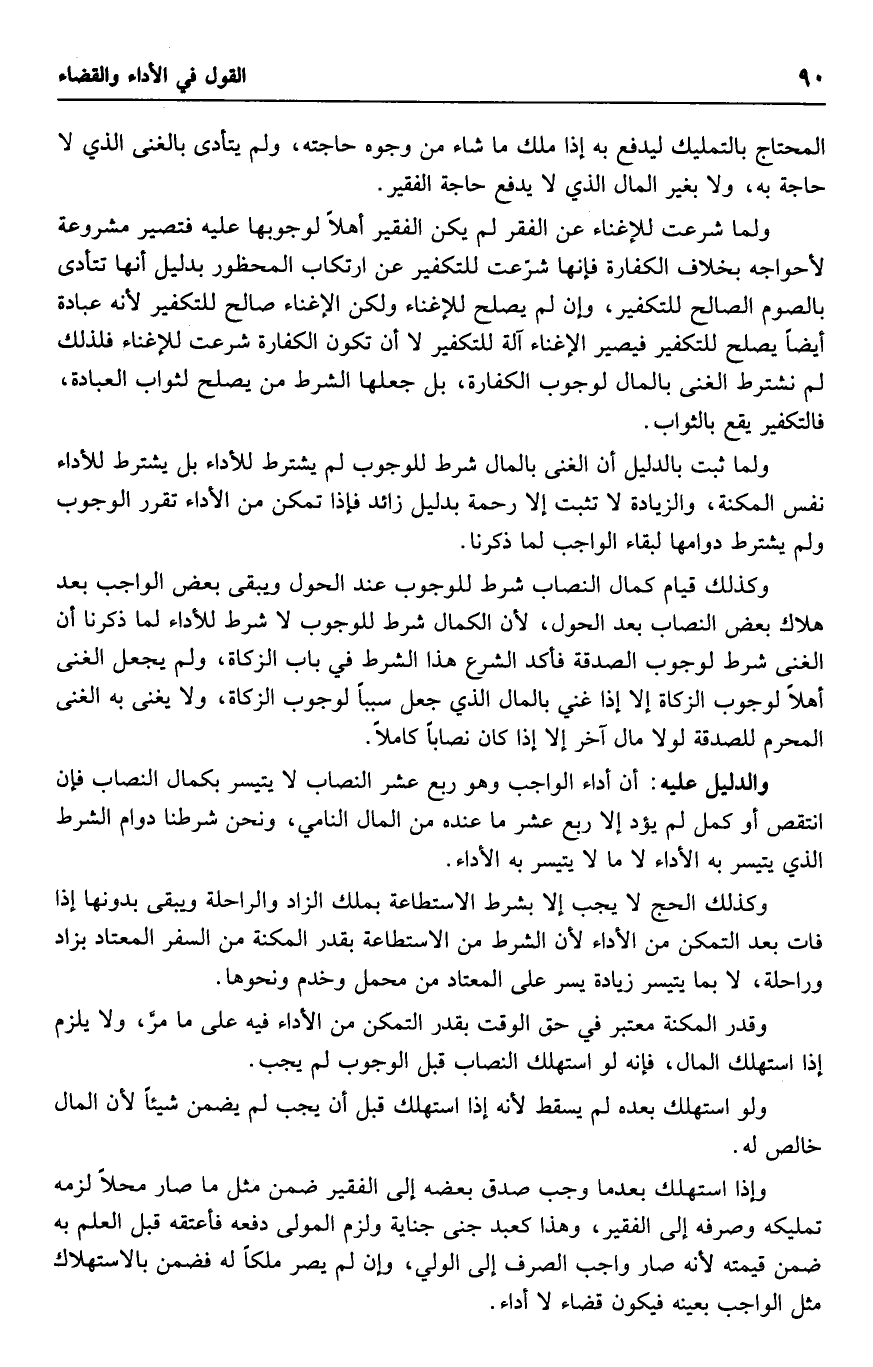 وكذلك قيام كمال النصاب شرط للوجوب عند الحول ويبقى بعض الواجب بعد هلاك بعض النصاب بعد الحول، لأن الكمال شرط للوجوب لا شرط للأداء لما ذكرنا أن الغنى شرط لوجوب الصدقة فأكد الشرع هذا الشرط في باب الزكاة، ولم يجعل الغنى أهلاً لوجوب الزكاة إلا إذا غني بالمال الذي جعل سببا لوجوب الزكاة، ولا يغنى به الغنى المحرم للصدقة لولا مال آخر إلا إذا كان نصاباً كاملاً.
