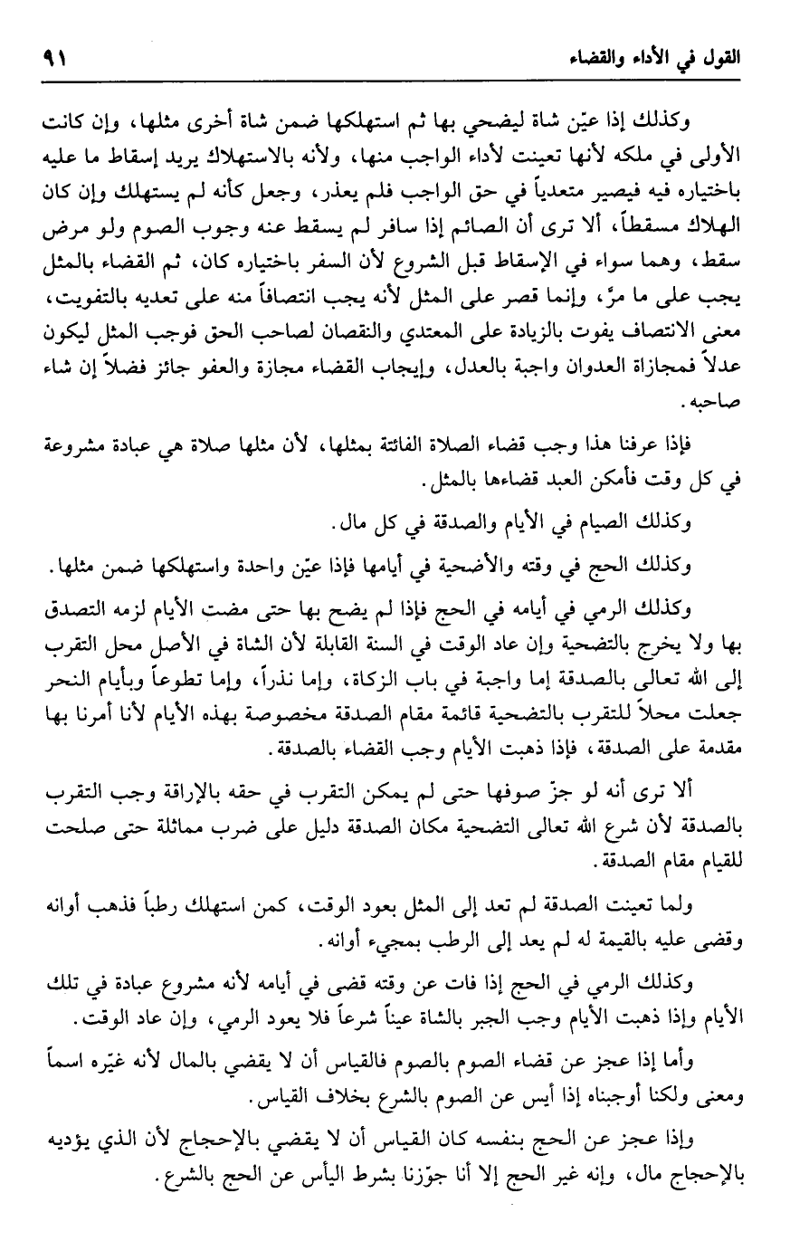 وكذلك الرمي في أيامه في الحج فإذا لم يضح بها حتى مضت الأيام لزمه التصدق بها ولا يخرج بالتضحية وإن عاد الوقت في السنة القابلة لأن الشاة في الأصل محل التقرب إلى الله تعالى بالصدقة إما واجبة في باب الزكاة، وإما نذراً، وإما تطوعاً وبأيام النحر جعلت محلاً للتقرب بالتضحية قائمة مقام الصدقة مخصوصة بهذه الأيام لأنا أمرنا بها مقدمة على الصدقة، فإذا ذهبت الأيام وجب القضاء بالصدقة.