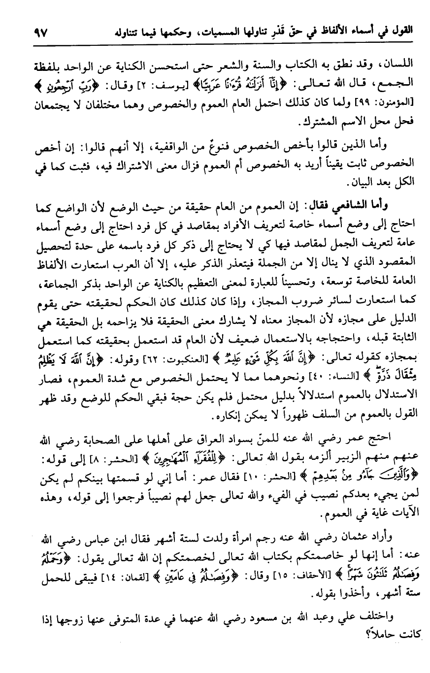 وأما الشافعي فقال: إن العموم من العام حقيقة من حيث الوضع لأن الواضع كما احتاج إلى وضع أسماء خاصة لتعريف الأفراد بمقاصد في كل فرد احتاج إلى وضع أسماء عامة لتعريف الجمل لمقاصد فيها كي لا يحتاج إلى ذكر كل فرد باسمه على حدة لتحصيل المقصود الذي لا ينال إلا من الجملة فيتعذر الذكر عليه، إلا أن العرب استعارت الألفاظ العامة للخاصة توسعة، وتحسيناً للعبارة لمعنى التعظيم بالكناية عن الواحد بذكر الجماعة، كما استعارت لسائر ضروب المجاز، وإذا كان كذلك كان الحكم لحقيقته حتى يقوم الدليل على مجازه لأن المجاز معناه لا يشارك معنى الحقيقة فلا يزاحمه بل الحقيقة هي الثانية قبله، واحتجاجه بالاستعمال ضعيف لأن العام قد استعمل بحقيقته كما استعمل بمجازه كقوله تعالى: {إن الله بكل شيء عليم} وقوله: {إن الله لا يظلم مثقال ذرة} ونحوهما مما لا يحتمل الخصوص مع شدة العموم، فصار الاستدلال بالعموم استدلالاً بدليل محتمل فلم يكن حجة فبقي الحكم للوضع وقد ظهر القول بالعموم من السلف ظهوراً لا يمكن إنكاره.