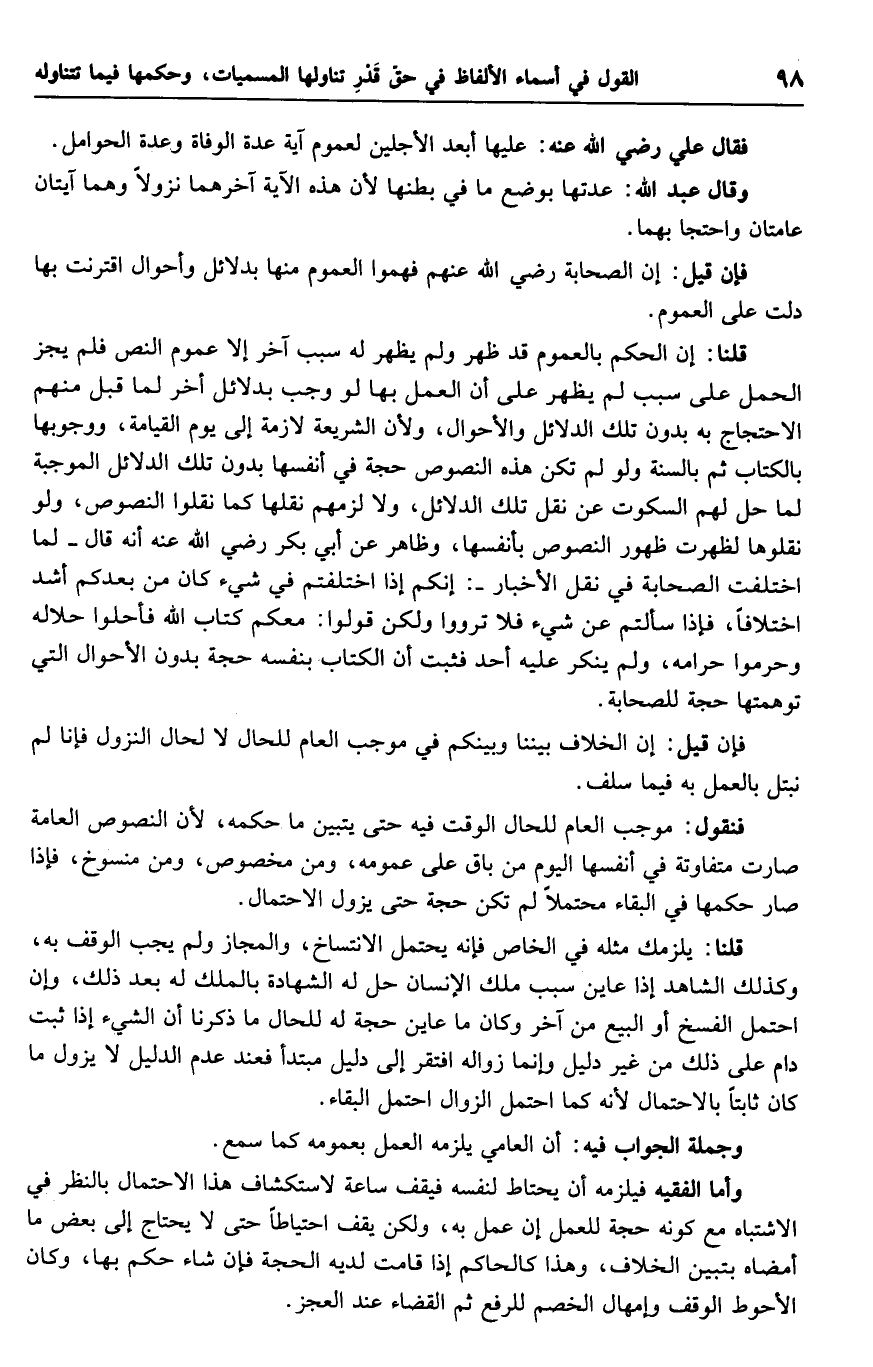 فنقول: موجب العام للحال الوقت فيه حتى يتبين ما حكمه، لأن النصوص العامة صارت متفاوتة في أنفسها اليوم من باق على عمومه، ومن مخصوص، ومن منسوخ، فإذا صار حكمها في البقاء محتملاً لم تكن حجة حتى يزول الاحتمال.