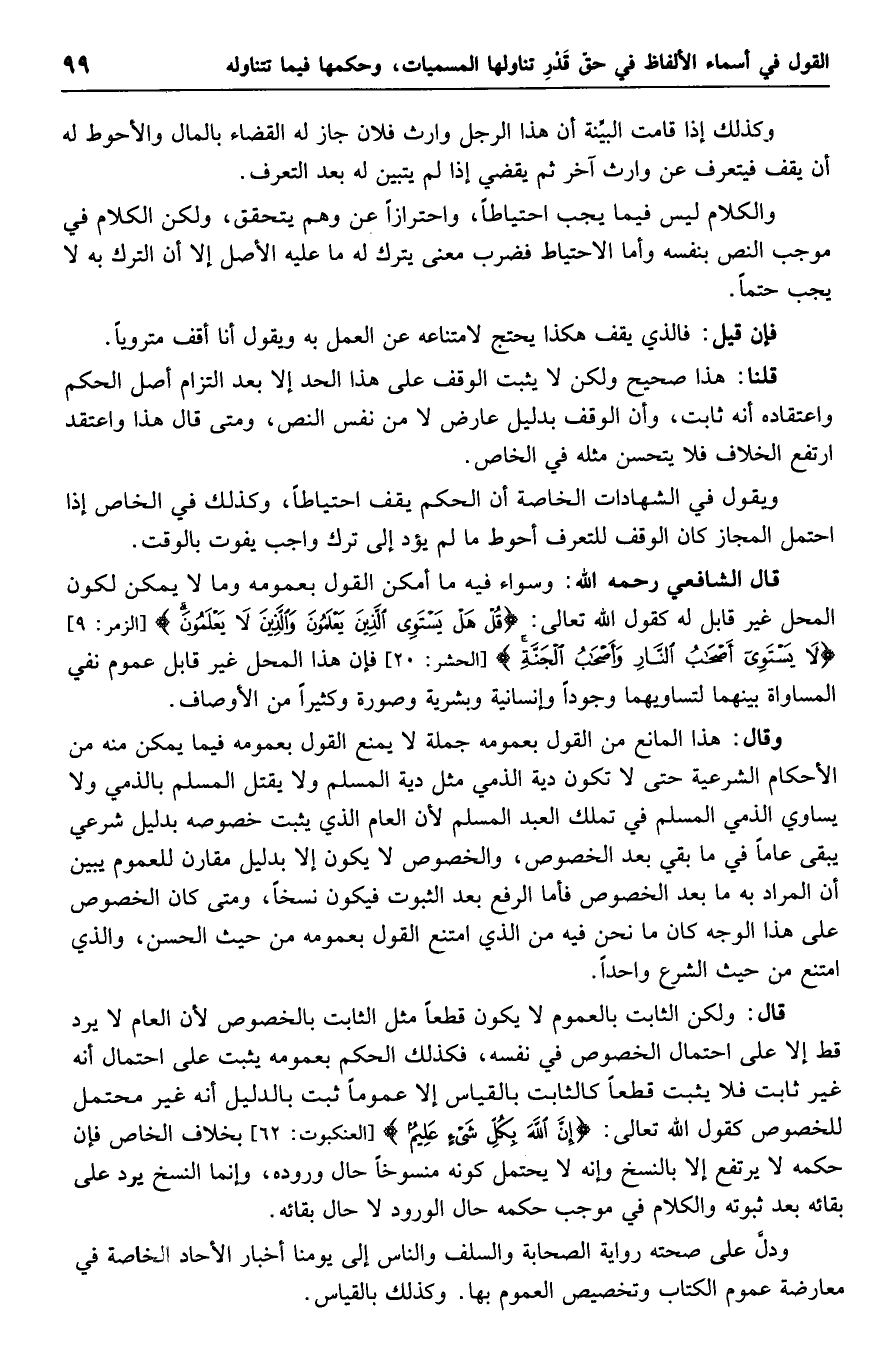والكلام ليس فيما يجب احتياطاً، واحترازاً عن وهم يتحقق، ولكن الكلام في موجب النص بنفسه وأما الاحتياط فضرب معنى يترك له ما عليه الأصل إلا أن الترك به لا يجب حتماً.
