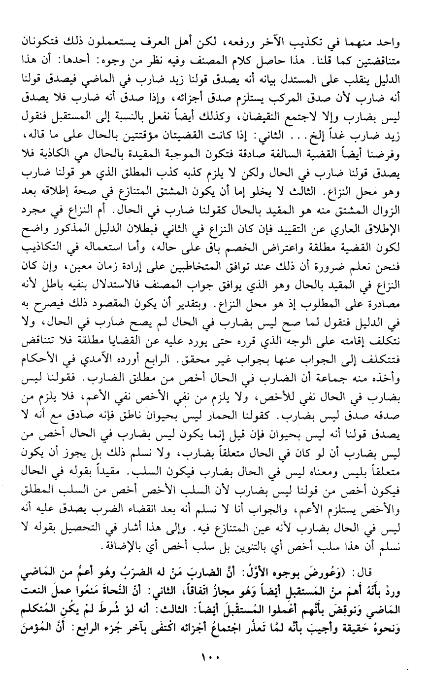 واحد منهما في تكذيب الآخر ورفعه، لكن أهل العرف يستعملون ذلك فتكونان متناقضتين كما قلنا. هذا حاصل كلام المصنف وفيه نظر من وجوه, أحدها: أن هذا الدليل ينقلب على المستدل, بيانه أنه يصدق قولنا: زيد ضارب في الماضي فيصدق قولنا: إنه ضارب؛ لأن صدق المركب يستلزم صدق أجزائه, وإذا صدق أنه ضارب فلا يصدق ليس بضارب وإلا لاجتمع النقيضان، وكذلك أيضا تفعل بالنسبة إلى المستقبل فنقول: زيد ضارب غدا ... إلخ. الثاني: إذا كانت القضيتان مؤقتتين بالحال على ما قاله، وفرضنا أيضا القضية السالفة صادقة فتكون الموجبة المقيدة بالحال هي الكاذبة فلا يصدق قولنا: ضارب في الحال ولكن لا يلزم كذبه كذب المطلق الذي هو قولنا: ضارب وهو محل النزاع. الثالث: لا يخلو إما أن يكون المشتق المتنازع في صحة إطلاقه بعد الزوال المشتق منه هو المقيد بالحال كقولنا: ضارب في الحال، أم النزاع في مجرد الإطلاق العاري عن التقييد, فإن كان النزاع في الثاني, فبطلان الدليل المذكور واضح لكون القضية مطلقة واعتراض الخصم باق على حاله، وأما استعماله في التكاذيب فنحن نعلم ضرورة أن ذلك عند توافق المتخاطبين على إرادة زمان معين، وإن كان النزاع في المقيد بالحال وهو الذي يوافق جواب المصنف, فالاستدلال بنفيه باطل؛ لأنه مصادرة على المطلوب إذ هو محل النزاع. وبتقدير أن يكون المقصود ذلك فيصرح به في الدليل فنقول: لما صح ليس بضارب في الحال لم يصح ضارب في الحال, ولا نتكلف إقامته على الوجه الذي قرره حتى يورد عليه عن القضايا مطلقة فلا تتناقض فتتكلف إلى الجواب عنها بجواب غير محقق. الرابع أورده الآمدي في الأحكام وأخذه منه جماعة: أن الضارب في الحال أخص من مطلق الضارب, فقولنا: ليس بضارب في الحال نفي للأخص، ولا يلزم من نفي الأخص نفي الأعم, فلا يلزم من صدقه صدق ليس بضارب، كقولنا: الحمار ليس بحيوان ناطق فإنه صادق مع أنه لا يصدق قولنا: إنه ليس بحيوان فإن قيل: إنما يكون ليس بضارب في الحال أخص من ليس بضارب أن لو كان في الحال متعلقا بضارب، ولا نسلم ذلك بل يجوز أن يكون متعلقا بليس ومعناه: ليس في الحال بضارب فيكون السلب مقيدا بقوله: في الحال فيكون أخص من قولنا: ليس بضارب؛ لأن السلب الأخص أخص من السلب المطلق والأخص يستلزم الأعم، والجواب: أنا لا نسلم أنه بعد انقضاء الضرب يصدق عليه أنه ليس في الحال بضارب؛ لأنه عين المتنازع فيه. وإلى هذا أشار في التحصيل بقوله: لا نسلم أن هذا سلب أخص أي: بالتنوين, بل سلب أخص أي: بالإضافة.