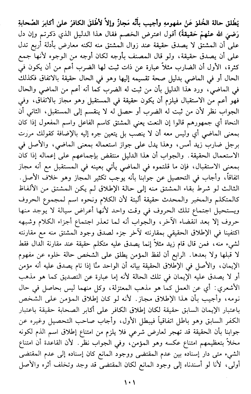يطلق حالة الخلو عن مفهومه, وأجيب بأنه مجاز وإلا لأطلق الكافر على أكابر الصحابة -رضي الله عنهم- حقيقة" أقول: اعترض الخصم فقال: هذا الدليل الذي ذكرتم وإن دل على أن المشتق لا يصدق حقيقة عند زوال المشتق منه, لكنه معارض بأدلة أربعة تدل على أن يصدق حقيقة، ولو قال المصنف بأوجه لكان أوجه من الوجوه؛ لأنها جمع كثرة، الأول: أن الضارب مثلا عبارة عن ذات ثبت لها الضرب أعم من أن يكون في الحال أو في الماضي بدليل صحة تقسيمه إليها, وهو في الحال حقيقة بالاتفاق فكذلك في الماضي، ورد هذا الدليل بأن من ثبت له الضرب كما أنه أعم من الماضي والحال فهو أعم من الاستقبال, فيلزم أن يكون حقيقة في المستقبل وهو مجاز بالاتفاق، وفي الجواب نظر لأن من ثبت له الضرب أو حصل له لا ينقسم إلى المستقبل. الثاني: أن النحاة أي: جمهورهم قالوا: إن النعت يعني المشتق كاسم الفاعل واسم المفعول إذا كان بمعنى الماضي أي: وليس معه أن لا ينصب بل يتعين جره إليه بالإضافة كقولك: مررت برجل ضارب زيد أمس، وهذا يدل على جواز استعماله بمعنى الماضي، والأصل في الاستعمال الحقيقة. والجواب أن هذا الدليل منتقض بإجماعهم على إعماله إذا كان بمعنى الاستقبال، فإن ما قلتموه في الماضي يأتي بعينه في المستقبل مع أنه مجاز اتفاقا، وأجاب في التحصيل عن جوابنا بأنه يوجب تكثير المجاز وهو خلاف الأصل. الثالث: لو شرط بقاء المشتق منه إلى حالة الإطلاق لم يكن المشتق من الألفاظ كالمتكلم والمخبر والمحدث حقيقة البتة؛ لأن الكلام ونحوه اسم لمجموع الحروف ويستحيل اجتماع تلك الحروف وفي وقت واحد؛ لأنها أعراض سيالة لا يوجد منها حروف إلا بعد انقضاء الآخر، والجواب: أنه لما تعذر اجتماع أجزاء الكلام وشبهه اكتفينا في الإطلاق الحقيقي بمقارنته لآخر جزء لصدق وجود المشتق منه مع مقارنته لشيء منه، فمن قال: قام زيد مثلا إنما يصدق عليه متكلم حقيقة عند مقارنة الدال فقط لا قبلها ولا بعدها. الرابع: أن لفظ المؤمن يطلق على الشخص حالة خلوه عن مفهوم الإيمان، والأصل في الإطلاق الحقيقة, بيانه: أن الواحد منا إذا نام يصدق عليه أنه مؤمن أو لا يصدق عليه الإيمان في تلك الحالة؛ لأنه إما عبارة عن التصديق كما هو مذهب الأشعري, أي: عن العمل كما هو مذهب المعتزلة، وكل منهما ليس بحاصل في حال نومه، وأجيب بأن هذا الإطلاق مجاز؛ لأنه لو كان إطلاق المؤمن على الشخص باعتبار الإيمان السابق حقيقة, لكان إطلاق الكافر على أكابر الصحابة حقيقة باعتبار الكفر السابق وهو باطل اتفاقيا فيبطل الأول، وأجاب صاحب التحصيل وغيره عن جوابنا بأن الحقيقة قد تهجر لعارض شرعي, فلا يلزم من امتناع إطلاق اسم الذم لكونه مخلا بتعظيمهم امتناع عكسه وهو المؤمن، وفي الجواب نظر؛ لأن القاعدة أن امتناع الشيء متى دار إسناده بين عدم المقتضى ووجود المانع كان إسناده إلى عدم المقتضى أولى؛ لأنا لو أسندناه إلى وجود المانع لكان المقتضى قد وجد وتخلف أثره والأصل عدمه، وعلى هذه القاعدة لا يصح جوابهم؛ لأن المصنف يدعي أن امتناع إطلاق الكافر لعدم المقتضى وهو وجود المشتق منه حالة الإطلاق، والمجيب يدعي أن امتناعه لوجود المانع فكان الأول أولى، وهذه القاعدة تنفع في كثير من المباحث.