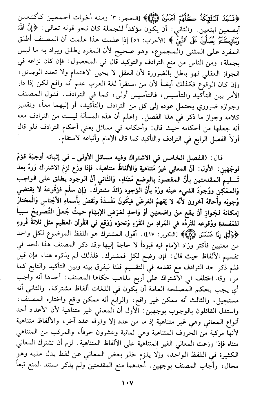 قال: "الفصل الخامس: في الاشتراك, وفيه مسائل: الأولى: في إثباته, أوجبه قوم لوجهين, الأول: أن المعاني غير متناهية والألفاظ متناهية، فإذا وزع لزم الاشتراك ورد بعد تسليم المقدمتين بأن المقصود بالوضع متناهٍ. والثاني: أن الوجود يطلق على الواجب والممكن, ووجود الشيء عينه, ورد بأن الوجود زائد مشترك, وإن سلم فوقوعه لا يقتضي وجوبه, وأحاله آخرون؛ لأنه لا يفهم الغرض فيكون مفسدة ونقص بأسماء الأجناس والمختار إمكانه لجواز أن يقع من واضعين أو واحد لغرض الإبهام حيث جعل التصريح سببا للمفسدة, ووقوعه للتردد في المراد من القرء ونحوه, ووقع في القرآن العظيم مثل ثلاثة قروء: {وَاللَّيْلِ إِذَا عَسْعَسَ} [التكوير: 17] " أقول: المشترك هو اللفظ الموضوع لكل واحد من معنيين فأكثر, وزاد الإمام فيه قيودا لا حاجة إليها, وقد ذكر المصنف هذا الحد في تقسيم الألفاظ حيث قال: فإن وضع لكل فمشترك؛ فلذلك لم يذكره هنا، فإن قيل: فلم ذكر حد الترادف مع تقدمه في التقسيم؟ قلنا: ليفرق بينه وبين التأكيد والتابع كما مر، وقد اختلف في الاشتراك على أربعة مذاهب حكاها المصنف, أحدها: أنه واجب أي: يجب بحكم المصلحة العامة أن يكون في اللغات ألفاظ مشتركة. والثاني: أنه مستحيل. والثالث: أنه ممكن غير واقع. والرابع: أنه ممكن واقع واختاره المصنف، واستدل القائلون بالوجوب بوجهين الأول: أن المعاني غير متناهية لأن الأعداد أحد أنواع المعاني وهي غير متناهية, إذ ما من عدد إلا وفوقه عدد آخر، والألفاظ متناهية؛ لأنها مركبة من الحروف المتناهية وهي ثمانية وعشرون حرفا، والمركب من المتناهي متناهٍ فإذا وزعت المعاني غير المتناهية على الألفاظ المتناهية, لزم أن تشترك المعاني الكثيرة في اللفظ الواحد، وإلا يلزم خلو بعض المعاني عن لفظ يدل عليه وهو محال، وأجاب المصنف بوجهين, أحدهما: منع المقدمتين ولم يذكر مستند المنع تبعا