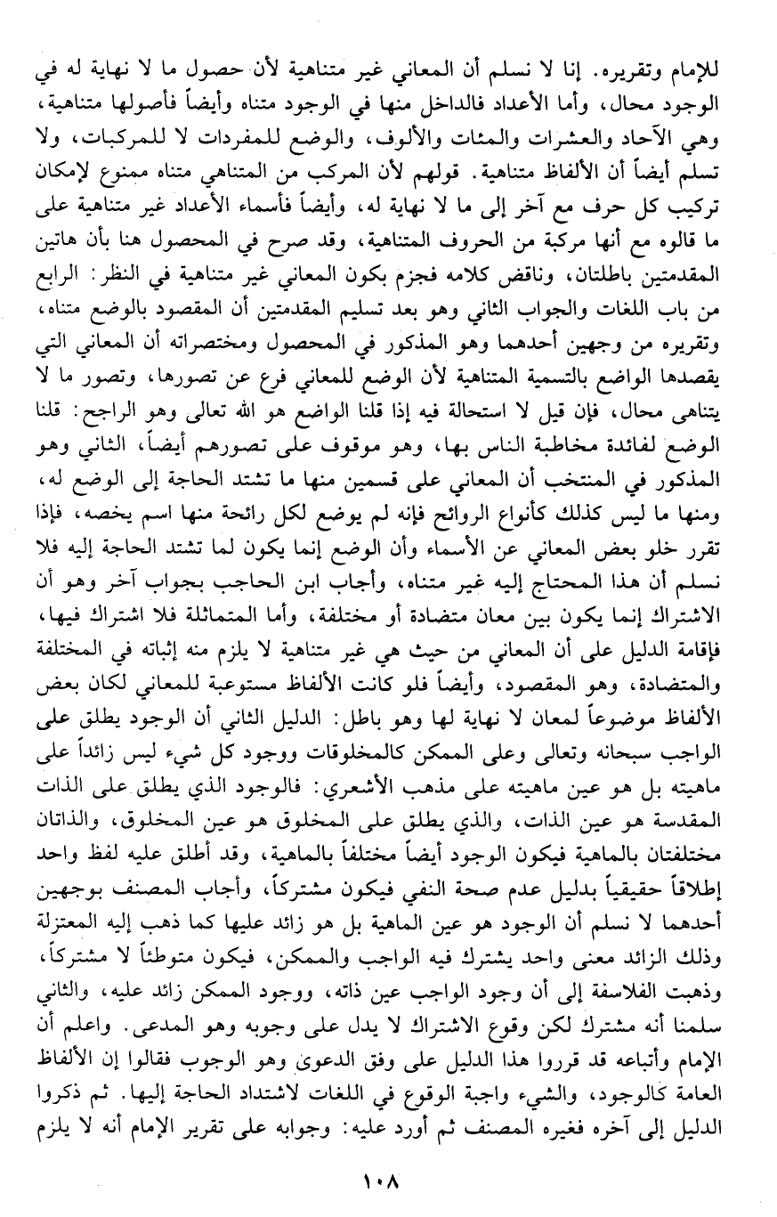 للإمام, وتقريره: أنا لا نسلم أن المعاني غير متناهية؛ لأن حصول ما لا نهاية له في الوجود محال، وأما الأعداد فالداخل منها في الوجود متناهٍ, وأيضا فأصولها متناهية، وهي الآحاد والعشرات والمئات والألوف، والوضع للمفردات لا للمركبات، ولا نسلم أيضا أن الألفاظ متناهية. قولهم: لأن المركب من المتناهي متناهٍ, ممنوع لإمكان تركيب كل حرف مع آخر إلى ما لا نهاية له, وأيضا فأسماء الأعداد غير متناهية على ما قالوه مع أنها مركبة من الحروف المتناهية، وقد صرح في المحصول هنا بأن هاتين المقدمتين باطلتان، وناقض كلامه فجزم بكون المعاني غير متناهية في النظر. الرابع: من باب اللغات والجواب الثاني وهو بعد تسليم المقدمتين: أن المقصود بالوضع متناهٍ، وتقريره من وجهين, أحدهما وهو المذكور في المحصول ومختصراته: أن المعاني التي يقصدها الواضع بالتسمية متناهية؛ لأن الوضع للمعاني فرع عن تصورها، وتصور ما لا يتناهى محال، فإن قيل: لا استحالة فيه إذا قلنا: الواضع هو الله تعالى وهو الراجح قلنا: الوضع لفائدة مخاطبة الناس بها، وهو موقوف على تصورهم أيضا، والثاني وهو المذكور في المنتخب: أن المعاني على قسمين, منها ما تشتد الحاجة إلى الوضع له، ومنها ما ليس كذلك كأنواع الروائح, فإنه لم يوضع لكل رائحة منها اسم يخصه، فإذا تقرر خلو بعض المعاني عن الأسماء وأن الوضع إنما يكون لما تشتد الحاجة إليه, فلا نسلم أن هذا المحتاج إليه غير متناهٍ، وأجاب ابن الحاجب بجواب آخر, وهو أن الاشتراك إنما يكون بين معانٍ متضادة أو مختلفة، وأما المتماثلة فلا اشتراك فيها, فإقامة الدليل على أن المعاني من حيث هي غير متناهية, لا يلزم منه إثباته في المختلفة والمتضادة، وهو المقصود، وأيضا فلو كانت الألفاظ مستوعبة للمعاني لكان بعض الألفاظ موضوعا لمعانٍ لا نهاية لها وهو باطل. الدليل الثاني: أن الوجود يطلق على الواجب سبحانه وتعالى, وعلى الممكن كالمخلوقات ووجود كل شيء ليس زائدا على ماهيته, بل هو عين ماهيته على مذهب الأشعري, فالوجود الذي يطلق على الذات المقدسة هو عين الذات، والذي يطلق على المخلوق هو عين المخلوق، والذاتان مختلفتان بالماهية فيكون الوجود أيضا مختلفا بالماهية، وقد أطلق عليه لفظ واحد إطلاقا حقيقيا بدليل عدم صحة النفي فيكون مشتركا، وأجاب المصنف بوجهين أحدهما: لا نسلم أن الوجود هو عين الماهية بل هو زائد عليها كما ذهب إليه المعتزلة, وذلك الزائد معنى واحد يشترك فيه الواجب والممكن، فيكون متواطئا لا مشتركا، وذهبت الفلاسفة إلى أن وجود الواجب عين ذاته، ووجود الممكن زائد عليه. والثاني: سلمنا أنه مشترك لكن وقوع الاشتراك لا يدل على وجوبه وهو المدعى. واعلم أن الإمام وأتباعه قد قرروا هذا الدليل على وفق الدعوى وهو الوجوب فقالوا: إن الألفاظ العامة كالوجود والشيء, واجبة الوقوع في اللغات لاشتداد الحاجة إليها, ثم ذكروا الدليل إلى آخره فغيره المصنف, ثم أورد عليه: وجوابه على تقرير الإمام أنه لا يلزم