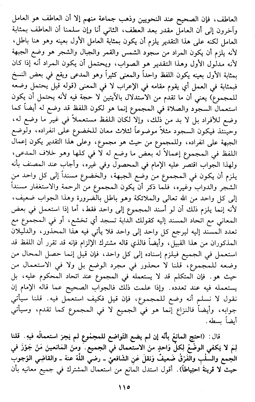 قال: " احتج المانع بأنه إن لم يضع التواضع للمجموع لم يجز استعماله فيه. قلنا: لم لا يكفي الوضع لكل واحد من الاستعمال في الجميع؟ ومن المانعين من جوز في الجمع والسلب والفرق ضعيف, ونقل عن الشافعي -رضي الله عنه- والقاضي الوجوب حيث لا قرينة احتياطا". أقول: استدل المانع من استعمال المشترك في جميع معانيه بأن