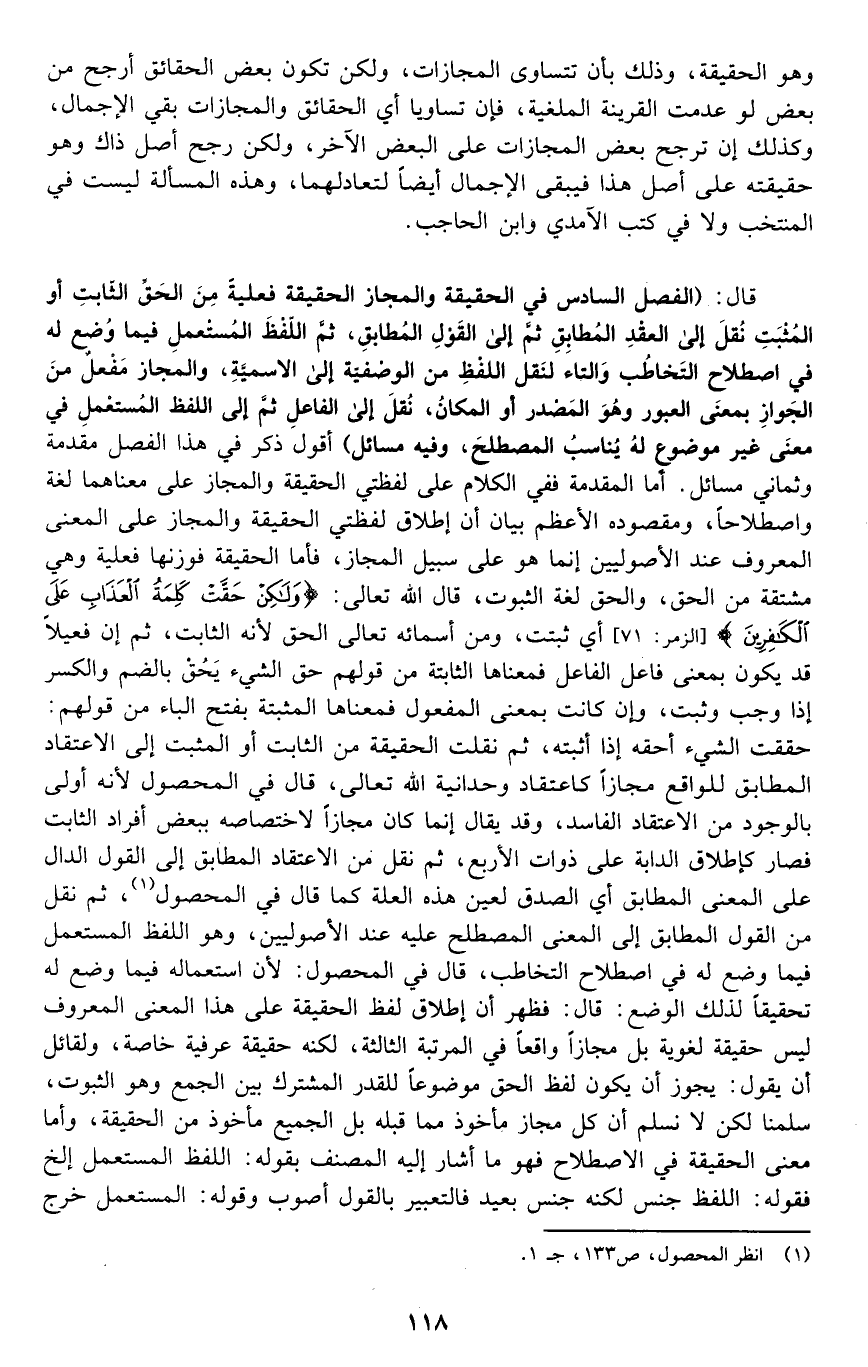 قال: "الفصل السادس: في الحقيقة والمجاز, الحقيقة فعيلة من الحق الثابت أو المثبت, نقل إلى العقد المطابق ثم إلى القول المطابق، ثم اللفظ المستعمل فيما وضع له في اصطلاح التخاطب والتاء لنقل اللفظ من الوصفية إلى الاسمية، والمجاز مفعل من الجواز بمعنى العبور وهو المصدر أو المكان، نقل إلى الفاعل ثم إلى اللفظ المستعمل في معنى غير موضوع له يناسب المصطلح, وفيه مسائل". أقول: ذكر في هذا الفصل مقدمة وثماني مسائل؛ أما المقدمة ففي الكلام على لفظتي الحقيقة والمجاز على معناهما لغة واصطلاحا، ومقصوده الأعظم بيان أن إطلاق لفظتي الحقيقة والمجاز على المعنى المعروف عند الأصوليين إنما هو على سبيل المجاز، فأما الحقيقة فوزنها فعيلة وهي مشتقة من الحق، والحق لغة: الثبوت، قال الله تعالى: {وَلَكِنْ حَقَّتْ كَلِمَةُ الْعَذَابِ عَلَى الْكَافِرِينَ} [الزمر: 71] أي: ثبتت، ومن أسمائه تعالى الحق؛ لأنه الثابت، ثم إن فعيلا قد يكون بمعنى فاعل الفاعل, فمعناها الثابتة من قولهم: حق الشيء يحق -بالضم والكسر- إذا وجب وثبت، وإن كانت بمعنى المفعول فمعناها المثبتة بفتح الباء من قولهم: حققت الشيء أحقه إذا أثبته، ثم نقلت الحقيقة من الثابت أو المثبت إلى الاعتقاد المطابق للواقع مجازا كاعتقاد وحدانية الله تعالى، قال في المحصول: لأنه أولى بالوجود من الاعتقاد الفاسد، وقد يقال: إنما كان مجازا لاختصاصه ببعض أفراد الثابت فصار كإطلاق الدابة على ذوات الأربع، ثم نقل من الاعتقاد المطابق إلى القول الدال على المعنى المطابق أي: الصدق لعين هذه العلة كما قال في المحصول1, ثم نق من القول المطابق إلى المعنى المصطلح عليه عند الأصوليين، وهو اللفظ المستعمل فيما وضع له في اصطلاح التخاطب، قال في المحصول: لأن استعماله فيما وضع له تحقيق لذلك الوضع. قال: فظهر أن إطلاق لفظ الحقيقة على هذا المعنى المعروف ليس حقيقة لغوية بل مجاز واقع في المرتبة الثالثة، لكنه حقيقة عرفية خاصة، ولقائل أن يقول: يجوز أن يكون لفظ الحق موضوعا للقدر المشترك بين الجمع وهو الثبوت، سلمنا لكن لا نسلم أن كل مجاز مأخوذ مما قبله بل الجميع مأخوذ من الحقيقة، وأما معنى الحقيقة في الاصطلاح فهو ما أشار إليه المصنف بقوله: اللفظ المستعمل ... إلخ فقوله: اللفظ جنس, لكنه جنس بعيد فالتعبير بالقول أصوب, وقوله: المستعمل خرج