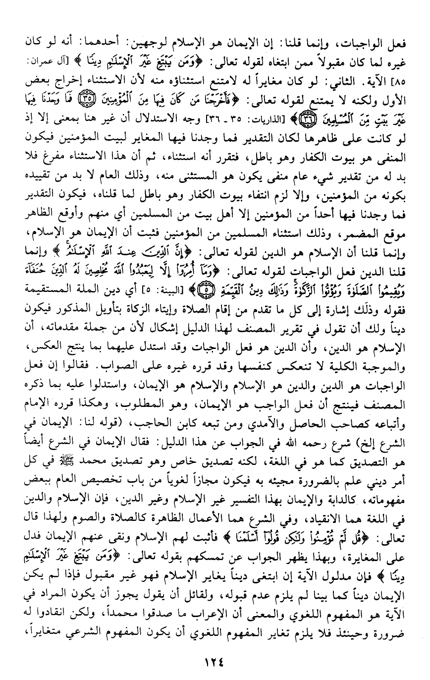 فعل الواجبات، وإنما قلنا: إن الإيمان هو الإسلام لوجهين, أحدهما: أنه لو كان غيره لما كان مقبولا ممن ابتغاه لقوله تعالى: {وَمَنْ يَبْتَغِ غَيْرَ الْإِسْلامِ دِينًا فَلَنْ يُقْبَلَ مِنْهُ} [آل عمران: 85] الآية. الثاني: لو كان مغايرا له لامتنع استثناؤه منه؛ لأن الاستثناء إخراج بعض الأول ولكنه لا يمتنع لقوله تعالى: {فَأَخْرَجْنَا مَنْ كَانَ فِيهَا مِنَ الْمُؤْمِنِينَ، فَمَا وَجَدْنَا فِيهَا غَيْرَ بَيْتٍ مِنَ الْمُسْلِمِينَ} [الذاريات: 36، 36] ووجه الاستدلال أن غير هنا بمعنى إلا, إذ لو كانت على ظاهرها لكان التقدير فما وجدنا فيها المغاير لبيت المؤمنين, فيكون المنفي هو بيوت الكفار وهو باطل, فتقرر أنه استثناء، ثم إن هذا الاستثناء مفرغ فلا بد له من تقدير شيء عام منفي يكون هو المستثنى منه، وذلك العام لا بد من تقييده بكونه من المؤمنين، وإلا لزم انتفاء بيوت الكفار وهو باطل لما قلناه، فيكون التقدير: فما وجدنا فيها أحدا من المؤمنين إلا أهل بيت من المسلمين أي: منهم وأوقع الظاهر موقع المضمر، وذلك استثناء المسلمين من المؤمنين, فثبت أن الإيمان هو الإسلام، وإنما قلنا: إن الإسلام هو الدين لقوله تعالى: {إِنَّ الدِّينَ عِنْدَ اللَّهِ الْإِسْلامُ} وإنما قلنا: الدين فعل الواجبات لقوله تعالى: {وَمَا أُمِرُوا إِلَّا لِيَعْبُدُوا اللَّهَ مُخْلِصِينَ لَهُ الدِّينَ حُنَفَاءَ وَيُقِيمُوا الصَّلاةَ وَيُؤْتُوا الزَّكَاةَ وَذَلِكَ دِينُ الْقَيِّمَةِ} [البينة: 5] أي: دين الملة المستقيمة, فقوله: وذلك إشارة إلى كل ما تقدم من إقام الصلاة وإيتاء الزكاة بتأويل المذكور فيكون دينا, ولك أن تقول في تقرير المصنف لهذا الدليل: إشكال لأن من جملة مقدماته، أن الإسلام هو الدين, وأن الدين هو فعل الواجبات وقد استدل عليهما بما ينتج العكس، والموجبة الكلية لا تنعكس كنفسها وقد قرره غيره على الصواب, فقالوا: إن فعل الواجبات هو الدين والدين هو الإسلام والإسلام هو الإيمان، واستدلوا عليه بما ذكره المصنف فينتج أن فعل الواجب هو الإيمان، وهو المطلوب, وهكذا قرره الإمام وأتباعه كصاحب الحاصل والآمدي ومن تبعه كابن الحاجب. قوله: "لنا: الإيمان في الشرع ... إلخ" شرع رحمه الله في الجواب عن هذا الدليل فقال: الإيمان في الشرع أيضا هو التصديق كما هو في اللغة، لكنه تصديق خاص وهو تصديق محمد -صلى الله عليه وسلم- في كل أمر ديني علم بالضرورة مجيئه به فيكون مجازا لغويا من باب تخصيص العام ببعض مفهوماته كالدابة, والإيمان بهذا التفسير غير الإسلام وغير الدين، فإن الإسلام والدين في اللغة هما الانقياد، وفي الشرع هما الأعمال الظاهرة كالصلاة والصوم؛ ولهذا قال تعالى: {قُلْ لَمْ تُؤْمِنُوا وَلَكِنْ قُولُوا أَسْلَمْنَا} فأثبت لهم الإسلام ونفى عنهم الإيمان فدل على المغايرة، وبهذا يظهر الجواب عن تمسكهم بقوله تعالى: {وَمَنْ يَبْتَغِ غَيْرَ الْإِسْلامِ دِينًا} فإن مدلول الآية إن ابتغى دينا يغاير الإسلام فهو غير مقبول, فإذا لم يكن الإيمان دينا كما بينا لم يلزم عدم قبوله، ولقائل أن يقول: يجوز أن يكون المراد في الآية هو المفهوم اللغوي, والمعنى أن الأعراب ما صدقوا محمدا، ولكن انقادوا له ضرورة وحينئذ فلا يلزم تغاير المفهوم اللغوي أن يكون المفهوم الشرعي متغايرا،