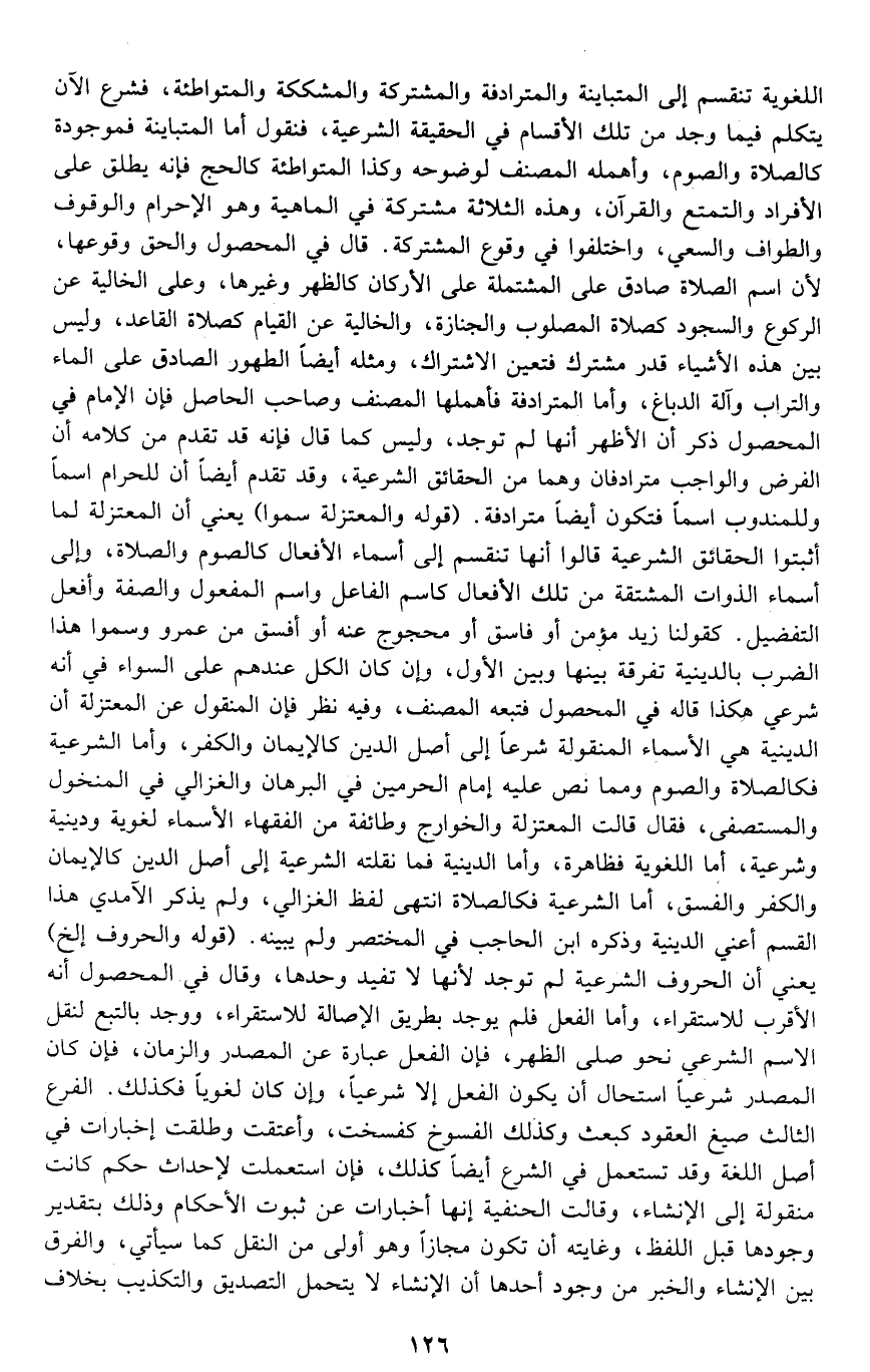 اللغوية تنقسم إلى المتباينة والمترادفة والمشتركة والمشككة والمتواطئة، فشرع الآن يتكلم فيما وجد من تلك الأقسام في الحقيقة الشرعية، فنقول: أما المتباينة فموجودة كالصلاة والصوم، وأهمله المصنف لوضوحه وكذا المتواطئة كالحج فإنه يطلق على الإفراد والتمتع والقران، وهذه الثلاثة مشتركة في الماهية وهو الإحرام والوقوف والطواف والسعي، واختلفوا في وقوع المشتركة. قال في المحصول: والحق وقوعها؛ لأن اسم الصلاة صادق على المشتملة على الأركان كالظهر وغيرها، وعلى الخالية عن الركوع والسجود كصلاة المصلوب والجنازة، والخالية عن القيام كصلاة القاعد، وليس بين هذه الأشياء قدر مشترك فتعين الاشتراك، ومثله أيضا الطهور الصادق على الماء والتراب وآلة الدباغ، وأما المترادفة فأهملها المصنف وصاحب الحاصل, فإن الإمام في المحصول ذكر أن الأظهر أنها لم توجد، وليس كما قال فإنه قد تقدم من كلامه أن الفرض والواجب مترادفان وهما من الحقائق الشرعية، وقد تقدم أيضا أن للحرام اسما وللمندوب اسما فتكون أيضا مترادفة. قوله: "والمعتزلة سموا" يعني: أن المعتزلة لما أثبتوا الحقائق الشرعية قالوا: إنها تنقسم إلى أسماء الأفعال كالصوم والصلاة، وإلى أسماء الذوات المشتقة من تلك الأفعال كاسم الفاعل واسم المفعول والصفة وأفعل التفضيل، كقولنا: زيد مؤمن أو فاسق أو محجوج عنه أو أفسق من عمرو, وسموا هذا الضرب بالدينية تفرقة بينها وبين الأول، وإن كان الكل عندهم على السواء في أن شرعي, هكذا قاله في المحصول فتبعه المصنف، وفيه نظر فإن المنقول عن المعتزلة أن الدينية هي الأسماء المنقولة شرعا إلى أصل الدين كالإيمان والكفر, وأما الشرعية فكالصلاة والصوم, ومما نص عليه إمام الحرمين في البرهان والغزالي في المنخول والمستصفى، فقال: قالت المعتزلة والخوارج وطائفة من الفقهاء: الأسماء لغوية ودينية وشرعية، أما اللغوية فظاهرة، وأما الدينية فما نقلته الشريعة إلى أصل الدين كالإيمان والكفر والفسق، أما الشرعية فكالصلاة انتهى لفظ الغزالي، ولم يذكر الآمدي هذا القسم أعني: الدينية, وذكره ابن الحاجب في المختصر ولم يبينه. قوله: "والحروف ... إلخ" يعني أن الحروف الشرعية لم توجد لأنها لا تفيد وحدها، وقال في المحصول: إنه الأقرب للاستقراء، وأما الفعل فلم يوجد بطريق الأصالة للاستقراء, ووجد بالتبع لنقل الاسم الشرعي نحو: صلى الظهر، فإن الفعل عبارة عن المصدر والزمان، فإن كان المصدر شرعيا استحال أن يكون الفعل إلا شرعيا، وإن كان لغويا فكذلك. الفرع الثالث: صيغ العقود كبعث وكذلك الفسوخ كفسخت، وأعتقت وطلقت إخبارات في أصل اللغة, وقد تستعمل في الشرع أيضا كذلك، فإن استعملت لإحداث حكم كانت منقولة إلى الإنشاء، وقالت الحنفية: إنها إخبارات عن ثبوت الأحكام وذلك بتقدير وجودها قبل اللفظ، وغايته أن تكون مجازا وهو أولى من النقل كما سيأتي، والفرق بين الإنشاء والخبر من وجود أحدها أن الإنشاء لا يتحمل التصديق والتكذيب بخلاف