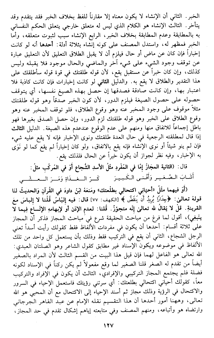أو فيهما مثل: "أحياني اكتحالي بطلعتك" ومنعه ابن داود في القرآن والحديث. لنا قوله تعالى: {جِدَارًا يُرِيدُ أَنْ يَنْقَضَّ} [الكهف: 77] قال: فيه إلباس قلنا: لا إلباس مع القرينة، قل: لا يقال لله تعالى: إنه متجوز, قلنا: لعدم الإذن أو لإبهامه الاتساع فيما لا ينبغي". أقول: لما فرغ من مباحث الحقيقة شرع في مباحث المجاز, فذكر أن المجاز على ثلاثة أقسام, أحدها: أن يكون في مفردات الألفاظ فقط كقولك: رأيت أسدا تعني: الرجل الشجاع. الثاني: أن يقع في التركيب فقط وذلك بأن يستعمل كل واحد من تلك الألفاظ في موضوعه ويكون الإسناد غير مطابق كقول الشاعر وهو الصلتان العبدي: الله تعالى هو الفاعل لهما, فإن قيل: هذا البيت من القسم الثالث؛ لأن المراد بالصغير أيضا من تقدم له الصغر قلنا: الصغير لما وقع مفعولا لم يكن ركنا في الإسناد لكونه فضلة, فلم يجتمع المجاز التركيبي والإفرادي. الثالث: أن يكون في الإفراد والتركيب معا، كقولك: أحياني اكتحالي بطلعتك أي: سرتني رؤيتك, فاستعمل الإحياء في السرور والاكتحال في الرؤية, وذلك مجاز ثم أسند الإحياء إلى الاكتحال مع أن المحيي هو الله تعالى، وههنا أمور أحدها: أن هذا التقسيم نقله الإمام عن عبد القاهر الجرجاني وارتضاه هو وأتباعه، ومنهم المصنف وفي متابعته إياهم إشكال تقدم في حد المجاز،