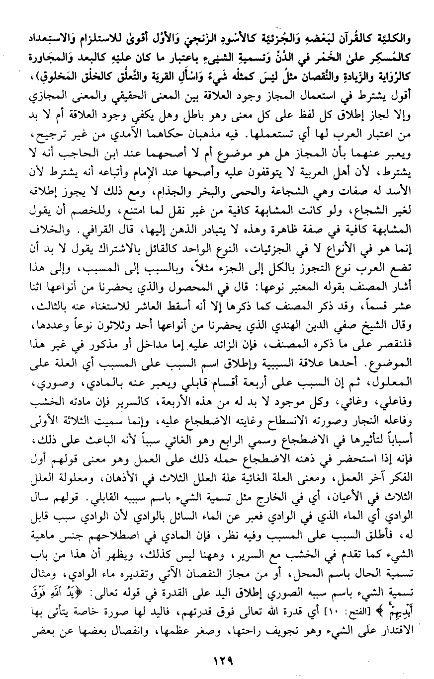والكلية كالقرآن لبعضه والجزئية كالأسود الزنجي والأول أقوى للاستلزام والاستعداد كالمسكر على الخمر في الدن, وتسمية الشيء باعتبار ما كان عليه كالبعد والمجاورة كالرواية والزيادة والنقصان مثل {لَيْسَ كَمِثْلِهِ شَيْءٌ} و {وَاسْأَلِ الْقَرْيَةَ} والتعلق كالخلق المخلوق". أقول: يشترط في استعمال المجاز وجود العلاقة بين المعنى الحقيقي والمعنى المجازي وإلا لجاز إطلاق كل لفظ على كل معنى وهو باطل, وهل يكفي وجود العلاقة أم لا بد من اعتبار العرب لها, أي تستعملها؟ فيه مذهبان حكاهما الآمدي من غير ترجيح، ويعبر عنهما بأن المجاز هل هو موضوع أم لا؟ أصحهما عند ابن الحاجب أنه لا يشترط؛ لأن أهل العربية لا يتوقفون عليه وأصحها عند الإمام وأتباعه أنه يشترط لأن الأسد له صفات وهي: الشجاعة والحمى والبخر والجذام، ومع ذلك لا يجوز إطلاقه لغير الشجاع، ولو كانت المشابهة كافية من غير نقل لما امتنع، وللخصم أن يقول: المشابهة كافية في صفة ظاهرة وهذه لا يتبادر الذهن إليها. قال القرافي: والخلاف إنما هو في الأنواع لا في الجزئيات، النوع الوحد كالقائل بالاشتراك يقول: لا بد أن تضع العرب نوع التجوز بالكل إلى الجزء مثلا, وبالسبب إلى المسبب، وإلى هذا أشار المصنف بقوله: المعتبر نوعها. قال في المحصول: والذي يحضرنا من أنواعها اثنا عشر قسما، وقد ذكر المصنف كما ذكرها إلا أنه أسقط العاشر للاستغناء عنه بالثالث، وقال الشيخ صفي الدين الهندي: الذي يحضرنا من أنواعها أحد وثلاثون نوعا وعددها، فلنقتصر على ما ذكره المصنف, فإن الزائد عليه إما مداخل أو مذكور في غير هذا الموضوع, أحدها: علاقة السببية وإطلاق اسم السبب على المسبب أي: العلة على المعلول، ثم إن السبب على أربعة أقسام: قابلي ويعبر عنه بالمادي، وصوري، وفاعلي، وغائي، وكل موجود لا بد له من هذه الأربعة كالسرير, فإن مادته الخشب وفاعله النجار وصورته الانسطاح وغايته الاضطجاع عليه, وإنما سميت الثلاثة الأولى أسبابا لتأثيرها في الاضطجاع وسمي الرابع وهو الغائي سببا لأنه الباعث على ذلك، فإنه إذا استحضر في ذهنه الاضطجاع حمله ذلك على العمل وهو معنى قولهم: أول الفكر آخر العمل, ومعنى العلة الغائية علة العلل الثلاث في الأذهان, ومعلولة العلل الثلاث في الأعيان، أي: في الخارج مثل تسمية الشيء باسم سببه القابلي، وقولهم: سال الوادي أي: الماء الذي في الوادي فعبر عن الماء السائل بالوادي؛ لأن الوادي سبب قابل له، فأطلق السبب على المسبب وفيه نظر، فإن المادي في اصطلاحهم جنس ماهية الشيء كما تقدم في الخشب مع السرير، وههنا ليس كذلك، ويظهر أن هذا من باب تسمية الحال باسم المحل، أو من مجاز النقصان الآتي وتقديره: ماء الوادي، ومثال تسمية الشيء باسم سببه الصوري إطلاق اليد على القدرة في قوله تعالى: {يَدُ اللَّهِ فَوْقَ أَيْدِيهِمْ} [الفتح: 10] أي: قدرة الله تعالى فوق قدرتهم, فاليد لها صورة خاصة يتأتى بها الاقتدار على الشيء وهو تجويف راحتها، وصغر عظمها، وانفصال بعضها عن بعض