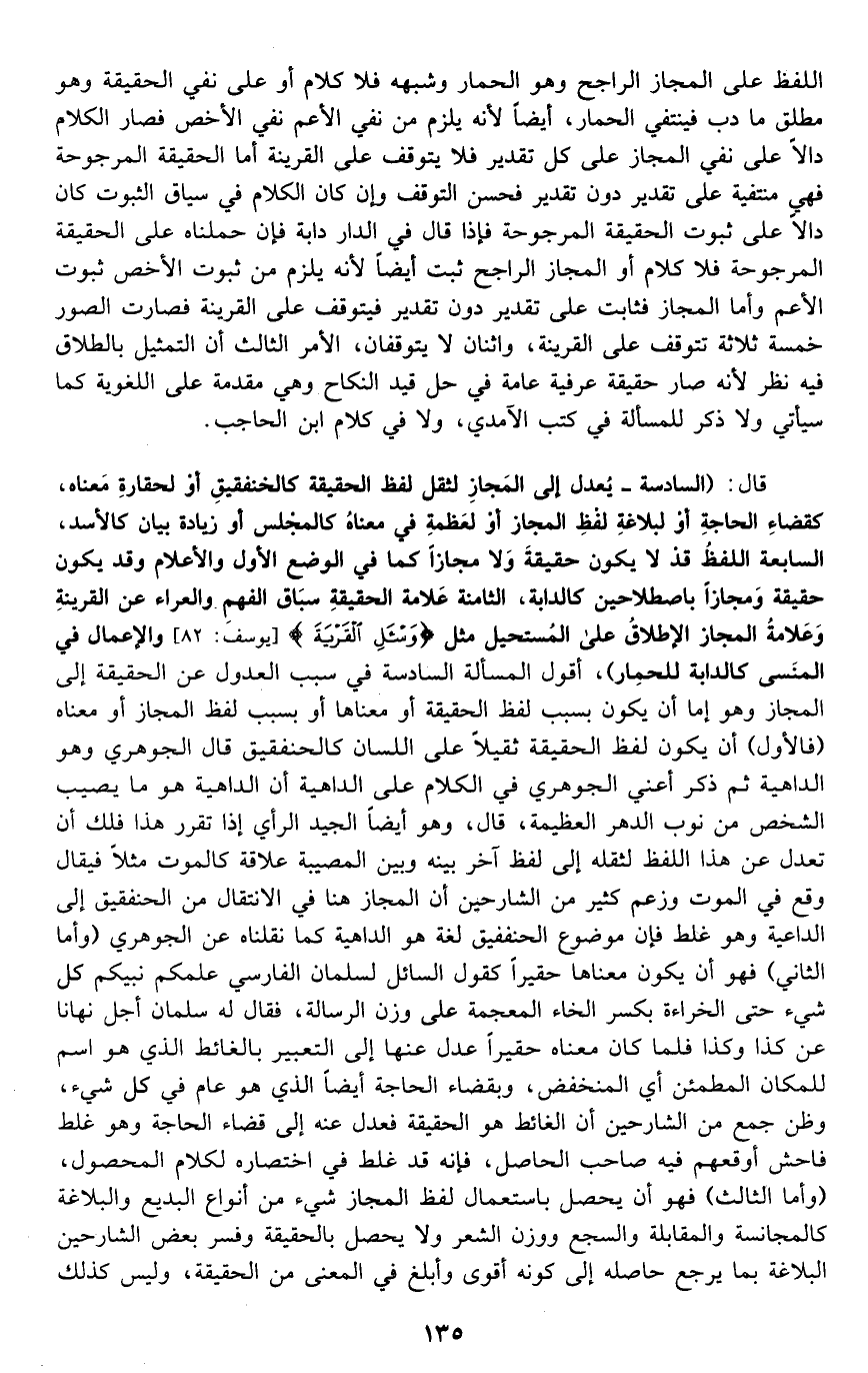 قال: "السادسة: يعدل إلى المجاز لثقل لفظ الحقيقة كالخنفقيق أو لحقارة معناه، كقضاء الحاجة, أو لبلاغة لفظ المجاز, أو لعظمة في معناه كالمجلس, أو لزيادة بيان كالأسد. السابعة: اللفظ قد لا يكون حقيقة ولا مجازا كما في الوضع الأول والأعلام, وقد يكون حقيقة ومجازا باصطلاحين كالدابة. الثامنة: علامة الحقيقة سباق الفهم والعراء عن القرينة, وعلامة المجاز الإطلاق على المستحيل مثل: {وَاسْأَلِ الْقَرْيَةَ} [يوسف: 82] والإعمال في المنسى كالدابة للحمار". أقول: المسألة السادسة في سبب العدول عن الحقيقة إلى المجاز, وهو إما أن يكون بسبب لفظ الحقيقة أو معناها أو بسبب لفظ المجاز أو معناه "فالأول": أن يكون لفظ الحقيقة ثقيلا على اللسان كالخنفقيق, قال الجوهري: وهو الداهية ثم ذكر أعني الجوهري في الكلام على الداهية أن الداهية هو ما يصيب الشخص من نوب الدهر العظيمة, قال: وهو أيضا الجيد الرأي, إذا تقرر هذا فلك أن تعدل عن هذا اللفظ لثقله إلى لفظ آخر بينه وبين المصيبة علاقة كالموت مثلا فيقال: وقع في الموت, وزعم كثير من الشارحين أن المجاز هنا في الانتقال من الخنفقيق إلى الداهية وهو غلط, فإن موضوع الخنفقيق لغة هو الداهية كما نقلناه عن الجوهري. "وأما الثاني" فهو أن يكون معناها حقيرا كقول السائل لسلمان الفارسي: علمكم نبيكم كل شيء حتى الخراءة بكسر الخاء المعجمة على وزن الرسالة؟ فقال له سلمان: أجل نهانا عن كذا وكذا, فلما كان معناه حقيرا عدل عنه إلى التعبير بالغائط الذي اسم للمكان المطمئن أي: المنخفض، وبقضاء الحاجة أيضا الذي هو عام في كل شيء، وظن جمع من الشارحين أن الغائط هو الحقيقة, فعدل عنه إلى قضاء الحاجة وهو غلط فاحش أوقعهم فيه صاحب الحاصل، فإنه قد غلط في اختصاره لكلام المحصول. "وأما الثالث" فهو أن يحصل باستعمال لفظ المجاز شيء من أنواع البديع والبلاغة كالمجانسة والمقابلة والسجع ووزن الشعر ولا يحصل بالحقيقة, وفسر بعض الشارحين البلاغة بما يرجع حاصله إلى كونه أقوى وأبلغ في المعنى من الحقيقة، وليس كذلك