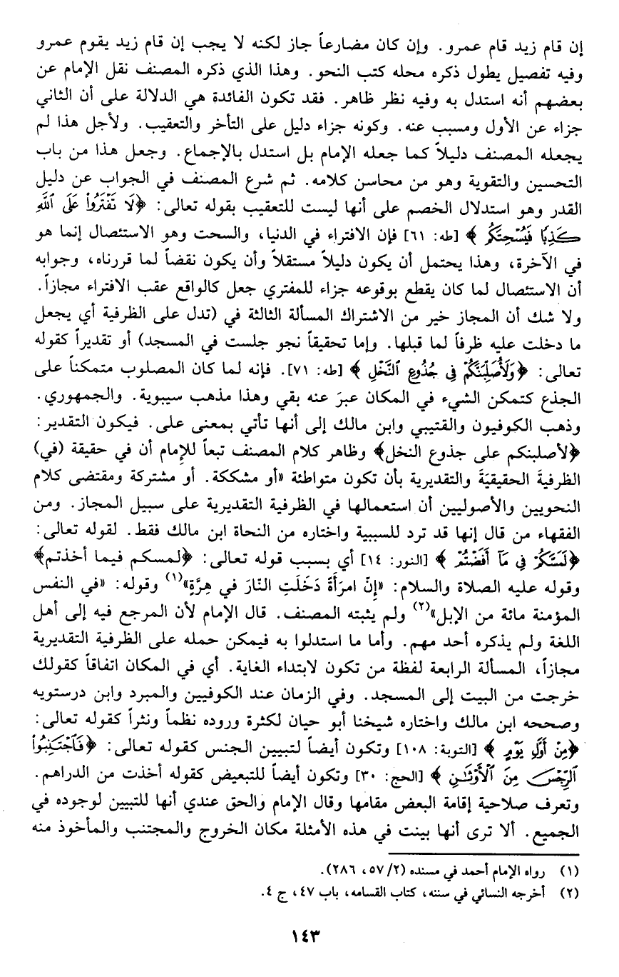 إن قام زيد قام عمرو, وإن كان مضارعا جاز لكنه لا يجب: إن قام زيد يقوم عمرو وفيه تفصيل يطول ذكره, محله كتب النحو. وهذا الذي ذكره المصنف نقل الإمام عن بعضهم أنه استدل به وفيه نظر ظاهر, فقد تكون الفائدة هي الدلالة على أن الثاني جزاء عن الأول ومسبب عنه, وكونه جزاء دليل على التأخير والتعقيب. ولأجل هذا لم يجعله المصنف دليلا كما جعله الإمام بل استدل بالإجماع وجعل هذا من باب التحسين والتقوية وهو من محاسن كلامه. ثم شرع المصنف في الجواب عن دليل القدر وهو استدلال الخصم على أنها ليست للتعقيب بقوله تعالى: {لا تَفْتَرُوا عَلَى اللَّهِ كَذِبًا فَيُسْحِتَكُمْ} [طه: 61] فإن الافتراء في الدنيا، والسحت وهو الاستئصال إنما هو في الآخرة, وهذا يحتمل أن يكون دليلا مستقلا وأن يكون نقضا لما قررناه، وجوابه أن الاستئصال لما كان يقطع بوقوعه جزاء للمفتري جعل كالواقع عقب الافتراء مجازًا. ولا شك أن المجاز خير من الاشتراك. المسألة الثالثة: في "تدل على الظرفية أي: يجعل ما دخلت عليه ظرفا لما قبلها, وإما تحقيقا نحو: جلست في المسجد" أو تقديرا كقوله تعالى: {وَلَأُصَلِّبَنَّكُمْ فِي جُذُوعِ النَّخْلِ} [طه: 71] فإنه لما كان المصلوب متمكنا على الجذع كتمكن الشيء في المكان عبر عنه بفي وهذا مذهب سيبويه والجمهوري, وذهب الكوفيون والقتيبي وابن مالك إلى أنها تأتي بمعنى على فيكون التقدير: "لأصلبنكم على جذوع النخل". وظاهر كلام المصنف تبعا للإمام أن في حقيقة "في" الظرفية الحقيقية والتقديرية بأن تكون متواطئة أو مشككة أو مشتركة, ومقتضى كلام النحويين والأصوليين أن استعمالها في الظرفية التقديرية على سبيل المجاز. ومن الفقهاء من قال: إنها قد ترد للسببية واختاره من النحاة ابن مالك فقط لقوله تعالى: {لَمَسَّكُمْ فِي مَا أَفَضْتُمْ} [النور: 14] أي: بسبب قوله تعالى: "لمسكم فيما أخذتم" وقوله -عليه الصلاة والسلام: "إن امرأة دخلت النار في هرة" 1 وقوله: "في النفس المؤمنة مائة من الإبل" 2 ولم يثبته المصنف. قال الإمام: لأن المرجع فيه إلى أهل اللغة ولم يذكره أحد منهم, وأما ما استدلوا به فيمكن حمله على الظرفية التقديرية مجازا. المسألة الرابعة: لفظة من تكون لابتداء الغاية, أي: في المكان اتفاقا كقولك: خرجت من البيت إلى المسجد، وفي الزمان عند الكوفيين والمبرد وابن درستويه وصححه ابن مالك واختاره شيخنا أبو حيان لكثرة وروده نظما ونثرا كقوله تعالى: {مِنْ أَوَّلِ يَوْمٍ} [التوبة: 108] وتكون أيضا لتبيين الجنس كقوله تعالى: {فَاجتَنِبُوا الرِّجْسَ مِنَ الْأَوْثَانِ} [الحج: 30] وتكون أيضا للتبعيض كقوله: أخذت من الدراهم. وتعرف صلاحية إقامة البعض مقامها, وقال الإمام: والحق عندي أنها للتبيين لوجوده في الجميع, ألا ترى أنها بينت في هذه الأمثلة مكان الخروج والمجتنب والمأخوذ منه