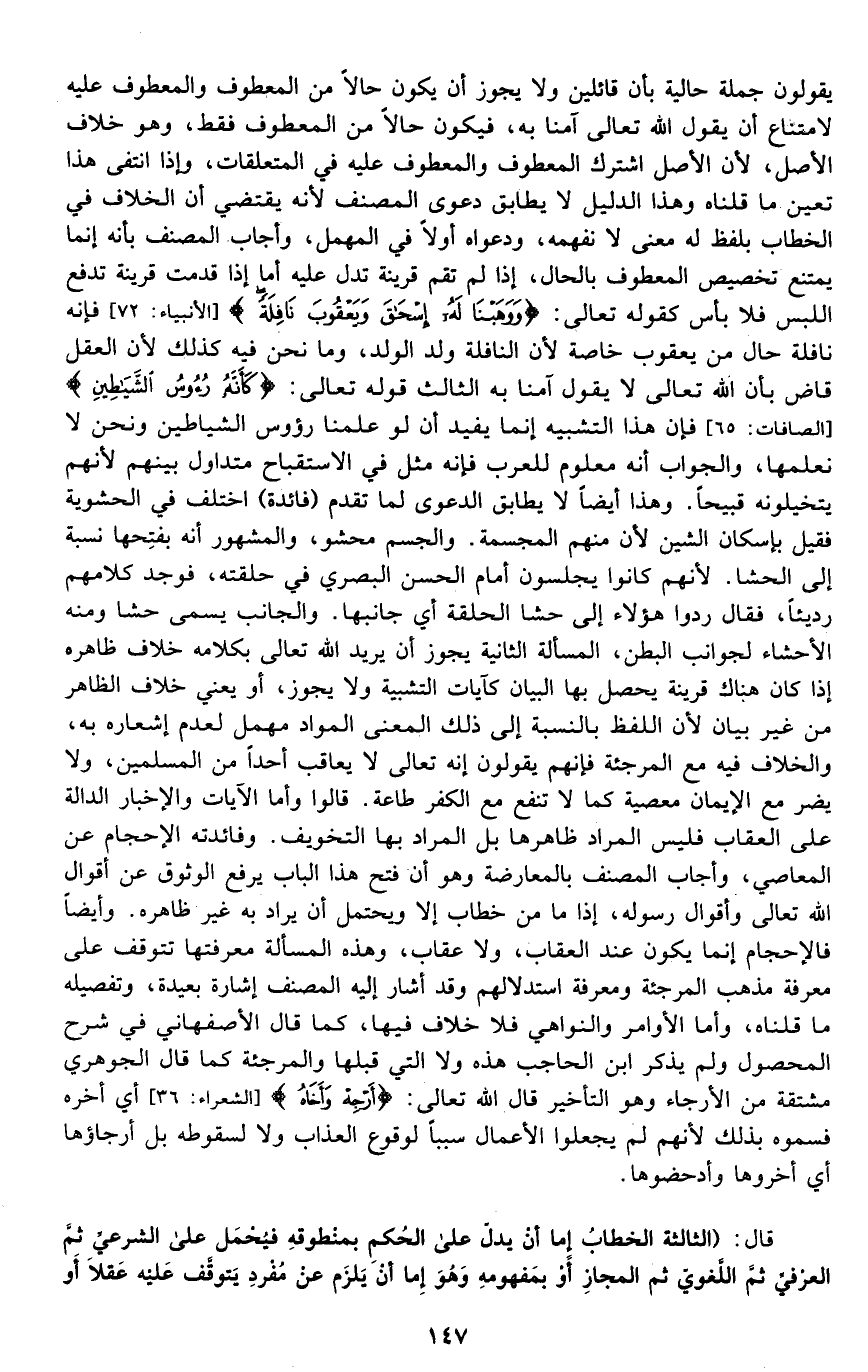 {يَقُولُونَ} جملة حالية بأن قائلين, ولا يجوز أن يكون حالا من المعطوف والمعطوف عليه لامتناع أن يقول الله تعالى: آمنا به، فيكون حالا من المعطوف فقط، وهو خلاف الأصل؛ لأن الأصل اشتراك المعطوف والمعطوف عليه في المتعلقات، وإذا انتفى هذا تعين ما قلناه وهذا الدليل لا يطابق دعوى المصنف؛ لأنه يقتضي أن الخلاف في الخطاب بلفظ له معنى لا نفهمه، ودعواه أولا في المهمل، وأجاب المصنف بأنه إنما يمتنع تخصيص المعطوف بالحال إذا لم تقم قرينة تدل عليه, أما إذا قدمت قرينة تدفع اللبس فلا بأس كقوله تعالى: {وَوَهَبْنَا لَهُ إِسْحَاقَ وَيَعْقُوبَ نَافِلَةً} [الأنبياء: 72] فإن {نَافِلَةً} حال من يعقوب خاصة لأن النافلة ولد الولد, وما نحن فيه كذلك؛ لأن العقل قاضٍ بأن الله تعالى لا يقول: آمنا به. الثالث: قوله تعالى: {كَأَنَّهُ رُؤُوسُ الشَّيَاطِين} [الصافات: 65] فإن هذا التشبيه إنما يفيد أن لو علمنا رءوس الشياطين ونحن لا نعلمها، والجواب أنه معلوم للعرب فإنه مثل في الاستقباح متداول بينهم؛ لأنهم يتخيلونه قبيحا. وهذا أيضا لا يطابق الدعوى لما تقدم. "فائدة": اختلف في الحشوية فقيل بإسكان الشين؛ لأن منهم المجسمة، والجسم محشو، والمشهور أنه بفتحها نسبة إلى الحشا؛ لأنهم كانوا يجلسون أمام الحسن البصري في حلقته، فوجد كلامهم رديئا، فقال: ردوا هؤلاء إلى حشا الحلقة أي: جانبها, والجانب يسمى حشا ومنه الأحشاء لجوانب البطن. المسألة الثانية: يجوز أن يريد الله تعالى بكلامه خلاف ظاهره, إذا كان هناك قرينة يحصل بها البيان كآيات التشبيه ولا يجوز، أو يعني خلاف الظاهر من غير بيان؛ لأن اللفظ بالنسبة إلى ذلك المعنى المراد مهمل لعدم إشعاره به، والخلاف فيه مع المرجئة فإنهم يقولون: إنه تعالى لا يعاقب أحدا من المسلمين، ولا يضر مع الإيمان معصية كما لا تنفع مع الكفر طاعة، قالوا: وأما الآيات والأخبار الدالة على العقاب فليس المراد ظاهرها, بل المراد بها التخويف, وفائدته الإحجام عن المعاصي، وأجاب المصنف بالمعارضة وهو أن فتح هذا الباب يرفع الوثوق عن أقوال الله تعالى وأقوال رسوله، إذ ما من خطاب إلا ويحتمل أن يراد به غير ظاهره, وأيضا فالإحجام إنما يكون عند العقاب، ولا عقاب, وهذه المسألة معرفتها تتوقف على معرفة مذهب المرجئة ومعرفة استدلالهم, وقد أشار إليه المصنف إشارة بعيدة، وتفصيله ما قلناه، وأما الأوامر والنواهي فلا خلاف فيها كما قال الأصفهاني في شرح المحصول ولم يذكر ابن الحاجب هذه ولا التي قبلها, والمرجئة -كما قال الجوهري- مشتقة من الإرجاء وهو التأخير, قال الله تعالى: {أَرْجِهْ وَأَخَاهُ} [الشعراء: 36] أي: أخره فسموه بذلك؛ لأنهم لم يجعلوا الأعمال سببا لوقوع العذاب ولا لسقوطه, بل أرجوها أي: أخروها وأدحضوها.
