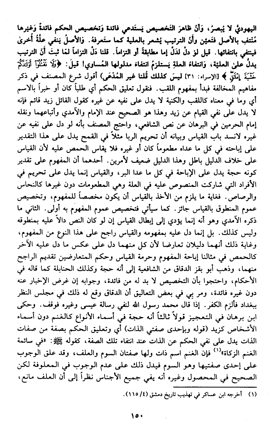 اليهودي لا يبصر، وأن ظاهر التخصيص يستدعي فائدة وتخصيص الحكم فائدة, وغيرها منتفٍ بالأصل فتعين, وأن الترتيب يشعر بالعلية كما ستعرفه. والأصل ينفي علة أخرى فينتفي بانتفائها. قيل: لو دل لدل إما مطابقة أو التزاما, قلنا: دل التزاما لما ثبت أن الترتيب يدل على العلية، وانتفاء العلة يستلزم انتفاء مدلولها المساوي! قيل: {وَلا تَقْتُلُوا أَوْلادَكُمْ مِنْ إِمْلاقٍ} [الإسراء: 31] ليس كذلك قلنا: غير المدعي". أقول: شرع المصنف في ذكر مفاهيم المخالفة فبدأ بمفهوم اللقب, فنقول: تعليق الحكم أي: طلبا كان أو خبرا, بالاسم أي: وما في معناه كاللقب والكنية, لا يدل على نفيه عن غيره كقول القائل: زيد قائم فإنه لا يدل على نفي القيام عن زيد وهذا هو الصحيح عند الإمام والآمدي وأتباعهما, ونقله إمام الحرمين في البرهان عن نص الشافعي، واحتج المصنف بأنه لو دل على نفيه عن غيره لانسد باب القياس, وبيانه أن تحريم الربا مثلا في القمح يدل على هذا التقدير على إباحته في كل ما عداه, مطعوما كان أو غيره, فلا يقاس الحمص عليه لأن القياس على خلاف الدليل باطل وهذا الدليل ضعيف لأمرين, أحدهما: أن المفهوم على تقدير كونه حجة يدل على الإباحة في كل ما عدا البر، والقياس إنما يدل على تحريم في الأفراد التي شاركت المنصوص عليه في العلة وهي المطعومات دون غيرها كالنحاس والرصاص, فغاية ما يلزم من الأخذ بالقياس أن يكون مخصصا للمفهوم، وتخصيص عموم المنطوق بالقياس جائز، كما سيأتي, فتخصيص عموم المفهوم به أولى. الثاني ما ذكره الآمدي: وهو أنه إنما يؤدي إلى إبطال القياس إن لو كان النص دالا عليه بمنطوقه وليس كذلك, بل إنما دل عليه بمفهومه والقياس راجح على هذا النوع من المفهوم، وغاية ذلك أنهما دليلان تعارضا لأن كلا منهما دل على عكس ما دل عليه الآخر كالحمص في مثالنا إباحة المفهوم وحرمة القياس وحكم المتعارضين تقديم الراجح منهما، وذهب أبو بكر الدقاق من الشافعية إلى أنه حجة وكذلك الحنابلة كما قاله في الأحكام، واحتجوا بأن التخصيص لا بد له من فائدة، وجوابه أن غرض الإخبار عنه دون غيره فائدة، ومر بي في بعض التعاليق أن الدقاق وقع له ذلك في مجلس النظر ببغداد فألزم الكفر, إذا قال: محمد رسول الله لنفي رسالة عيسى وغيره فوقف. وحكى ابن برهان في التعجيز قولا ثالثا أنه حجة في أسماء الأنواع كالغنم دون أسماء الأشخاص كزيد. قوله: "وبإحدى صفتي الذات" أي: وتعليق الحكم بصفة من صفات الذات يدل على نفي الحكم عن الذات عند انتفاء تلك الصفة كقوله -صلى الله عليه وسلم: "في سائمة الغنم الزكاة" 1 فإن الغنم اسم ذات ولها صفتان: السوم والعلف، وقد علق الوجوب على إحدى صفتيها وهو السوم, فيدل ذلك على عدم الوجوب في المعلوفة لكن الصحيح في المحصول وغيره أنه يفي جميع الأجناس نظرا إلى أن العلف مانع،