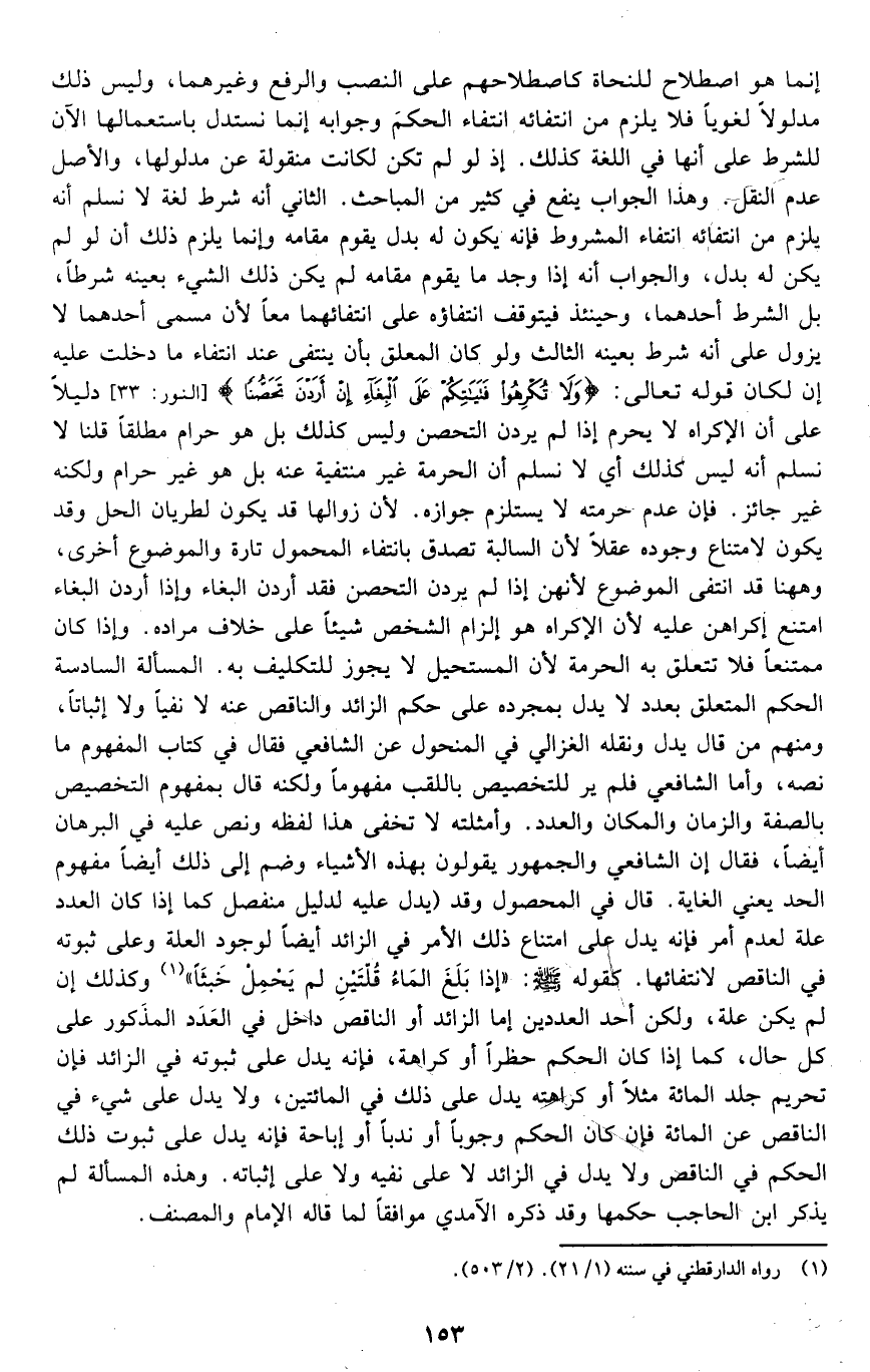 إنما هو اصطلاح للنحاة كاصطلاحهم على النصب والرفع وغيرهما، وليس ذلك مدلولا لغويا فلا يلزم من انتفائه انتفاء الحكم وجوابه إنما نستدل باستعمالها الآن للشرط على أنها في اللغة كذلك؛ إذ لو لم تكن لكانت منقولة عن مدلولها، والأصل عدم النقل, وهذا الجواب ينفع في كثير من المباحث. الثاني: أنه شرط لغة لا نسلم أنه يلزم من انتفائه انتفاء المشروط فإنه يكون له بدل يقوم مقامه وإنما يلزم ذلك أن لو لم يكن له بدل, والجواب أنه إذا وجد ما يقوم مقامه لم يكن ذلك الشيء بعينه شرطا، بل الشرط أحدهما، وحينئذ فيتوقف انتفاؤه على انتفائهما معا؛ لأن مسمى أحدهما لا يزول على أنه شرط بعينه. الثالث: ولو كان المتعلق بأن ينتفي عند انتفاء ما دخلت عليه إن لكان قوله تعالى: {وَلا تُكْرِهُوا فَتَيَاتِكُمْ عَلَى الْبِغَاءِ إِنْ أَرَدْنَ تَحَصُّنًا} [النور: 33] دليلا على أن الإكراه لا يحرم إذا لم يردن التحصن وليس كذلك بل هو حرام مطلقا قلنا: لا نسلم أنه ليس كذلك أي لا نسلم أن الحرمة غير منتفية عنه بل هو غير حرام, ولكنه غير جائز, فإن عدم حرمته لا يستلزم جوازه؛ لأن زوالها قد يكون لطرآن الحل وقد يكون لامتناع وجوده عقلا لأن السالبة تصدق بانتفاء المحمول تارة والموضوع أخرى، وههنا قد انتفى الموضوع لأنهن إذا لم يردن التحصن فقد أردن البغاء, وإذا أردن البغاء امتنع إكراههن عليه؛ لأن الإكراه هو إلزام الشخص شيئا على خلاف مراده, وإذا كان ممتنعا فلا تتعلق به الحرمة؛ لأن المستحيل لا يجوز للتكليف به. المسألة السادسة: الحكم المتعلق بعدد لا يدل بمجرده على حكم الزائد والناقص عنه لا نفيا ولا إثباتا، ومنهم من قال: يدل ونقله الغزالي في المنحول عن الشافعي فقال في كتاب المفهوم ما نصه: وأما الشافعي فلم ير للتخصيص باللقب مفهوما ولكنه قال بمفهوم التخصيص بالصفة والزمان والمكان والعدد, وأمثلته لا تخفى, هذا لفظه ونص عليه في البرهان أيضا فقال: إن الشافعي والجمهور يقولون بهذه الأشياء وضم إلى ذلك أيضا مفهوم الحد يعني الغاية. قال في المحصول: وقد يدل عليه لدليل منفصل كما إذا كان العدد علة لعدم أمر فإنه يدل على امتناع ذلك الأمر في الزائد أيضا لوجود العلة, وعلى ثبوته في الناقص لانتفائها كقوله -صلى الله عليه وسلم: "إذا بلغ الماء قلتين لم يحمل خبثًا" 1 وكذلك إن لم يكن علة، ولكن أحد العددين إما الزائد أو الناقص داخل في العدد المذكور على كل حال, كما إذا كان الحكم حظرا أو كراهة, فإنه يدل على ثبوته في الزائد, فإن تحريم جلد المائة مثلا أو كراهته يدل على ذلك في المائتين, ولا يدل على شيء في الناقص عن المائة فإن كان الحكم وجوبا أو ندبا أو إباحة فإنه يدل على ثبوت ذلك الحكم في الناقص ولا يدل في الزائد لا على نفيه ولا على إثباته. وهذه المسألة لم يذكر ابن الحاجب حكمها وقد ذكره الآمدي موافقا لما قاله الإمام والمصنف.