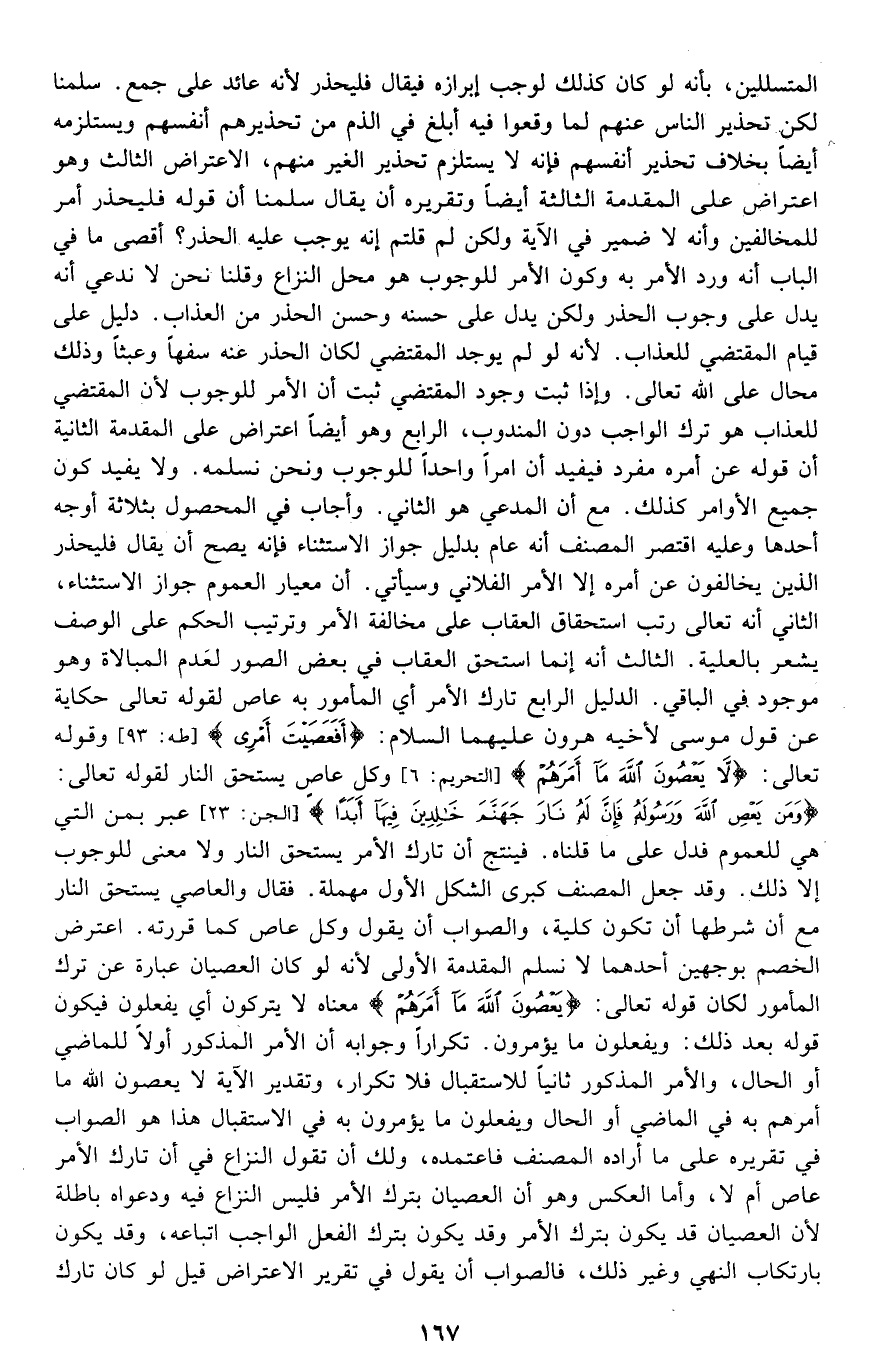 المتسللين بأنه لو كان كذلك لوجب إبرازه فيقال: فليحذر؛ لأنه عائد على جمع. سلمنا لكن تحذير الناس عنهم لما وقعوا فيه أبلغ في الذم من تحذيرهم أنفسهم, ويستلزمه أيضا بخلاف تحذير أنفسهم فإنه لا يستلزم تحذير الغير منهم. الاعتراض الثالث: وهو اعتراض على المقدمة الثالثة أيضا وتقريره أن يقال: سلمنا أن قوله: {فَلْيَحْذَرِ} أمر للمخالفين وأنه لا ضمير في الآية, ولكن لم قلتم: إنه يوجب عليه الحذر؟ أقصى ما في الباب أنه ورد الأمر به وكون الأمر للوجوب هو محل النزاع وقلنا: نحن لا ندعي أنه يدل على وجوب الحذر, ولكن يدل على حسنه وحسن الحذر من العذاب دليل على قيام المقتضي للعذاب؛ لأنه لو لم يوجد المقتضي لكان الحذر عنه سفها وعبثا وذلك محال على الله تعالى. وإذا ثبت وجود المقتضي ثبت أن الأمر للوجوب؛ لأن المقتضى للعذاب هو ترك الواجب دون المندوب. الرابع وهو أيضا اعتراض على المقدمة الثانية: أن قوله عن أمره مفرد, فيفيد أن أمرا واحدا للوجوب ونحن نسلمه، ولا يفيد كون جميع الأوامر كذلك مع أن المدعي هو الثاني. وأجاب في المحصول بثلاثة أوجه أحدها وعليه اقتصر المصنف: أنه عام بدليل جواز الاستثناء, فإنه يصح أن يقال: فليحذر الذين يخالفون عن أمره إلا الأمر الفلاني وسيأتي أن معيار العموم جواز الاستثناء. الثاني: أنه تعالى رتب استحقاق العقاب على مخالفة الأمر وترتيب الحكم على الوصف يشعر بالعلية. الثالث: أنه إنما استحق العقاب في بعض الصور لعدم المبالاة وهو موجود في الباقي. الدليل الرابع: تارك الأمر أي: المأمور به عاصٍ لقوله تعالى حكاية عن قول موسى لأخيه هارون -عليهما السلام: {أَفَعَصَيْتَ أَمْرِي} [طه: 93] وقوله تعالى: {لا يَعْصُونَ اللَّهَ مَا أَمَرَهُمْ} [التحريم: 6] وكل عاص يستحق النار لقوله تعالى: {وَمَنْ يَعْصِ اللَّهَ وَرَسُولَهُ فَإِنَّ لَهُ نَارَ جَهَنَّمَ خَالِدِينَ فِيهَا أَبَدًا} [الجن: 23] عبر بمن التي هي للعموم, فدل على ما قلناه؛ فينتج أن تارك الأمر يستحق النار ولا معنى للوجوب إلا ذلك. وقد جعل المصنف كبرى الشكل الأول مهملة فقال: والعاصي يستحق النار مع أن شرطها أن تكون كلية، والصواب أن يقول: وكل عاص كما قررته. اعترض الخصم بوجهين أحدهما: لا نسلم المقدمة الأولى؛ لأنه لو كان العصيان عبارة عن ترك المأمور لكان قوله تعالى: {يَعْصُونَ اللَّهَ مَا أَمَرَهُمْ} معناه: لا يتركون أي: يفعلون فيكون قوله بعد ذلك: {وَيَفْعَلُونَ مَا يُؤْمَرُونَ} تكرارا, وجوابه أن الأمر المذكور أولا للماضي أو الحال، والأمر المذكور ثانيا للاستقبال فلا تكرار، وتقدير الآية: لا يعصون الله ما أمرهم به في الماضي أو الحال, ويفعلون ما يؤمرون به في الاستقبال هذا هو الصواب في تقريره على ما أراده المصنف فاعتمده، ولك أن تقول: النزاع في أن تارك الأمر عاصٍ أم لا، وأما العكس وهو أن العصيان بترك الأمر فليس النزاع فيه ودعواه باطلة لأن العصيان قد يكون بترك الأمر وقد يكون بترك الفعل الواجب اتباعه، وقد يكون بارتكاب النهي وغير ذلك، فالصواب أن يقول في تقرير الاعتراض: قيل: لو كان تارك