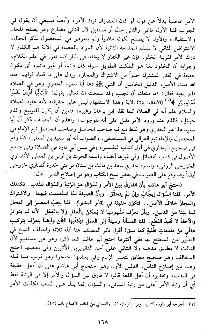 الأمر عاصيا بدلا عن قوله: لو كان العصيان ترك الأمر، وأيضا فينبغي أن يقول في الجواب قلنا: الأول ماض والثاني حال أو مستقبل؛ لأن الثاني مضارع وهو يصلح للحال والاستقبال، والأول لا يصلح لكون ماضيا ولم يتعرض في المحصول لذكر الحال. الاعتراض الثاني: لا نسلم المقدمة الثانية؛ لأن المراد بالعصاة في الآية هم الكفار لا تارك الأمر لقرينة الخلو، فإن غير الكفار لا يخلد في النار كما تقرر في علم الكلام، وجوابه أن الخلود لغة هو المكث الطويل سواء كان دائما أو غير دائم، أي: يكون حقيقة في القدر المشترك حذرا من الاشتراك والمجاز, ويدل على ما قلناه قولهم: خلد الله ملك الأمير. الدليل الخامس: أن النبي -صلى الله عليه وسلم- دعا أبا سعيد الخدري وهو في الصلاة فلم يجبه فقال: "ما منعك أن تجيب وقد سمعت الله تعالى يقول: {يَا أَيُّهَا الَّذِينَ آمَنُوا اسْتَجِيبُوا} [الأنفال: 24] الآية؟ " 1 وهذا الاستفهام ليس على حقيقته؛ لأنه عليه الصلاة والسلام علم أنه في الصلاة كما نقله ابن برهان وغيره، فتعين أن يكون للتوبيخ والذم حينئذ، فالذم عند ورود الأمر دليل على أنه للوجوب، واعلم أن المصنف ذكر أن أبا سعيد هذا هو الخدري وهو غلط تبع فيه صاحب الحاصل وصاحب الحاصل تبع الإمام في المحصول والإمام تبع الغزالي في المستصفى، والصواب أنه أبو سعيد بن المعلى, كذا وقع في صحيح البخاري في أول كتاب التفسير، وفي سنن أبي داود في الصلاة وفي جامع الأصول في كتاب الفضائل وفي غيرها أيضا، واسمه الحارث بن أوس بن المعلى الأنصاري الخزرجي الرزقي، واسم الخدري: سعد بن مالك بن سنان من بني خدرة, أنصاري خزرجي أيضا, وقد وقع على الصواب في بعض نسخ الكتاب وهو من إصلاح الناس. قال: