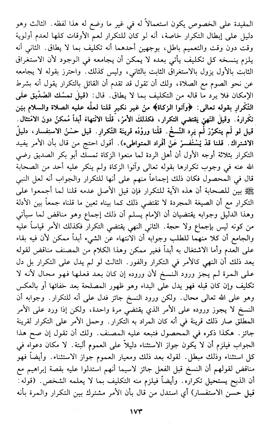 المقيدة على الخصوص يكون استعمالا له في غير ما وضع له هذا لفظه. الثالث وهو دليل على إبطال التكرار خاصة: أنه لو كان للتكرار لعم الأوقات كلها؛ لعدم أولوية وقت دون وقت والتعميم باطل بوجهين أحدهما: أنه تكليف بما لا يطاق. الثاني: أنه يلزم بنسخه كل تكليف يأتي بعده لا يمكن أن يجامعه في الوجود؛ لأن الاستغراق الثابت بالأول يزول بالاستغراق الثابت بالثاني، وليس كذلك. واحترز بقوله: لا يجامعه عن نحو الصوم مع الصلاة، ولك أن تقول: قد تقدم أن القائل بالتكرار يقول: إنه بشرط الإمكان فلا يرد ما قاله من التكليف بما لا يطاق. قال: "قيل: تمسك الصديق على التكرار بقوله تعالى: {وَآتَوُا الزَّكَاةَ} من غير نكير قلنا: لعله -عليه الصلاة والسلام- بين تكراره وقيل: النهي يقتضي التكرار، فكذلك الأمر, قلنا: الانتهاء أبدا ممكن دون الامتثال, قيل: لو لم يتكرر لم يرد النسخ, قلنا: وروده قرينة التكرار, قيل: حسن الاستفسار دليل الاشتراك, قلنا: قد يستفسر عن أفراد المتواطئ". أقول: احتج من قال بأن الأمر يفيد التكرار بثلاثة أوجه الأول: أن أهل الردة لما منعوا الزكاة تمسك أبو بكر الصديق رضي الله عنه في وجوب تكرارها بقوله تعالى: {وَآتَوُا الزَّكَاةَ} ولم ينكر عليه أحد من الصحابة. قال في المحصول: فكان ذلك إجماعا منهم على أنها للتكرار والجواب أنه لعل النبي -صلى الله عليه وسلم- بين للصحابة أن هذه الآية للتكرار, فإن قيل: الأصل عدمه قلنا: لما أجمعوا على التكرار مع أن الصيغة المجردة لا تقتضي ذلك كما بيناه تعين ما قلناه جمعا بين الأدلة, وهذا الدليل وجوابه يقتضيان أن الإمام يسلم أن ذلك إجماع وهو مناقض لما سيأتي من كونه ليس بإجماع ولا حجة. الثاني: النهي يقتضي التكرار فكذلك الأمر قياسا عليه والجامع أن كلا منهما للطلب, وجوابه أن الانتهاء عن الشيء أبدا ممكن؛ لأن فيه بقاء على العدم وأما الاشتغال به أبدا فغير ممكن, وهذا الكلام من المصنف مناقض لقوله بعد ذلك: إن النهي كالأمر في التكرار والفور. الثالث: لو لم يدل على التكرار بل دل على المرة, لم يجز ورود النسخ؛ لأن وروده إن كان بعد فعلها فهو محال لأنه لا تكليف وإن كان قبله فهو يدل على البداء وهو ظهور المصلحة بعد خفائها أو بالعكس, وهو على الله تعالى محال. ولكن ورود النسخ جائز فدل على أنه للتكرار, وجوابه أن النسخ لا يجوز وروده على الأمر الذي يقتضي مرة واحدة، ولكن إذا ورد على الأمر المطلق صار ذلك قرينة في أنه كان المراد به التكرار، وحمل الأمر على التكرار لقرينة جائز، هكذا ذكره في المحصول فتبعه عليه المصنف. ولك أن تقول: إن صح هذا الجواب فيلزم أن لا يكون جواز الاستثناء دليلا على العموم البتة، لا مكان دعواه في كل استثناء وذلك مبطل؛ لقوله بعد ذلك: ومعيار العموم جواز الاستثناء. وأيضا فهو مناقض لقولهم: إن النسخ قبل الفعل جائز لا سيما أنهم استدلوا عليه بقصة إبراهيم مع أن الذبح يستحيل تكراره. وأيضا فيلزم منه التكليف بما لا يعلمه الشخص. قوله: "قيل: حسن الاستفسار" أي: استدل من قال بأن الأمر مشترك بين التكرار والمرة بأنه