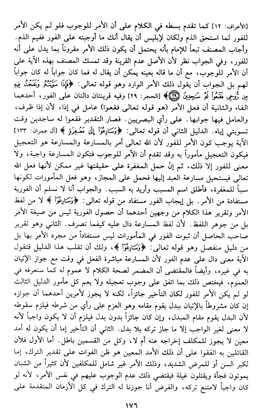 [الأعراف: 12] كما تقدم بسطه في الكلام على أن الأمر للوجوب, فلو لم يكن الأمر للفور لما استحق الذم ولكان لإبليس أو يقال: إنك ما أوجبته على الفور ففيم الذم؟ وأجاب المصنف تبعا للإمام بأنه يحتمل أن يكون ذلك الأمر مقرونا بما يدل على أنه للفور، وفي الجواب نظر لأن الأصل عدم القرينة وقد تمسك المصنف بهذه الآية على أن الأمر للوجوب، مع أن ما قاله بعينه يمكن أن يقال له: فما كان جوابا له كان جوابا لهم, بل الجواب أن يقول: ذلك الأمر الوارد وهو قوله تعالى: {فَإِذَا سَوَّيْتُهُ وَنَفَخْتُ فِيهِ مِنْ رُوحِي فَقَعُوا لَهُ سَاجِدِينَ} [الحجر: 29] وفيه قرينتان دالتان على الفور, إحداهما: الفاء والثانية: أن فعل الأمر "هو قوله تعالى: {فَقَعُوا} " عامل في إذا؛ لأن إذا ظرف، والعامل فيها جوابها على رأي البصريين، فصار التقدير: فقعوا له ساجدين وقت تسويتي إياه. الدليل الثاني: أن قوله تعالى: {وَسَارِعُوا إِلَى مَغْفِرَةٍ} [آل عمران: 133] الآية يوجب كون الأمر للفور؛ لأن الله تعالى أمر بالمسارعة والمسارعة هي التعجيل فيكون التعجيل مأمورا به وقد تقدم أن الأمر للوجوب فتكون المسارعة واجبة، ولا معنى للفور إلا ذلك، ثم إن حمل المغفرة على حقيقتها غير ممكن؛ لأنها فعل الله تعالى فيستحيل مسارعة العبد إليها فحمل على المجاز, وهو فعل المأمورات لكونها سببا للمغفرة، فأطلق اسم المسبب وأريد به السبب. والجواب: أنا لا نسلم أن الفورية مستفادة من الأمر, بل إيجاب الفور مستفاد من قوله تعالى: {وَسَارِعُوا} لا من لفظ الأمر وتقرير هذا الكلام من وجهين أحدهما: أن حصول الفورية ليس من صيغة الأمر بل من جوهر اللفظ؛ لأن لفظ المسارعة دال عليه كيفما تصرف. الثاني وهو تقرير صاحب الحاصل: أن ثبوت الفور في المأمورات ليس مستفادا من مجرد الأمر بها بل من دليل منفصل وهو قوله تعالى: {وَسَارِعُوا} ، ولك أن تقلب هذا الدليل فتقول: الآية معنى دال على عدم الفور؛ لأن المسارعة مباشرة الفعل في وقت مع جواز الإتيان به في غيره، وأيضا فالمقتضى أن المضمر لصحة الكلام لا عموم له كما سنعرفه في العموم، فيختص ذلك بما اتفق على وجوب تعجيله ولا يعم كل مأمور. الدليل الثالث: لو لم يكن الأمر للفور لكان التأخير جائزا، لكنه لا يجوز لأمرين, أحدهما: أن جوازه إن كان مشروطا بالإتيان ببدل يقوم مقامه وهو العزم على رأي من شرطه فيلزم سقوطه لأن البدل يقوم مقام المبدل، وإن كان جائزا بدون بدل فيلزم أن لا يكون واجبا؛ لأنه لا معنى لغير الواجب إلا ما جاز تركه بلا بدل. الثاني: أن التأخير إما أن يكون له أمد معين لا يجوز للمكلف إخراجه عنه أم لا، وكل من القسمين باطل. أما الأول فلأن القائلين به اتفقوا على أن ذلك الأمد المعين هو ظن الفوات على تقدير الترك, إما لكبر السن أو للمرض الشديد، وذلك الأمر غير شامل للمكلفين؛ لأن كثيرا من الشبان يموتون فجأة ويقتلون غيلة, فيقتضي ذلك عدم الوجوب عليهم في نفس الأمر؛ لأنه لو كان واجبا لامتنع تركه، والفرض أنا جوزنا له الترك في كل الأزمان المتقدمة على
