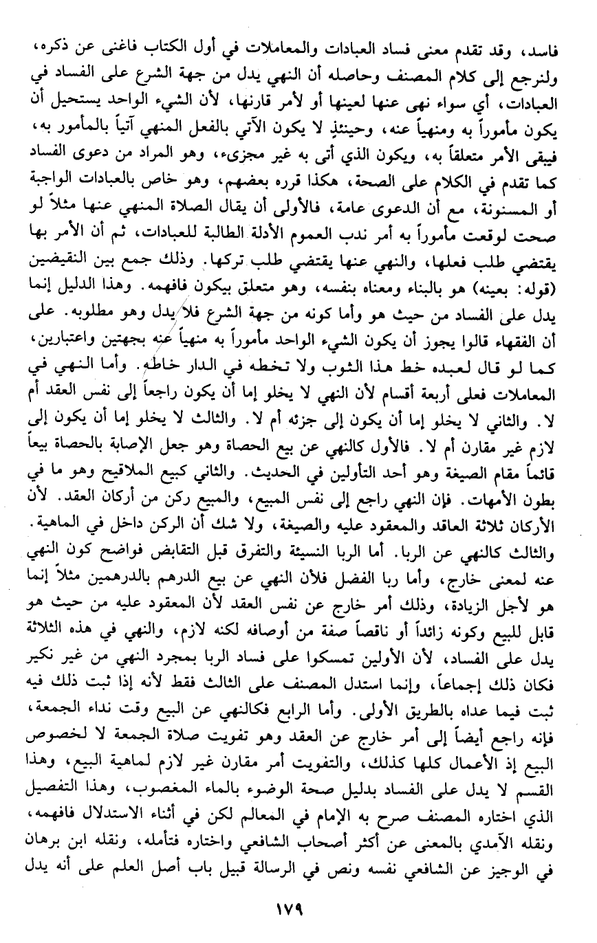 فاسد، وقد تقدم معنى فساد العبادات والمعاملات في أول الكتاب فأغنى عن ذكره، ولنرجع إلى كلام المصنف وحاصله أن النهي يدل من جهة الشرع على الفساد في العبادات، أي: سواء نهى عنها لعينها أو لأمر قارنها؛ لأن الشيء الواحد يستحيل أن يكون مأمورا به ومنهيا عنه، وحينئذ لا يكون الآتي بالفعل المنهي آتيا بالمأمور به، فيبقى الأمر متعلقا به، ويكون الذي أتى به غير مجزئ، وهو المراد من دعوى الفساد كما تقدم في الكلام على الصحة، هكذا قرره بعضهم، وهو خاص بالعبادات الواجبة أو المسنونة، مع أن الدعوى عامة، فالأولى أن يقال: الصلاة المنهي عنها مثلا لو صحت لوقعت مأمورا بها أمر ندب لعموم الأدلة الطالبة للعبادات، ثم إن الأمر بها يقتضي طلب فعلها، والنهي عنها يقتضي طلب تركها، وذلك جمع بين النقيضين. قوله: "بعينه" هو بالبناء ومعناه بنفسه, وهو متعلق بيكون فافهمه. وهذا الدليل إنما يدل على الفساد من حيث هو وأما كونه من جهة الشرع فلا يدل وهو مطلوبه، على أن الفقهاء قالوا: يجوز أن يكون الشيء الواحد مأمورا به منهيا عنه بجهتين واعتبارين، كما لو قال لعبده: خط هذا الثوب ولا تخطه في الدار خاطه. وأما النهي في المعاملات فعلى أربعة أقسام؛ لأن النهي لا يخلو إما أن يكون راجعا إلى نفس العقد أم لا. والثاني: لا يخلو إما أن يكون إلى جزئه أم لا. والثالث: لا يخلو إما أن يكون إلى لازم غير مقارن أم لا. فالأول كالنهي عن بيع الحصاة وهو جعل الإصابة بالحصاة بيعا قائما مقام الصيغة وهو أحد التأويلين في الحديث. والثاني كبيع الملاقيح وهو ما في بطون الأمهات، فإن النهي راجع إلى نفس المبيع، والمبيع ركن من أركان العقد؛ لأن الأركان ثلاثة: العاقد والمعقود عليه والصيغة، ولا شك أن الركن داخل في الماهية. والثالث: كالنهي عن الربا, أما الربا النسيئة والتفرق قبل التقابض فواضح كون النهي عنه لمعنى خارج، وأما ربا الفضل فلأن النهي عن بيع الدرهم بالدرهمين مثلا إنما هو لأجل الزيادة, وذلك أمر خارج عن نفس العقد لأن المعقود عليه من حيث هو قابل للبيع وكونه زائدا أو ناقصا صفة من أوصافه لكنه لازم، والنهي في هذه الثلاثة يدل على الفساد؛ لأن الأولين تمسكوا على فساد الربا بمجرد النهي من غير نكير فكان ذلك إجماعا، وإنما استدل المصنف على الثالث فقط؛ لأنه إذا ثبت ذلك فيه ثبت فيما عداه بالطريق الأولى. وأما الرابع فكالنهي عن البيع وقت نداء الجمعة، فإنه راجع أيضا إلى أمر خارج عن العقد وهو تفويت صلاة الجمعة لا لخصوص البيع, إذ الأعمال كلها كذلك، والتفويت أمر مقارن غير لازم لماهية البيع، وهذا القسم لا يدل على الفساد بدليل صحة الوضوء بالماء المغصوب، وهذا التفصيل الذي اختاره المصنف صرح به الإمام في المعالم لكن في أثناء الاستدلال فافهمه، ونقله الآمدي بالمعنى عن أكثر أصحاب الشافعي واختاره فتأمله، ونقله ابن برهان في الوجيز عن الشافعي نفسه ونص في الرسالة قبيل باب أصل العلم على أنه يدل