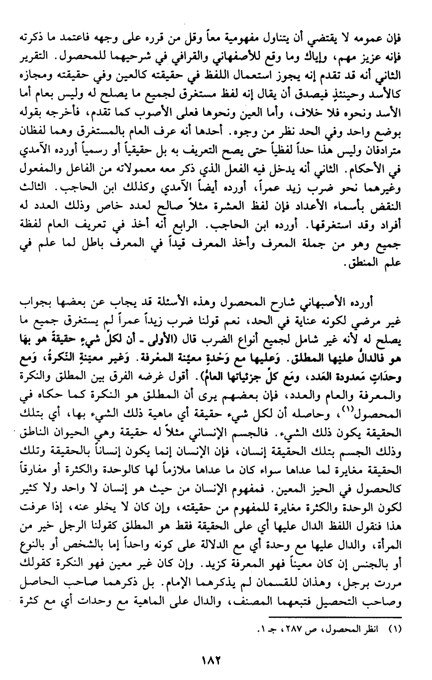 وأورده الأصبهاني شارح المحصول وهذه الأسئلة قد يجاب عن بعضها بجواب غير مرضٍ لكونه عناية في الحد، نعم قولنا: ضرب زيد عمرا لم يستغرق جميع ما يصلح له؛ لأنه غير شامل لجميع أنواع الضرب. قال: "الأولى: أن لكل شيء حقيقة هو بها هو, فالدال عليها المطلق, وعليها مع وحدة معينة المعرفة, وغير معينة النكرة، ومع وحدات معدودة العدد، ومع كل جزئياتها العام". أقول: غرضه الفرق بين المطلق والنكرة والمعرفة والعام والعدد، فإن بعضهم يرى أن المطلق هو النكرة كما حكاه في المحصول1، وحاصله أن لكل شيء حقيقة أي: ماهية ذلك الشيء بها، أي: بتلك الحقيقة يكون ذلك الشيء؛ فالجسم الإنساني مثلا له حقيقة وهي الحيوان الناطق, وذلك الجسم بتلك الحقيقة إنسان، فإن الإنسان إنما يكون إنسانا بالحقيقة وتلك الحقيقة مغايرة لما عداها سواء كان ما عداها ملازما لها كالوحدة والكثرة, أو مفارقا كالحصول في الحيز المعين. فمفهوم الإنسان من حيث هو إنسان لا واحد ولا كثير لكون الوحدة والكثرة مغايرة للمفهوم من حقيقته، وإن كان لا يخلو عنه، إذا عرفت هذا فنقول: اللفظ الدال عليها أي: على الحقيقة فقط هو المطلق كقولنا: الرجل خير من المرأة, والدال عليها مع وحدة أي: مع الدلالة على كونه واحدا, إما بالشخص أو بالنوع أو بالجنس إن كان معينا فهو المعرفة كزيد وإن كان غير معين فهو النكرة كقولك: مررت برجل، وهذان القسمان لم يذكرهما الإمام, بل ذكرهما صاحب الحاصل وصاحب التحصيل فتبعهما المصنف، والدال على الماهية مع وحدات أي: مع كثرة