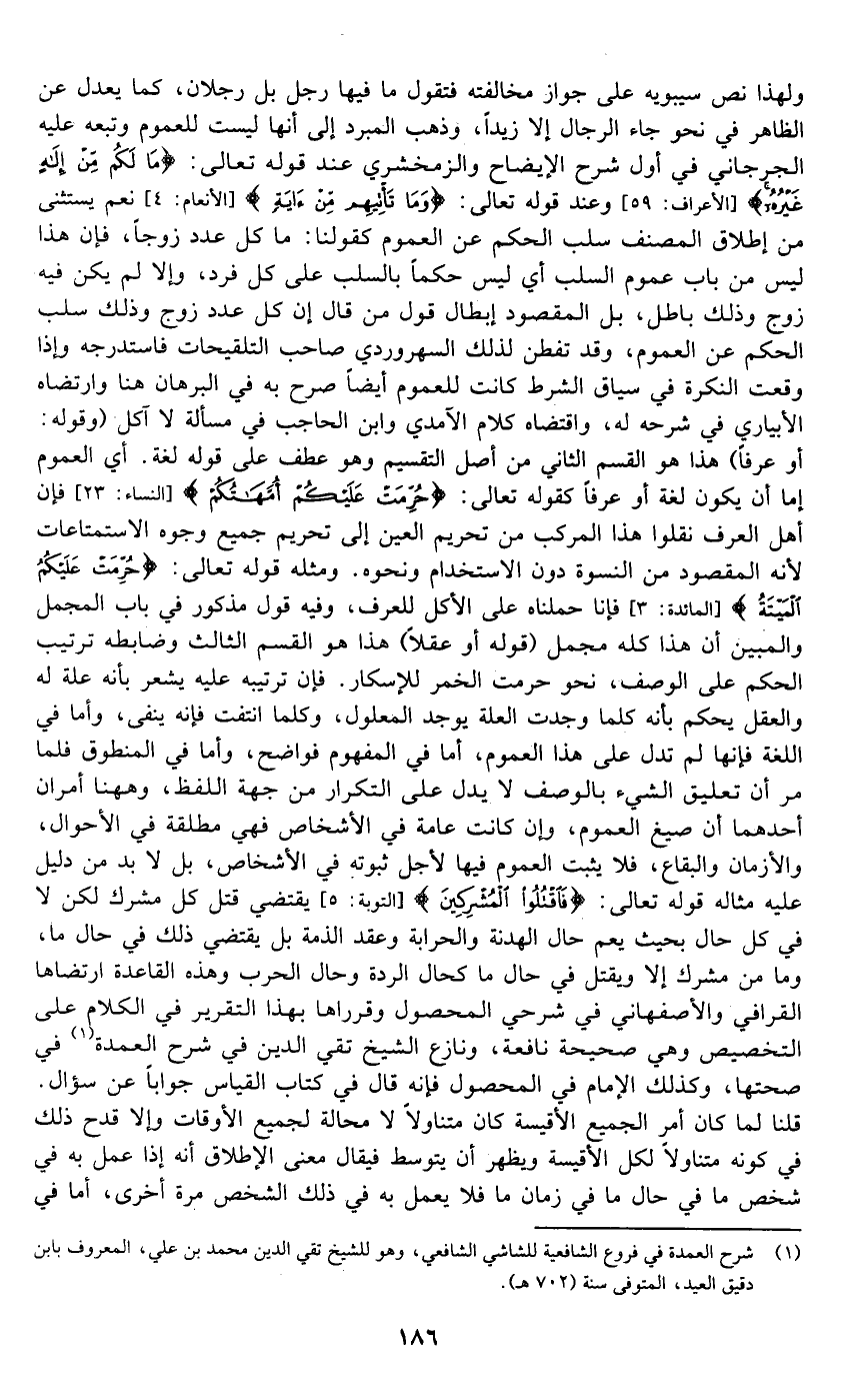 ولهذا نص سيبويه على جواز مخالفته فتقول: ما فيها رجل بل رجلان، كما يعدل عن الظاهر في نحو: جاء الرجال إلا زيدا، وذهب المبرد إلى أنها ليست للعموم وتبعه عليه الجرجاني في أول شرح الإيضاح والزمخشري عند قوله تعالى: {مَا لَكُمْ مِنْ إِلَهٍ غَيْرُهُ} [الأعراف: 59] وعند قوله تعالى: {وَمَا تَأْتِيهِمْ مِنْ آيَةٍ} [الأنعام: 4] نعم يستثنى من إطلاق المصنف سلب الحكم عن العموم كقولنا: ما كل عدد زوجا، فإن هذا ليس من باب عموم السلب أي: ليس حكما بالسلب على كل فرد, وإلا لم يكن فيه زوج وذلك باطل، بل المقصود إبطال قول من قال: إن كل عدد زوج وذلك سلب الحكم عن العموم، وقد تفطن لذلك السهروردي صاحب التلقيحات فاستدرجه وإذا وقعت النكرة في سياق الشرط كانت للعموم, أيضا صرح به في البرهان هنا وارتضاه الإبياري في شرحه له, واقتضاه كلام الآمدي وابن الحاجب في مسألة لا آكل. وقوله: "أو عرفا" هذا هو القسم الثاني من أصل التقسيم وهو عطف على قوله: لغة، أي: العموم إما أن يكون لغة أو عرفا كقوله تعالى: {حُرِّمَتْ عَلَيْكُمْ أُمَّهَاتُكُمْ} [النساء: 23] فإن أهل العرف نقلوا هذا المركب من تحريم العين إلى تحريم جميع وجوه الاستمتاعات؛ لأنه المقصود من النسوة دون الاستخدام ونحوه. ومثله قوله تعالى: {حُرِّمَتْ عَلَيْكُمُ الْمَيْتَةُ} [المائدة: 3] فإن حملناه على الأكل للعرف, وفيه قول مذكور في باب المجمل والمبين أن هذا كله مجمل. قوله: "أو عقلا" هذا هو القسم الثالث, وضابطه ترتيب الحكم على الوصف، نحو: حرمت الخمر للإسكار, فإن ترتيبه عليه يشعر بأنه علة له والعقل يحكم بأنه كلما وجدت العلة يوجد المعلول، وكلما انتفت فإنه ينتفي، وأما في اللغة فإنها لم تدل على هذا العموم، أما في المفهوم فواضح, وأما في المنطوق فلما مر من أن تعليق الشيء بالوصف لا يدل على التكرار من جهة اللفظ، وههنا أمران أحدهما: أن صيغ العموم وإن كانت عامة في الأشخاص فهي مطلقة في الأحوال والأزمان والبقاع, فلا يثبت العموم فيها لأجل ثبوته في الأشخاص, بل لا بد من دليل عليه مثاله قوله تعالى: {فَاقْتُلُوا الْمُشْرِكِينَ} [التوبة: 5] يقتضي قتل كل مشرك لكن لا في كل حال بحيث يعم حال الهدنة والحرابة وعقد الذمة بل يقتضي ذلك في حال ما, وما من مشرك إلا ويقتل في حال ما كحال الردة وحال الحرب, وهذه القاعدة ارتضاها القرافي والأصفهاني في شرحي المحصول وقرراها بهذا التقرير في الكلام على التخصيص وهي صحيحة نافعة، ونازع الشيخ تفي الدين في شرح العمدة1 في صحتها، وكذلك الإمام في المحصول فإنه قال في كتاب القياس جوابا عن سؤال: قلنا: لما كان أمر الجميع الأقيسة كان متناولا لا محالة لجميع الأوقات, وإلا قدح ذلك في كونه متناولا لكل الأقيسة, ويظهر أن يتوسط فيقال: معنى الإطلاق إنه إذا عمل به في شخص ما في حال ما في زمان ما فلا يعمل به في ذلك الشخص مرة أخرى، أما في
