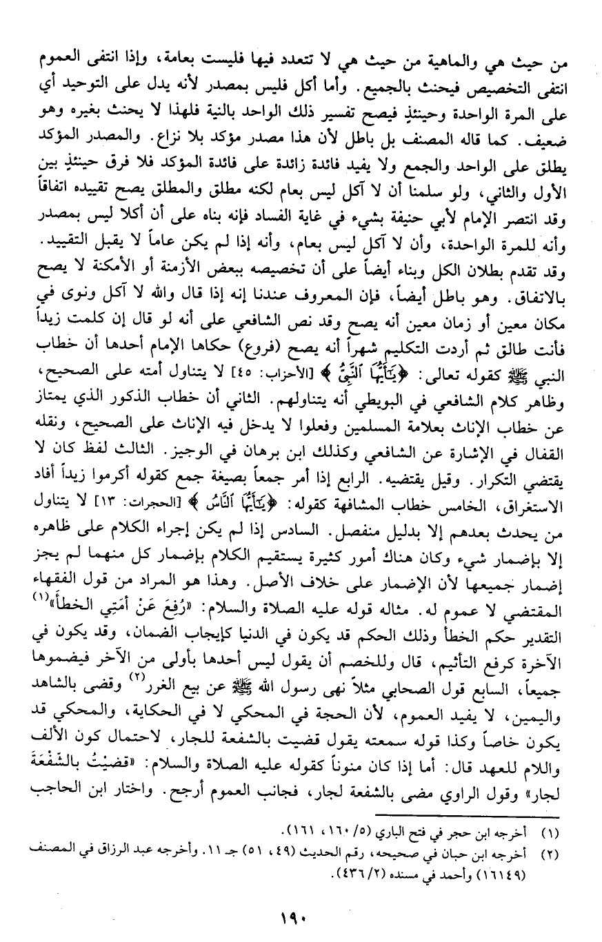 من حيث هي والماهية من حيث هي لا تتعدد فيها فليست بعامة، وإذا انتفى العموم انتفى التخصيص فيحنث بالجميع. وأما أكل فليس بمصدر؛ لأنه يدل على التوحيد أي: على المرة الواحدة وحينئذ فيصح تفسير ذلك الواحد بالنية, فلهذا لا يحنث بغيره وهو ضعيف كما قاله المصنف, بل باطل لأن هذا مصدر مؤكد بلا نزاع والمصدر المؤكد يطلق على الواحد والجمع ولا يفيد فائدة زائدة على فائدة المؤكد, فلا فرق حينئذ بين الأول والثاني، ولو سلمنا أن لا آكل ليس بعام لكنه مطلق والمطلق يصح تقييدا اتفاقا, وقد انتصر الإمام لأبي حنيفة بشيء في غاية الفساد, فإنه بناه على أن أكلا ليس بمصدر وأنه للمرة الواحدة, وأن لا آكل ليس بعام، وأنه إذا لم يكن عاما لا يقبل التقييد. وقد تقدم بطلان الكل وبناء أيضا على أن تخصيصه ببعض الأزمنة أو الأمكنة لا يصح بالاتفاق، وهو باطل أيضا، فإن المعروف عندنا أنه إذا قال: والله لا آكل ونوى في مكان معين أو زمان معين أنه يصح وقد نص الشافعي على أنه لو قال: إن كلمت زيدا فأنت طالق ثم أردت التكليم شهرا أنه يصح. "فروع" حكاها الإمام أحدها: أن خطاب النبي -صلى الله عليه وسلم- كقوله تعالى: {يَا أَيُّهَا النَّبِي} [الأحزاب: 45] لا يتناول أمته على الصحيح، وظاهر كلام الشافعي في البويطي أنه يتناولهم. والثاني: أن خطاب الذكور الذي يمتاز عن خطاب الإناث بعلامة المسلمين وفعلوا لا يدخل فيه الإناث على الصحيح، ونقله القفال في الإشارة عن الشافعي، وكذلك ابن برهان في الوجيز. الثالث: لفظ كان لا يقتضي التكرار وقيل: يقتضيه. الرابع: إذا أمر جمعا بصيغة جمع كقوله: أكرموا زيدا أفاد الاستغراق. الخامس: خطاب المشافهة كقوله: {يَا أَيُّهَا النَّاسُ} [الحجرات: 13] لا يتناول من يحدث بعدهم إلا بدليل منفصل. السادس: إذا لم يكن إجراء الكلام على ظاهره إلا بإضمار شيء وكان هناك أمور كثيرة يستقيم الكلام بإضمار كل منهما, لم يجز إضمار جميعها؛ لأن الإضمار على خلاف الأصل, وهذا هو المراد من قول الفقهاء: المقتضي لا عموم له, مثاله قوله -عليه الصلاة والسلام: "رفع عن أمتي الخطأ" 1 والتقدير: حكم الخطأ وذلك الحكم قد يكون في الدنيا كإيجاب الضمان، وقد يكون في الآخرة كرفع التأثيم، قال: وللخصم أن يقول: ليس أحدهما بأولى من الآخر فيضمونها جميعا. السابع: قول الصحابي مثلا: نهى رسول الله صلى الله عليه وسلم عن بيع الغرر2 وقضى بالشاهد واليمين، لا يفيد العموم؛ لأن الحجة في المحكي لا في الحكاية، والمحكي قد يكون خاصا، وكذا قوله: سمعته يقول: "قضيت بالشفعة للجار" لاحتمال كون الألف واللام للعهد قال: أما إذا كان منونا كقوله -عليه الصلاة والسلام: "قضيت بالشفعة لجار" وقول الراوي: "مضى بالشفعة لجار" فجانب العموم أرجح، واختار ابن الحاجب