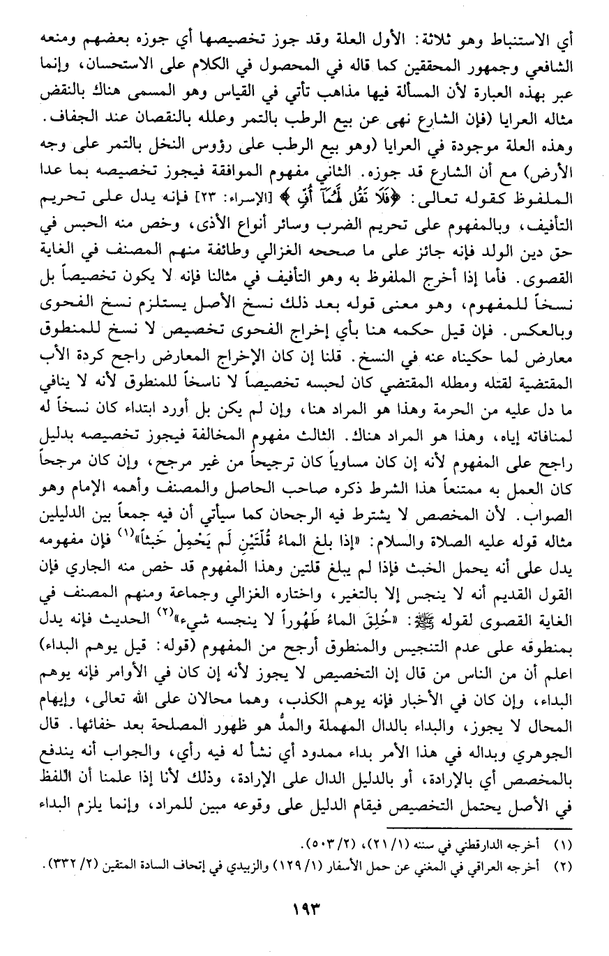 أي: الاستنباط وهو ثلاثة الأول: العلة وقد جوز تخصيصها أي: جوزه بعضهم ومنعه الشافعي وجمهور المحققين كما قاله في المحصول في الكلام على الاستحسان، وإنما عبر بهذه العبارة لأن المسألة فيها مذاهب تأتي في القياس وهو المسمى هناك بالنقض مثاله العرايا "فإن الشارع نهى عن بيع الرطب بالتمر وعلله بالنقصان عند الجفاف" وهذه العلة موجودة في العرايا "هو بيع الرطب على رءوس النخل بالتمر على وجه الأرض" مع أن الشارع قد جوزه. الثاني: مفهوم الموافقة فيجوز تخصيصه بما عدا الملفوظ كقوله تعالى: {فَلا تَقُلْ لَهُمَا أُفٍّ} [الإسراء: 23] فإنه يدل على تحريم التأفيف، وبالمفهوم على تحريم الضرب وسائر أنواع الأذى، وخص منه الحبس في حق دين الولد فإنه جائز على ما صححه الغزالي وطائفة, منهم المصنف في الغاية القصوى. فأما إذا أخرج الملفوظ به وهو التأفيف في مثالنا فإنه لا يكون تخصيصا بل نسخا للمفهوم، وهو معنى قوله بعد ذلك: نسخ الأصل يستلزم نسخ الفحوى وبالعكس. فإن قيل: حكمه هنا بأي إخراج الفحوى تخصيص لا نسخ للمنطوق معارض لما حكيناه عنه في النسخ. قلنا: إن كان الإخراج المعارض راجحا كردة الأب المقتضية لقتله ومطله المقتضي كان لحبسه تخصيصا لا ناسخا للمنطوق لأنه لا ينافي ما دل عليه من الحرمة وهذا هو المراد هنا، وإن لم يكن بل أورد ابتداء كان نسخا له لمنافاته إياه، وهذا هو المراد هناك. الثالث: مفهوم المخالفة فيجوز تخصيصه بدليل راجح على المفهوم؛ لأنه إن كان مساويا كان ترجيحا من غير مرجح، وإن كان مرجحا كان العمل به ممتنعا, هذا الشرط ذكره صاحب الحاصل والمصنف وأهمله الإمام وهو الصواب؛ لأن المخصص لا يشترط فيه الرجحان كما سيأتي أن فيه جمعا بين الدليلين مثاله قوله -عليه الصلاة والسلام: "إذا بلغ الماء قلتين لم يحمل خبثا" 1 فإن مفهومه يدل على أنه يحمل الخبث فإذا لم يبلغ قلتين, وهذا المفهوم قد خص منه الجاري فإن القول القديم أنه لا ينجس إلا بالتغير، واختاره الغزالي وجماعة ومنهم المصنف في الغاية القصوى لقوله -صلى الله عليه وسلم: "خلق الماء طهورا لا ينجسه شيء" 2 الحديث, فإنه يدل بمنطوقه على عدم التنجيس والمنطوق أرجح من المفهوم. قوله: "قيل: يوهم البداء" اعلم أن من الناس من قال: إن التخصيص لا يجوز لأنه إن كان في الأوامر فإنه يوهم البداء، وإن كان في الأخبار فإنه يوهم الكذب, وهم محالان على الله تعالى، وإيهام المحال لا يجوز، والبداء بالدال المهملة والمد هو ظهور المصلحة بعد خفائها, قال الجوهري: وبدا له في هذا الأمر بداء, ممدود أي: نشأ له فيه رأي، والجواب أنه يندفع بالمخصص أي بالإرادة، أو بالدليل الدال على الإرادة، وذلك لأنا إذا علمنا أن اللفظ في الأصل يحتمل التخصيص فيقام الدليل على وقوعه مبينا للمراد، وإنما يلزم البداء