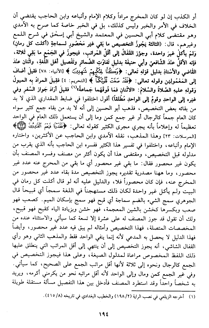 أو الكذب إن لو كان المخرج مرادا وكلام الإمام وأتباعه وابن الحاجب يقتضي أن الخلاف في الأمر والخبر وليس كذلك، بل في الخبر خاصة كما صرح به الآمدي وهو مقتضى كلام أبي الحسين في المعتمد والشيخ أبي إسحاق في شرح اللمع وغيرهم. قال: "الثالثة: يجوز التخصيص ما بقي غير محصور لسماجة "أكلت كل رمان" ولم يأكل غير واحدة، وجوز القفال إلى أقل المراتب، فيجوز في الجمع ما بقي ثلاثة، فإنه الأقل عند الشافعي وأبي حنيفة بدليل تفاوت الضمائر وتفصيل أهل اللغة، واثنان عند القاضي والأستاذ بدليل قوله تعالى: {وَكُنَّا لِحُكْمِهِمْ شَاهِدِينَ} [الأنبياء: 78] فقيل: أضاف إلى المعمولين وقوله تعالى: {فَقَدْ صَغَتْ قُلُوبُكُمَا} [التحريم: 4] فقيل: المراد به الميول وقوله عليه الصلاة والسلام: "الاثنان فما فوقهما جماعة" 1 فقيل: أراد جواز السفر وفي غيره إلى الواحد وقوم إلى الواحد مطلقا". أقول: اختلفوا في الضابط المقداري الذي لا بد من بقائه بعد التخصيص، فذهب أبو الحسين إلى أنه لا بد من بقاء جمع كثير سواء كان العام جمعا كالرجال أو غير جمع كمن وما إلى أن يستعمل ذلك العام في الواحد تعظيما له وإعلاما بأنه يجري مجرى الكثير كقوله تعالى: {فَقَدَرْنَا فَنِعْمَ الْقَادِرُونَ} [المرسلات: 23] وهذا المذهب نقله الآمدي وابن الحاجب عن الأكثرين, واختاره الإمام وأتباعه, واختلفوا في تفسير هذا الكثير ففسره ابن الحاجب بأنه الذي يقرب من مدلوله قبل التخصيص، ومقتضى هذا أن يكون أكثر من مصنف وفسره المصنف بأن يكون غير محصور فقال: ما بقي غير محصور أي: ما بقي من المخرج عنه عدد غير محصور، وما ههنا مصدرية تقديرية يجوز التخصيص مدة بقاء عدد غير محصور من المخرج عنه، فإن كان محصورا فلا، والدليل عليه أنه لو قال: أكلت كل رمان في البيت ولم يأكل غير واحدة لكان ذلك مستهجنا في اللغة سمجا أي: قبيحا, قال الجوهري: سمج الشيء بالضم سماجة أي: قبح فهو سمج بإسكان الميم, كصعب فهو صعب وبكسرها كخشن بالشين المعجمة، فهو خشن وبزيادة الياء كقبح فهو قبيح، ولك أن تقول: قد جوز المصنف له على عشرة إلا تسعة كما سيأتي والاستثناء عنده من المخصصات المتصلة، فهذا التخصيص وأمثاله لم يبق فيه عدد غير محصور، وأيضا فهذا الدليل لا يحصل به المدعي؛ لأنه إنما ينفي الواحد فقط. والمذهب الثاني وهو رأي القفال الشاشي: أنه يجوز التخصيص إلى أن ينتهي إلى أقل المراتب التي ينطلق عليها ذلك اللفظ المخصوص مراعاة لمدلول الصيغة, وعلى هذا فيجوز التخصيص في الجمع كالرجال ونحوه إلى ثلاثة؛ لأنها أقل مراتب الجمع على الصحيح، كما سيأتي، وفي غير الجمع كمن ومال وإلى الواحد لأنه أقل مراتبه نحو: من يكرمني أكرمه، ويريد به شخصا واحدا وقد استطرد المصنف فأدخل بين هذا التفصيل مسألة مستقلة طويلة