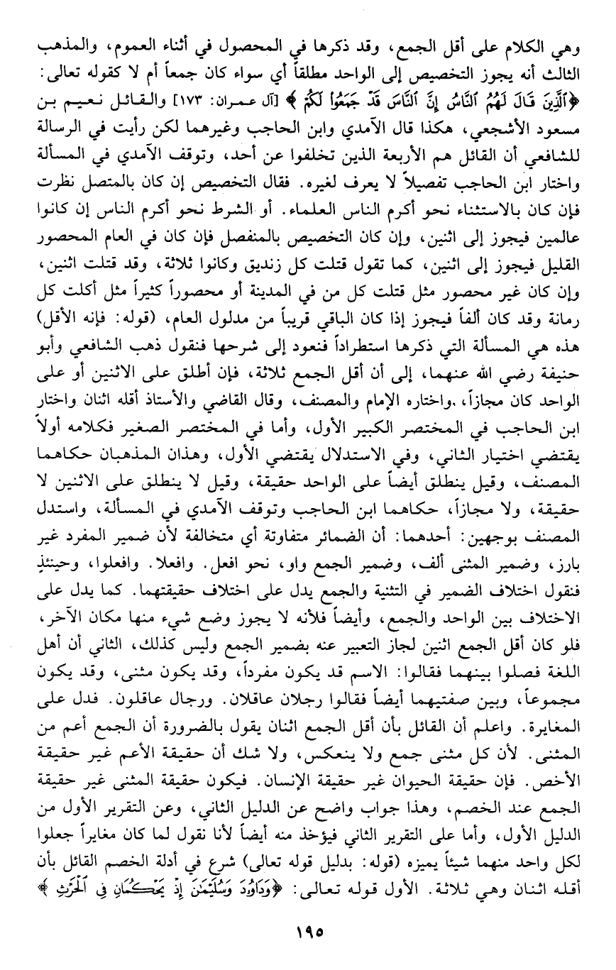 وهي الكلام على أقل الجمع، وقد ذكرها في المحصول في أثناء العموم. والمذهب الثالث: أنه يجوز التخصيص إلى الواحد مطلقا أي: سواء كان جمعا أم لا كقوله تعالى: {الَّذِينَ قَالَ لَهُمُ النَّاسُ إِنَّ النَّاسَ قَدْ جَمَعُوا لَكُمْ} [آل عمران: 173] والقائل نعيم بن مسعود الأشجعي، هكذا قال الآمدي وابن الحاجب وغيرهما, لكن رأيت في الرسالة للشافعي أن القائل هم الأربعة الذين تخلفوا عن أحد، وتوقف الآمدي في المسألة واختار ابن الحاجب تفصيلا لا يعرف لغيره, فقال: التخصيص إن كان بالمتصل نظرت فإن كان بالاستثناء نحو: أكرم الناس العلماء, أو الشرط نحو: أكرم الناس إن كانوا عالمين فيجوز إلى اثنين، وإن كان التخصيص بالمنفصل فإن كان في العام المحصور القليل فيجوز إلى اثنين, كما تقول: قتلت كل زنديق وكانوا ثلاثة، وقد قتلت اثنين، وإن كان غير محصور مثل: قتلت كل من في المدينة, أو محصورا كثيرا مثل: أكلت كل رمانة وقد كان ألفا فيجوز إذا كان الباقي قريبا من مدلول العام. قوله: "فإنه الأقل" هذه هي المسألة التي ذكرها استطرادا فنعود إلى شرحها فنقول: ذهب الشافعي وأبو حنيفة رضي الله عنهما إلى أن أقل الجمع ثلاثة, فإن أطلق على الاثنين أو على الواحد كان مجازا، واختاره الإمام والمصنف، وقال القاضي والأستاذ: أقله اثنان واختار ابن الحاجب في المختصر الكبير الأول، وأما في المختصر الصغير فكلامه أولا يقتضي اختيار الثاني، وفي الاستدلال يقتضي الأول، وهذان المذهبان حكاهما المصنف, وقيل: ينطبق أيضا على الواحد حقيقة، وقيل: لا ينطبق على الاثنين لا حقيقة ولا مجازا، حكاهما ابن الحاجب وتوقف الآمدي في المسألة، واستدل المصنف بوجهين, أحدهما: أن الضمائر متفاوتة أي: متخالفة؛ لأن ضمير المفرد غير بارز، وضمير المثنى ألف، وضمير الجمع واو نحو: افعل وافعلا وافعلوا، وحينئذ فنقول: اختلاف الضمير في التثنية والجمع يدل على اختلاف حقيقتهما, كما يدل على الاختلاف بين الواحد والجمع، وأيضا فلأنه لا يجوز وضع شيء منها مكان الآخر فلو كان أقل الجمع اثنين لجاز التعبير عنه بضمير الجمع وليس كذلك. الثاني: أن أهل اللغة فصلوا بينهما فقالوا: الاسم قد يكون مفردا، وقد يكون مثنى، وقد يكون مجموعا، وبين صفتيهما أيضا فقالوا: رجلان عاقلان، ورجال عاقلون, فدل على المغيرة. واعلم أن القائل بأن أقل الجمع اثنان يقول بالضرورة: إن الجمع أعم من المثنى؛ لأن كل مثنى جمع ولا ينعكس، ولا شك أن حقيقة الأعم غير حقيقة الأخص، فإن حقيقة الحيوان غير حقيقة الإنسان, فيكون حقيقة المثنى غير حقيقة الجمع عند الخصم، وهذا جواب واضح عن الدليل الثاني، وعن التقرير الأول من الدليل الأول، وأما على التقرير الثاني فيؤخذ منه أيضا؛ لأنا نقول: لما كان مغايرا جعلوا لكل واحد منهما شيئا يميزه. قوله: "بدليل قوله تعالى: {شَرَعَ} في أدلة الخصم القائل بأن أقله اثنان وهي ثلاثة, الأول: قوله تعالى: {وَدَاوُدَ وَسُلَيْمَانَ إِذْ يَحْكُمَانِ فِي الْحَرْثِ}