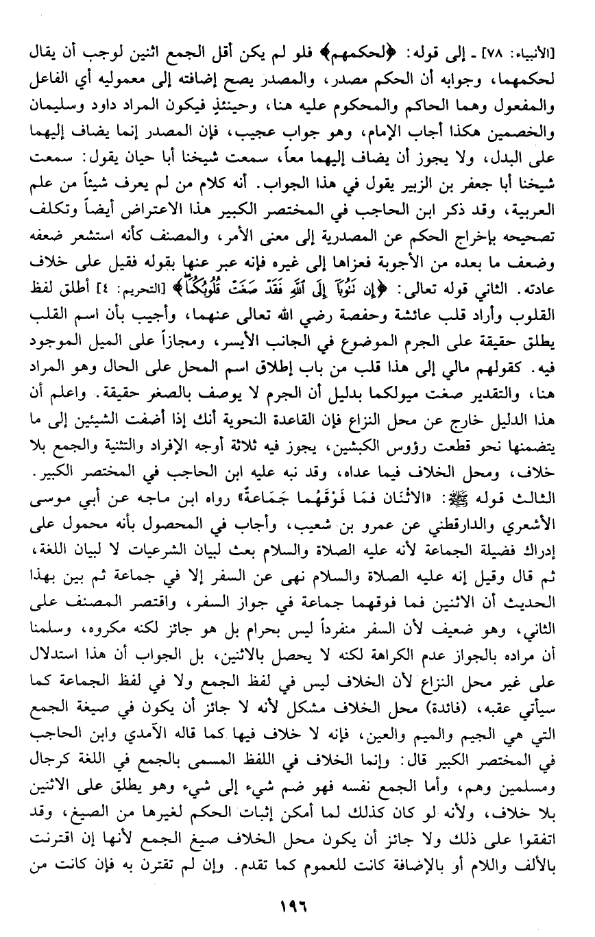 [الأنبياء: 78] إلى قوله: {لِحُكْمِهِمْ} فلو لم يكن أقل الجمع اثنين لوجب أن يقال: لحكمهما، وجوابه أن الحكم مصدر, والمصدر يصح إضافته إلى معموليه أي الفاعل والمفعول وهما الحاكم والمحكوم عليه هنا، وحينئذ فيكون المراد داود وسليمان والخصمين هكذا أجاب الإمام، وهو جواب عجيب، فإن المصدر إنما يضاف إليهما على البدل، ولا يجوز أن يضاف إليهما معا، سمعت شيخنا أبا حيان يقول: سمعت شيخنا أبا جعفر بن الزبير يقول في هذا الجواب: إنه كلام من لم يعرف شيئا من علم العربية، وقد ذكر ابن الحاجب في المختصر الكبير هذا الاعتراض أيضا وتكلف تصحيحه بإخراج الحكم عن المصدرية إلى معنى الأمر، والمصنف كأنه استشعر ضعفه وضعف ما بعده من الأجوبه فعزاها إلى غيره, فإنه عبر عنها بقوله: فقيل على خلاف عادته. الثاني: قوله تعالى: {إِنْ تَتُوبَا إِلَى اللَّهِ فَقَدْ صَغَتْ قُلُوبُكُمَا} [التحريم: 4] أطلق لفظ القلوب وأراد قلب عائشة وحفصة -رضي الله تعالى عنهما- وأجيب بأن اسم القلب يطلق حقيقة على الجرم الموضوع في الجانب الأيسر, ومجازا على الميل الموجود فيه كقولهم: ما لي إلى هذا قلب من باب إطلاق اسم المحل على الحال وهو المراد هنا، والتقدير: صغت ميولكما بدليل أن الجرم لا يوصف بالصغر حقيقة. واعلم أن هذا الدليل خارج عن محل النزاع فإن القاعدة النحوية أنك إذا أضفت الشيئين إلى ما يتضمنها نحو قطعت رءوس الكبشين، ويجوز فيه ثلاثة أوجه: الإفراد والتثنية والجمع بلا خلاف، ومحل الخلاف فيما عداه، وقد نبه عليه ابن الحاجب في المختصر الكبير. الثالث: قوله صلى الله عليه وسلم: "الاثنان فما فوقهما جماعة" رواه ابن ماجه عن أبي موسى الأشعري والدارقطني عن عمرو بن شعيب، وأجاب في المحصول بأنه محمول على إدراك فضيلة الجماعة؛ لأنه عليه الصلاة والسلام بعث لبيان الشرعيات لا لبيان اللغة، ثم قال: وقيل: إنه عليه الصلاة والسلام نهى عن السفر إلا في جماعة ثم بين بهذا الحديث أن الاثنين فما فوقهما جماعة في جواز السفر, واقتصر المصنف على الثاني وهو ضعيف؛ لأن السفر منفردا ليس بحرام بل هو جائز لكنه مكروه, وسلمنا أن مراده بالجواز عدم الكراهة لكنه لا يحصل بالاثنين، بل الجواب أن هذا استدلال على غير محل النزاع؛ لأن الخلاف ليس في لفظ الجمع ولا في لفظ الجماعة كما سيأتي عقبه. "فائدة": محل الخلاف مشكل؛ لأنه لا جائز أن يكون في صيغة الجمع التي هي الجيم والميم والعين، فإنه لا خلاف فيها كما قاله الآمدي وابن الحاجب في المختصر الكبير, قال: وإنما الخلاف في اللفظ المسمى بالجمع في اللغة كرجال ومسلمين وهم، وأما الجمع نفسه فهو ضم شيء إلى شيء وهو يطلق على الاثنين بلا خلاف، ولأنه لو كان كذلك لما أمكن إثبات الحكم لغيرها من الصيغ، وقد اتفقوا على ذلك ولا جائز أن يكون محل الخلاف صيغ الجمع؛ لأنها إن اقترنت بالألف واللام أو بالإضافة كانت للعموم كما تقدم، وإن لم تقترن به فإن كانت من