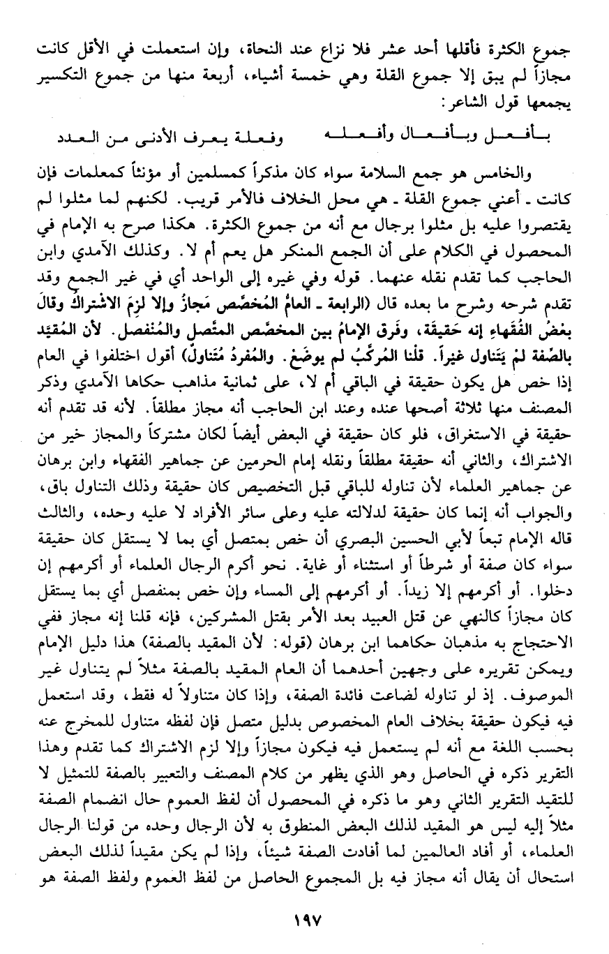 والخامس: هو جمع السلامة سواء كان مذكرا كمسلمين, أو مؤنثا كمعلمات فإن كانت -أعني جموع القلة- هي محل الخلاف فالأمر قريب, لكنهم لما مثلوا لم يقتصروا عليه بل مثلوا برجال مع أنه من جموع الكثرة. هكذا صرح به الإمام في المحصول في الكلام على أن الجمع المنكر هل يعم أم لا؟ وكذلك الآمدي وابن الحاجب كما تقدم نقله عنهما. قوله: وفي غيره إلى الواحد أي: في غير الجمع وقد تقدم شرحه وشرح ما بعده. قال: "الرابعة: العام المخصص مجاز وإلا لزم الاشتراك, وقال بعض الفقهاء: إنه حقيقة، وفرق الإمام بين المخصص المتصل والمنفصل؛ لأن المقيد بالصفة لم يتناول غيرا، قلنا: المركب لم يوضع, والمفرد متناول". أقول: اختلفوا في العام إذا خص: هل يكون حقيقة في الباقي أم لا؟ على ثمانية مذاهب حكاها الآمدي وذكر المصنف منها ثلاثة, أصحها عنده وعند ابن الحاجب أنه مجاز مطلقا؛ لأنه قد تقدم أنه حقيقة في الاستغراق، فلو كان حقيقة في البعض أيضا لكان مشتركا والمجاز خير من الاشتراك. والثاني: أنه حقيقة مطلقا ونقله إمام الحرمين عن جماهير الفقهاء وابن برهان عن جماهير العلماء؛ لأن تناوله للباقي قبل التخصيص كان حقيقة وذلك التناول باق، والجواب أنه إنما كان حقيقة لدلالته عليه وعلى سائر الأفراد لا عليه وحده. والثالث قاله الإمام تبعا لأبي الحسين البصري: إن خص بمتصل أي: بما لا يستقل كان حقيقة سواء كان صفة أو شرطا أو استثناء أو غاية نحو: أكرم الرجال العلماء أو أكرمهم إن دخلوا أو أكرمهم إلا زيدا, أو أكرمهم إلى المساء, وإن خص بمنفصل أي: بما يستقل كان مجازا كالنهي عن قتل العبيد بعد الأمر بقتل المشركين, فإنه قلنا: إنه مجاز, ففي الاحتجاج به مذهبان حكاهما ابن برهان. قوله: "لأن المقيد بالصفة" هذا دليل الإمام، ويمكن تقريره على وجهين أحدهما: أن العام المقيد بالصفة مثلا لم يتناول غير الموصوف, إذ لو تناوله لضاعت فائدة الصفة, وإذا كان متناولا له فقط، وقد استعمل فيه فيكون حقيقة بخلاف العام المخصوص بدليل متصل فإن لفظه متناول للمخرج عنه بحسب اللغة مع أنه لم يستعمل فيه فيكون مجازًا, وإلا لزم الاشتراك كما تقدم وهذا التقرير ذكره في الحاصل وهو الذي يظهر من كلام المصنف والتعبير بالصفة للتمثيل لا للتقيد. التقرير الثاني وهو ما ذكره في المحصول: أن لفظ العموم حال انضمام الصفة مثلا إليه ليس هو المقيد لذلك البعض المنطوق به؛ لأن الرجال وحده من قولنا: الرجال العلماء، أو أفاد العالمين لما أفادت الصفة شيئا، وإذا لم يكن مقيدا لذلك البعض استحال أن يقال: إنه مجاز فيه بل المجموع الحاصل من لفظ العموم ولفظ الصفة هو