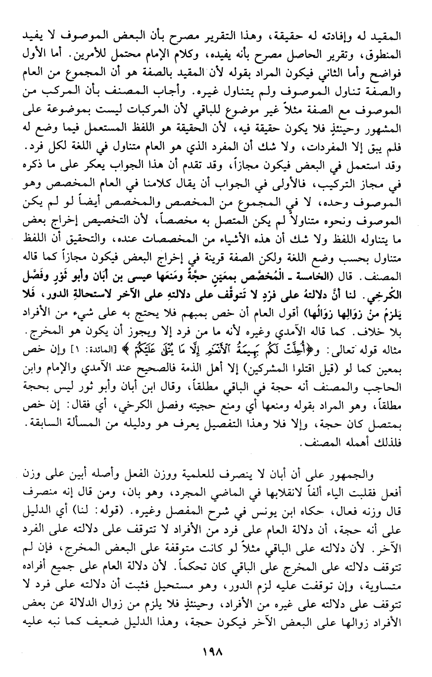 المقيد له وإفادته له حقيقة، وهذا التقرير مصرح بأن البعض الموصوف لا يفيد المنطوق، وتقرير الحاصل مصرح بأنه يفيده، وكلام الإمام محتمل للأمرين، أما الأول فواضح, وأما الثاني فيكون المراد بقوله: لأن المقيد بالصفة هو أن المجموع من العام والصفة تناول الموصوف ولم يتناول غيره. وأجاب المصنف بأن المركب من الموصوف مع الصفة مثلا غير موضوع للباقي؛ لأن المركبات ليست بموضوعة على المشهور وحينئذ فلا يكون حقيقة فيه؛ لأن الحقيقة هو اللفظ المستعمل فيما وضع له فلم يبق إلا المفردات، ولا شك أن المفرد الذي هو العام متناول في اللغة لكل فرد, وقد استعمل في البعض فيكون مجازا، وقد تقدم أن هذا الجواب يعكر على ما ذكره في مجاز التركيب، فالأولى في الجواب أن يقال: كلامنا في العام المخصص وهو الموصوف وحده، لا في المجموع من المخصص والمخصص أيضا لو لم يكن الموصوف ونحوه متناولا لم يكن المتصل به مخصصا، لأن التخصيص إخراج بعض ما يتناوله اللفظ ولا شك أن هذه الأشياء من المخصصات عنده, والتحقيق أن اللفظ متناول بحسب وضع اللغة ولكن الصفة قرينة في إخراج البعض فيكون مجازا كما قاله المصنف. قال: "الخامسة: المخصص بمعين حجة ومنعها عيسى بن أبان وأبو ثور وفصل الكرخي. لنا أن دلالته على فرد لا تتوقف على دلالته على الآخر لاستحالة الدور, فلا يلزم من زوالها زوالها". أقول: العام إن خص بمبهم فلا يحتج به على شيء من الأفراد بلا خلاف، كما قاله الآمدي وغيره؛ لأنه ما من فرد إلا ويجوز أن يكون هو المخرج, مثاله قوله تعالى: {أُحِلَّتْ لَكُمْ بَهِيمَةُ الْأَنْعَامِ إِلَّا مَا يُتْلَى عَلَيْكُمْ} [المائدة: 1] وإن خص بمعين كما لو "قيل: اقتلوا المشركين" إلا أهل الذمة, فالصحيح عند الآمدي والإمام وابن الحاجب والمصنف أنه حجة في الباقي مطلقا، وقال ابن أبان وأبو ثور: ليس بحجة مطلقا، وهو المراد بقوله: ومنعها أي: ومنع حجيته وفصل الكرخي، أي: فقال: إن خص بمتصل كان حجة وإلا فلا, وهذا التفصيل يعرف هو ودليله من المسألة السابقة؛ فلذلك أهمله المصنف.