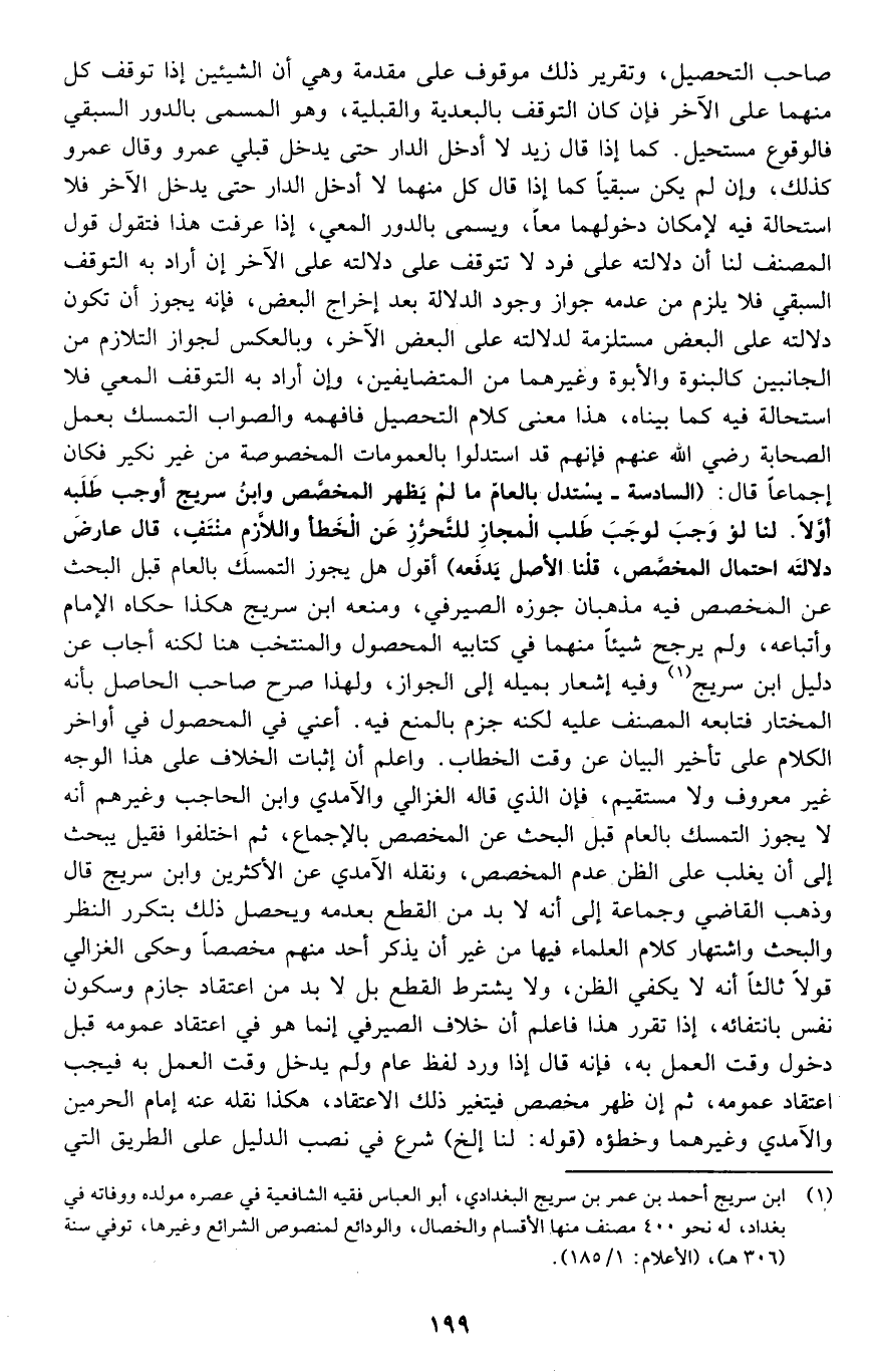 صاحب التحصيل، وتقرير ذلك موقوف على مقدمة وهي أن الشيئين إذا توقف كل منهما على الآخر فإن كان التوقف بالبعدية والقبلية، وهو المسمى بالدور السبقي فالوقوع مستحيل، كما إذا قال زيد: لا أدخل الدار حتى يدخل قبلي عمرو وقال عمرو كذلك، وإن لم يكن سبقيا كما إذا قال كل منهما: لا أدخل الدار حتى يدخل الآخر فلا استحالة فيه لإمكان دخولهما معا، ويسمى بالدور المعي، إذا عرفت هذا فتقول: قول المصنف لنا: إن دلالته على فرد لا تتوقف على دلالته على الآخر إن أراد به التوقف السبقي فلا يلزم من عدمه جواز وجود الدلالة بعد إخراج البعض, فإنه يجوز أن تكون دلالته على البعض مستلزمة لدلالته على البعض الآخر, وبالعكس لجواز التلازم من الجانبين كالبنوة والأبوة وغيرهما من المتضايفين, وإن أراد به التوقف المعي فلا استحالة فيه كما بيناه، هذا معنى كلام التحصيل فافهمه, والصواب التمسك بعمل الصحابة رضي الله عنهم فإنهم قد استدلوا بالعمومات المخصوصة من غير نكير فكان إجماعا. قال: "السادسة: يستدل بالعام ما لم يظهر المخصص, وابن سريج أوجب طلبه أولا. لنا لو وجب لوجب طلب المجاز للتحرز عن الخطأ واللازم منتف، قال: عارض دلالته احتمال المخصص، قلنا: الأصل يدفعه". أقول: هل يجوز التمسك بالعام قبل البحث عن المخصص؟ فيه مذهبان جوزه الصيرفي، ومنعه ابن سريج هكذا حكاه الإمام وأتباعه، ولم يرجح شيئا منهما في كتابيه المحصول والمنتخب هنا, لكنه أجاب عن دليل ابن سريج1 وفيه إشعار بميله إلى الجواز؛ ولهذا صرح صاحب الحاصل بأنه المختار فتابعه المصنف عليه لكنه جزم بالمنع فيه, أعني في المحصول في أواخر الكلام على تأخير البيان عن وقت الخطاب. واعلم أن إثبات الخلاف على هذا الوجه غير معروف ولا مستقيم، فإن الذي قاله الغزالي والآمدي وابن الحاجب وغيرهم أنه لا يجوز التمسك بالعام قبل البحث عن المخصص بالإجماع، ثم اختلفوا فقيل: يبحث إلى أن يغلب على الظن عدم المخصص، ونقله الآمدي عن الأكثرين وابن سريج قال: وذهب القاضي وجماعة إلى أنه لا بد من القطع بعدمه ويحصل ذلك بتكرر النظر والبحث واشتهار كلام العلماء فيها من غير أن يذكر أحد منهم مخصصا, وحكى الغزالي قولا ثالثا: أنه لا يكفي الظن، ولا يشترط القطع بل لا بد من اعتقاد جازم وسكون نفس بانتفائه، إذا تقرر هذا فاعلم أن خلاف الصيرفي إنما هو في اعتقاد عمومه قبل دخول وقت العمل به، فإنه قال: إذا ورد لفظ عام ولم يدخل وقت العمل به فيجب اعتقاد عمومه، ثم إن ظهر مخصص فيتغير ذلك الاعتقاد، هكذا نقله عنه إمام الحرمين والآمدي وغيرهما وخطئوه. قوله: "لنا ... إلخ" شرع في نصب الدليل على الطريق التي