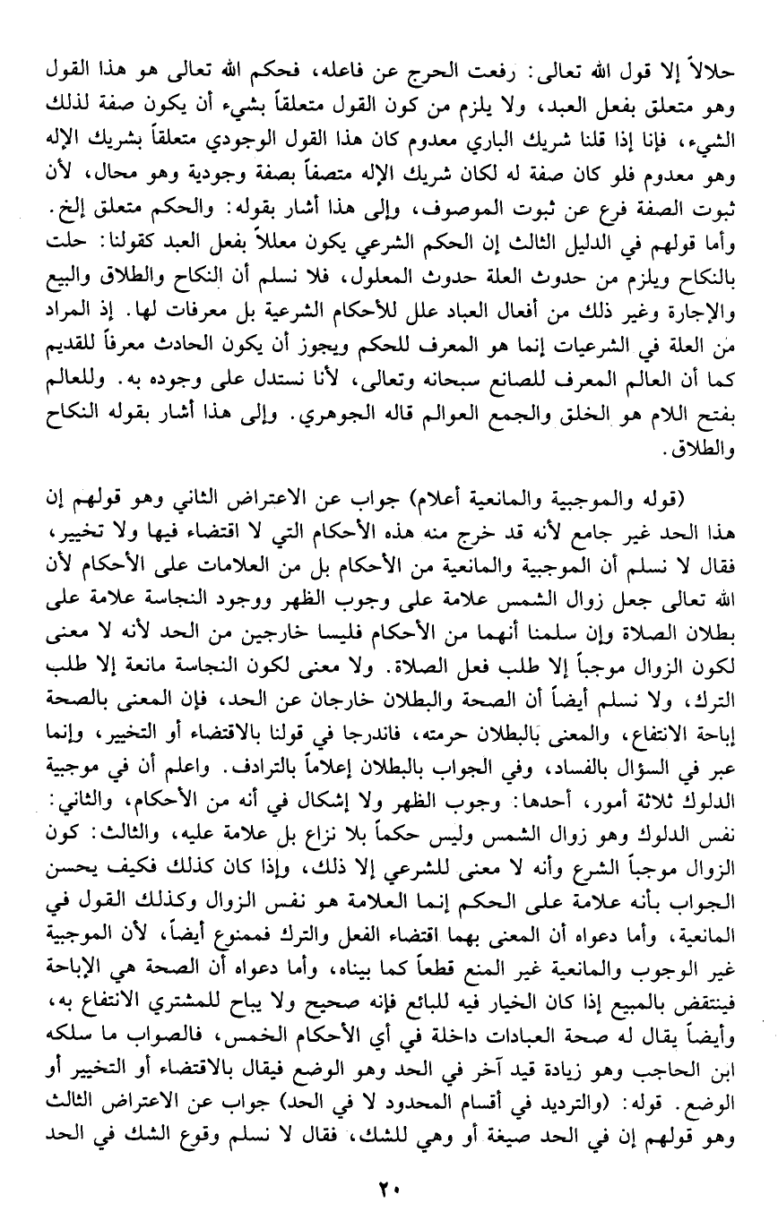 حلالا إلا قول الله تعالى: رفعت الحرج عن فاعله، فحكم الله تعالى هو هذا القول وهو متعلق بفعل العبد, ولا يلزم من كون القول متعلقا بشيء أن يكون صفة لذلك الشيء، فإنا إذا قلنا: شريك البارئ معدوم كان هذا القول الوجودي متعلقا بشريك الإله وهو معدوم فلو كان صفة له لكان شريك الإله متصفا بصفة وجودية وهو محال؛ لأن ثبوت الصفة فرع عن ثبوت الموصوف، وإلى هذا أشار بقوله: والحكم متعلق ... إلخ. وأما قولهم في الدليل الثالث: إن الحكم الشرعي يكون معللا بفعل العبد كقولنا: حلت بالنكاح ويلزم من حدوث العلة حدوث المعلول، فلا نسلم أن النكاح والطلاق والبيع والإجارة وغير ذلك من أفعال العباد علل للأحكام الشرعية بل معرفات لها, إذ المراد من العلة في الشرعيات إنما هو المعرف للحكم، ويجوز أن يكون الحادث معرفا للقديم كما أن العالم المعروف للصانع سبحانه وتعالى؛ لأنا نستدل على وجوده به، وللعالم بفتح اللام وهو الخلق والجمع: العوالم قاله الجوهري, وإلى هذا أشار بقوله: النكاح والطلاق.